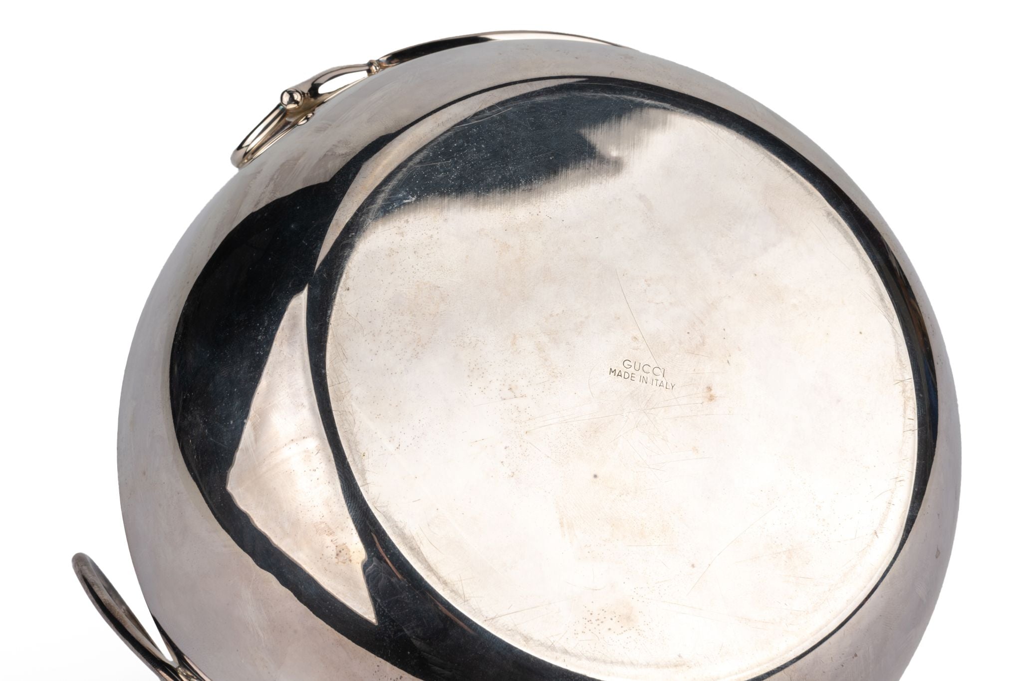 Gucci rare and collectible punch serving set. One large bowl, 5 cups and one ladle . Stirrup design is on all the pieces of the set, showing the signature Gucci design. The 5 bowls measure 4.25" diameter and 2.25" height. The big bowl is 7.5" diameter and 7.5" height.
