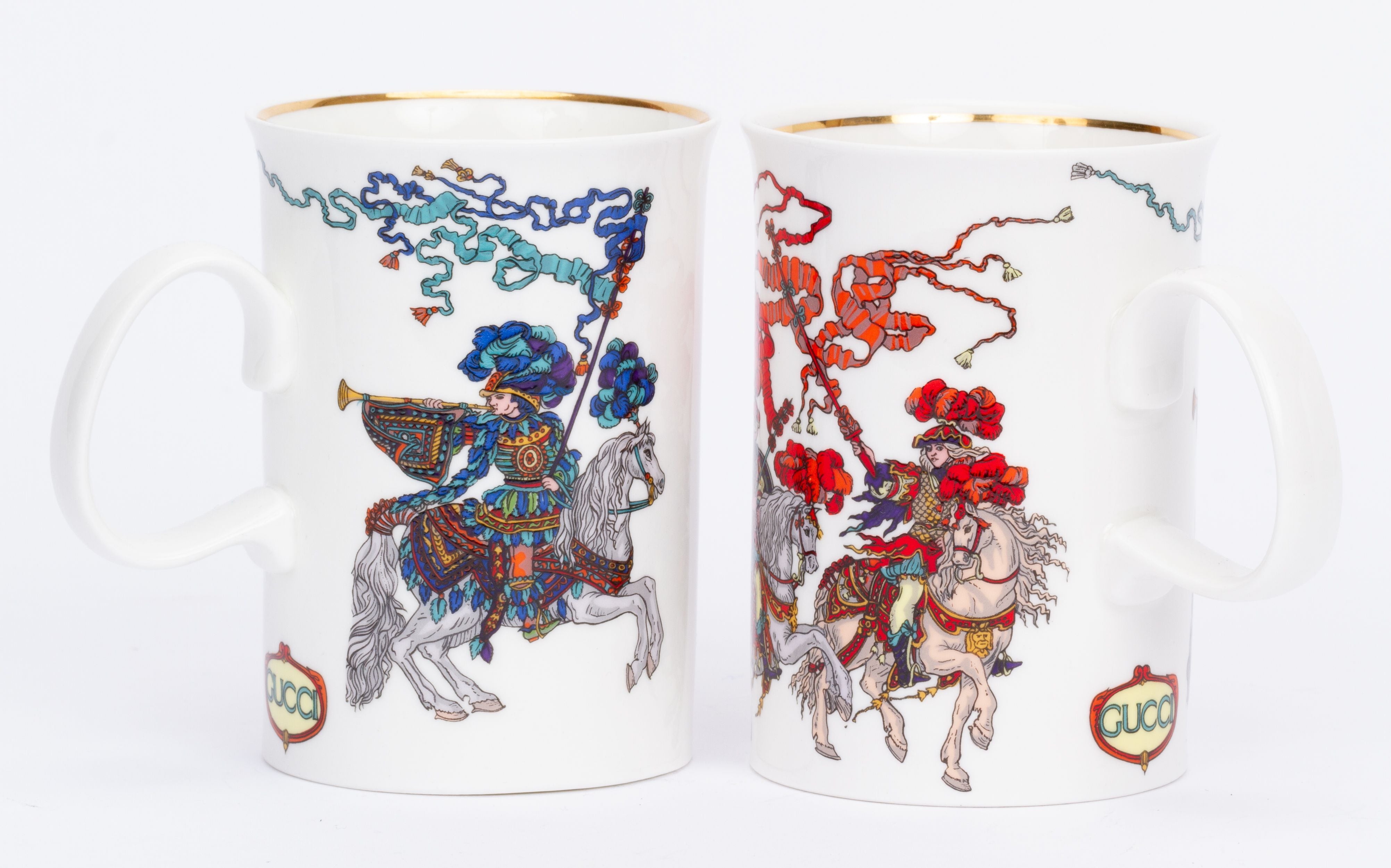 Gucci set of 2 porcelain knights tea cups, red and blue. Excellent condition.