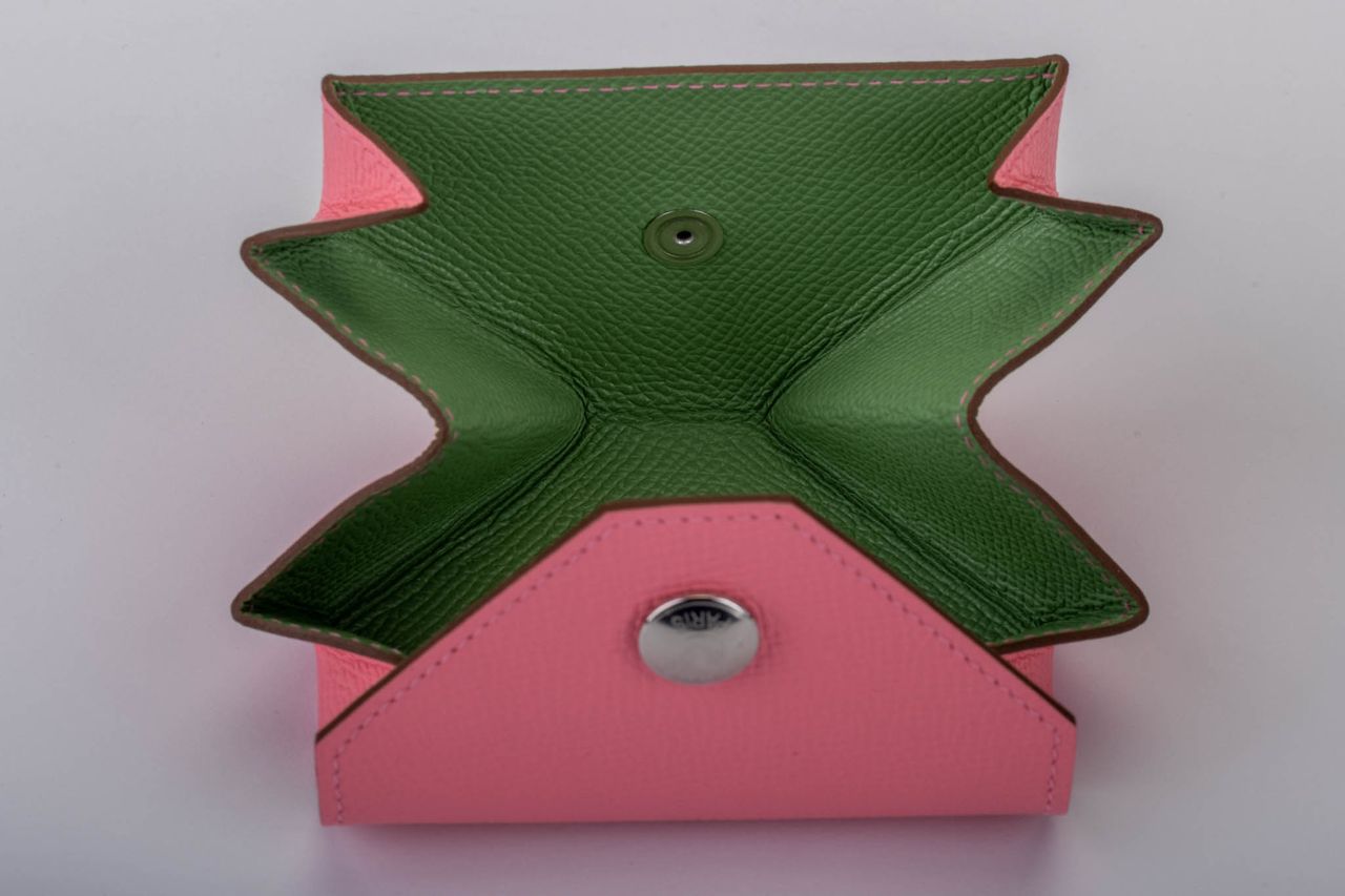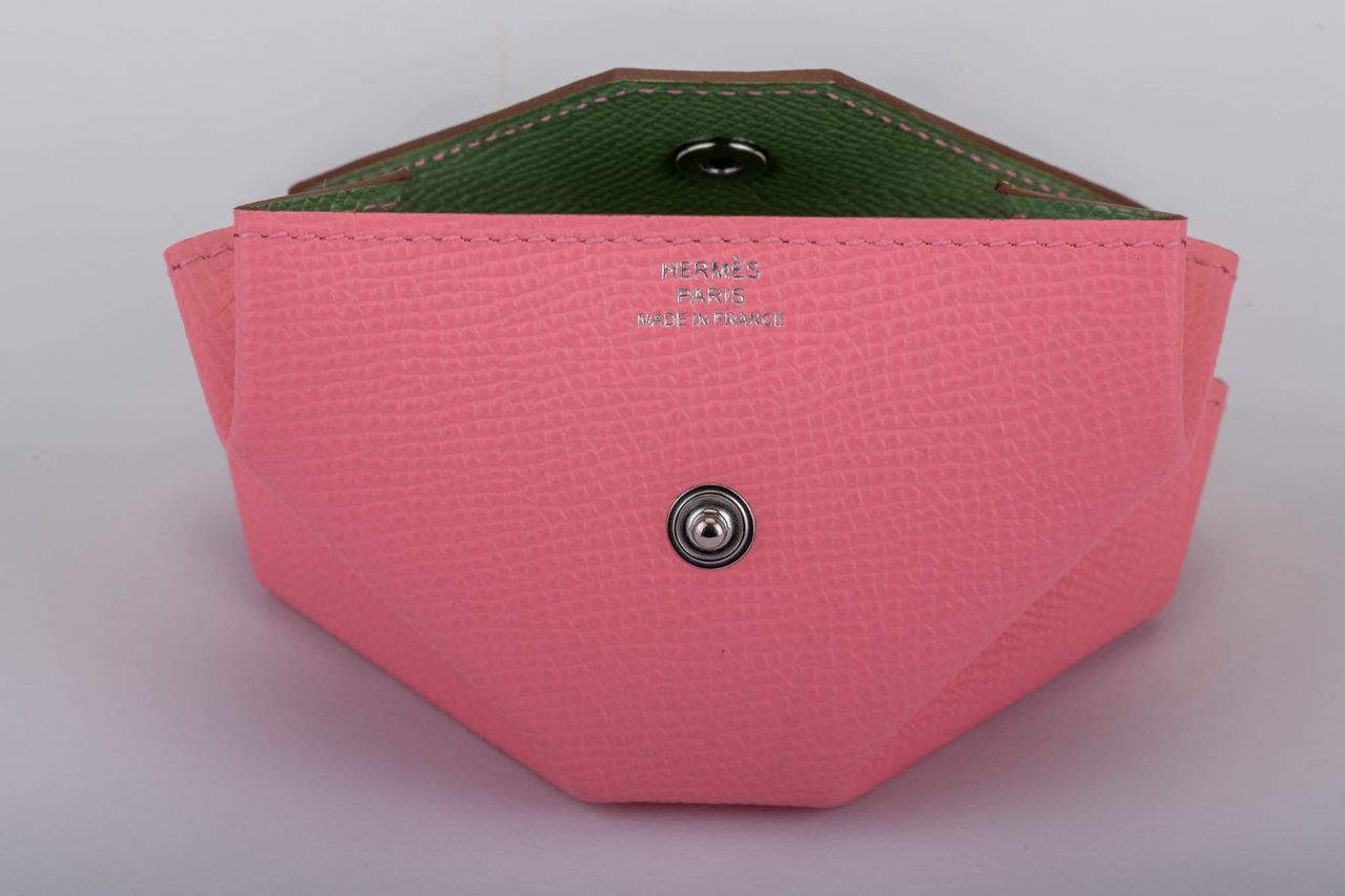Hermes brand new in box verso coin case in epsom leather and palladium hardware. Pink and green combination. Comes with original box and ribbon.