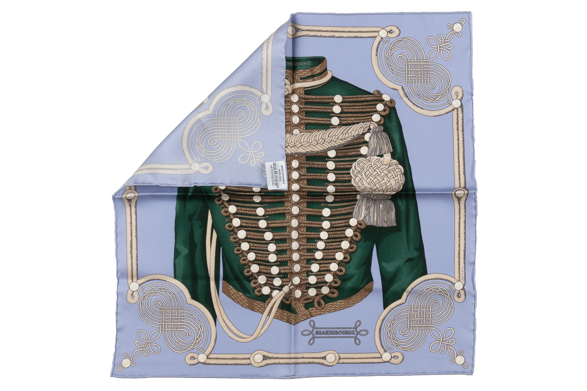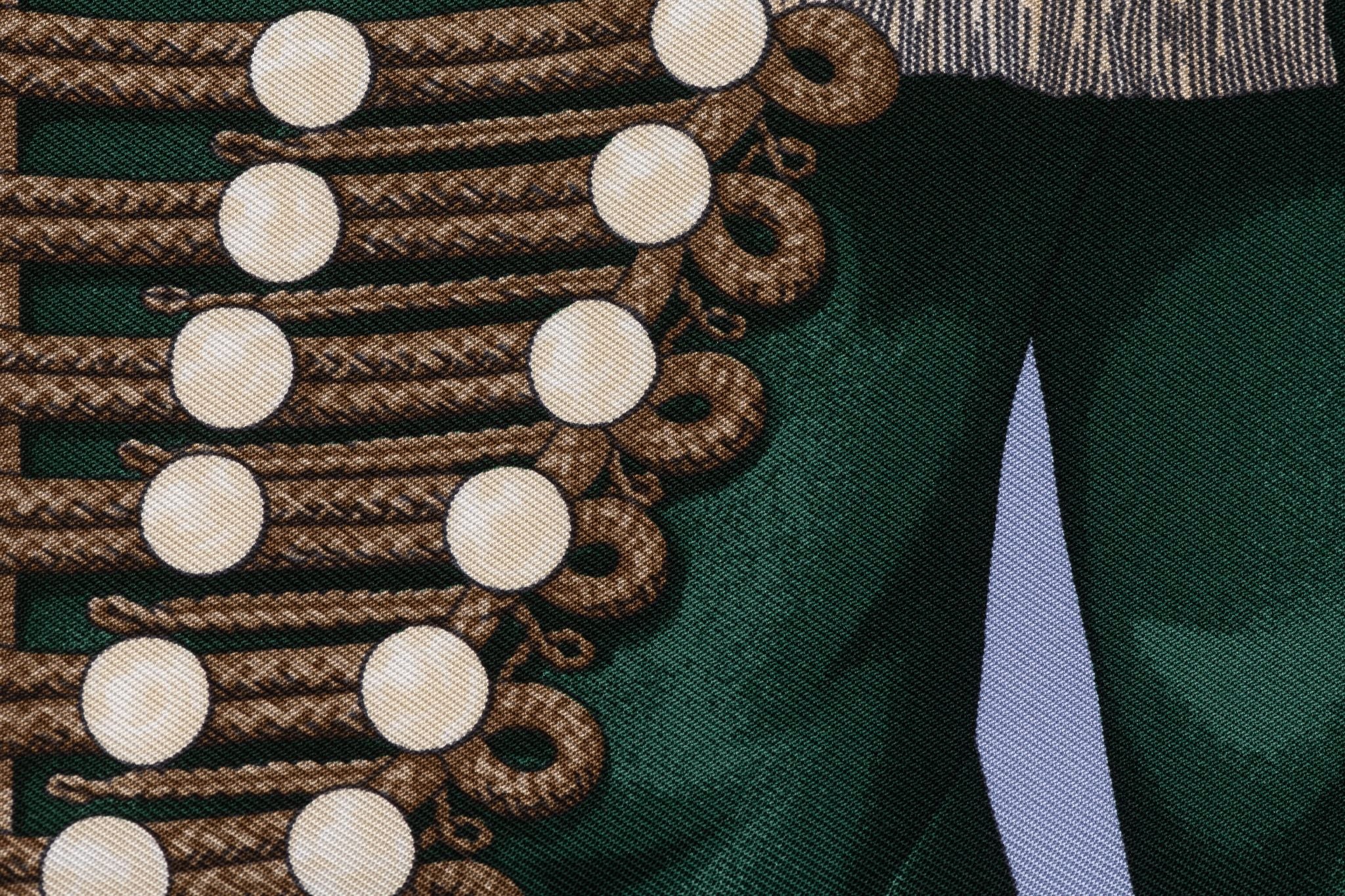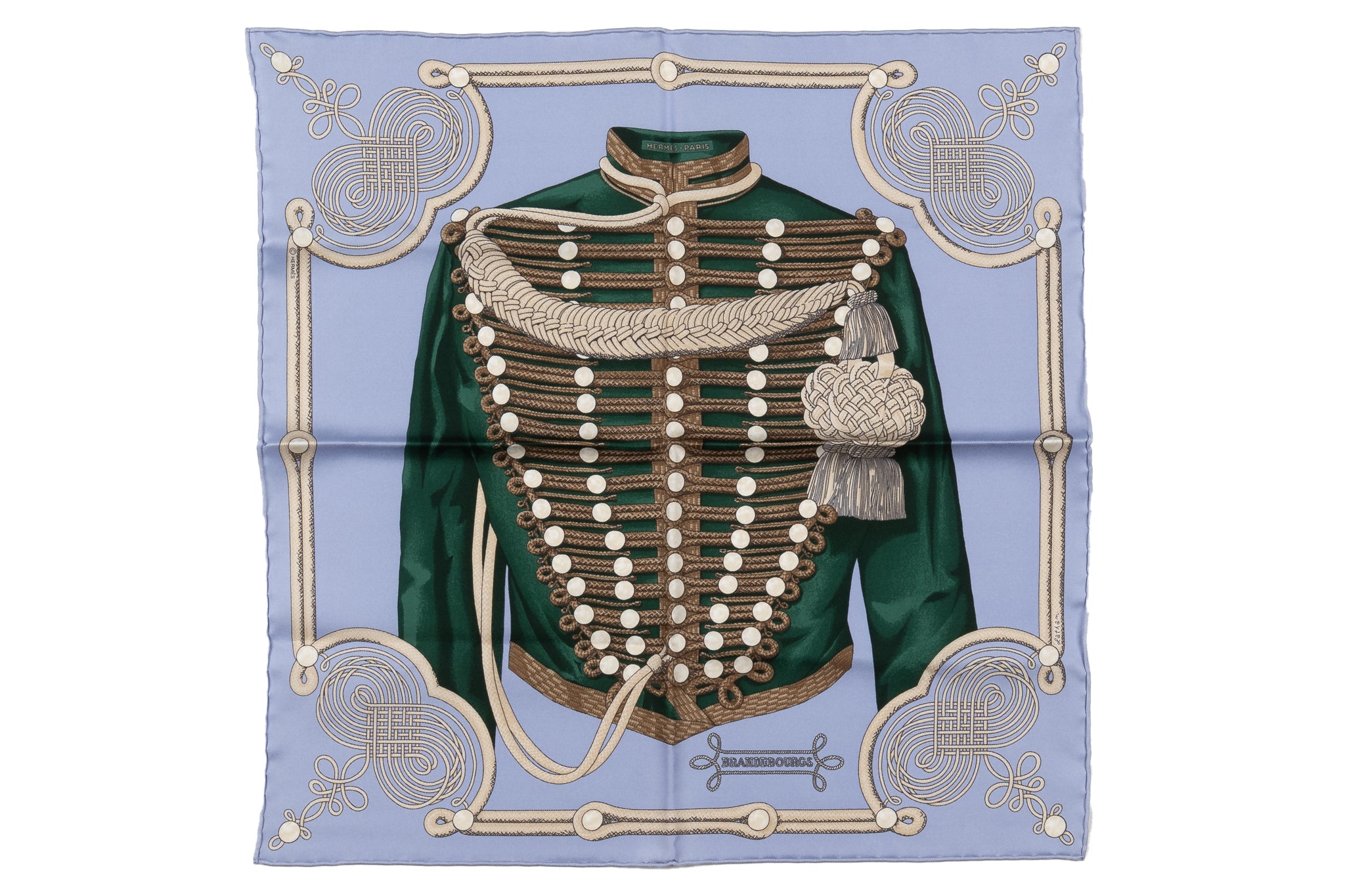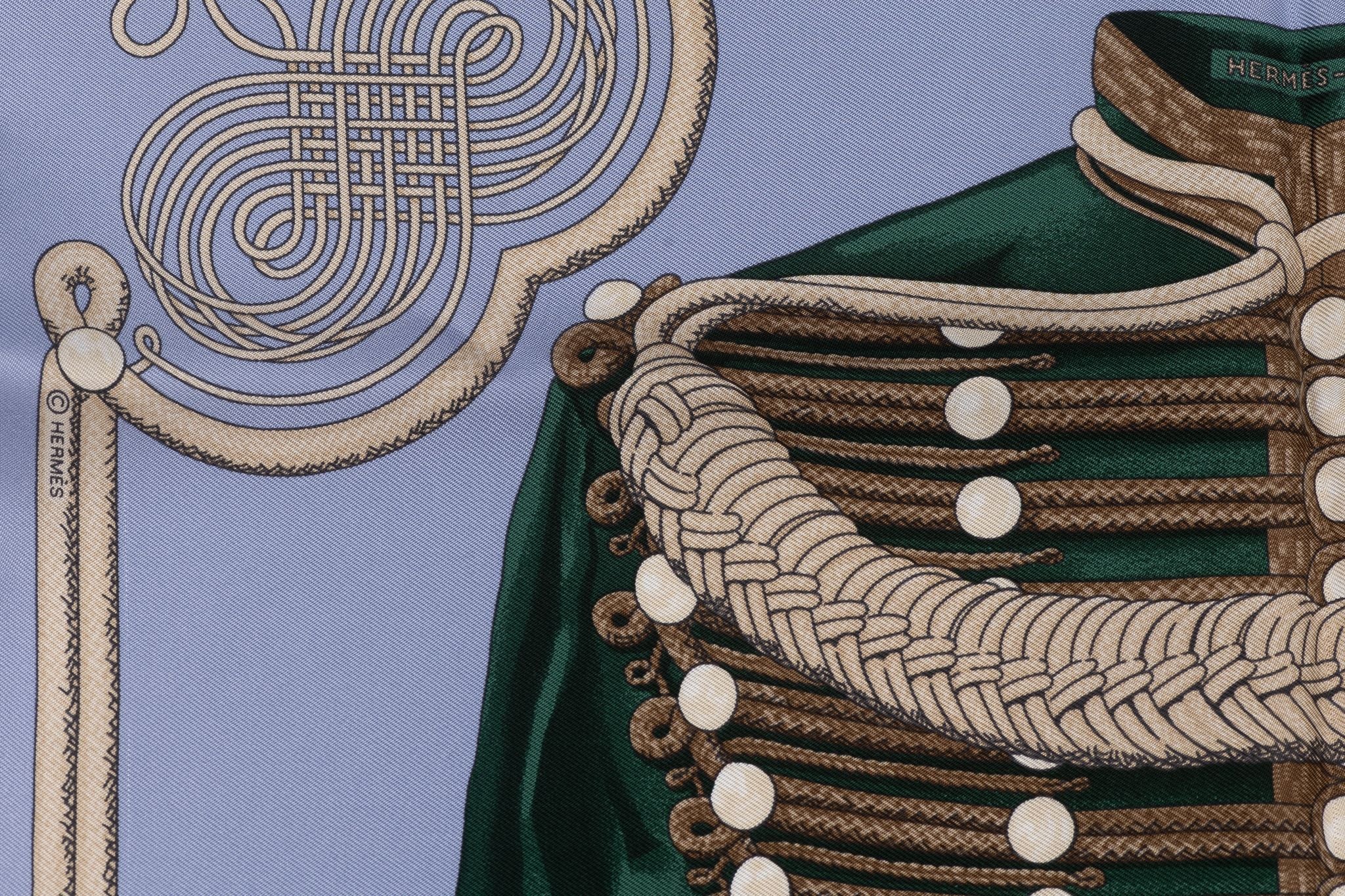 Hermes "Brandebourg" gavroche Scarf made from 100% silk and designed by Caty Latham, inspired by an album from the Emile Hermès collection. New without box.