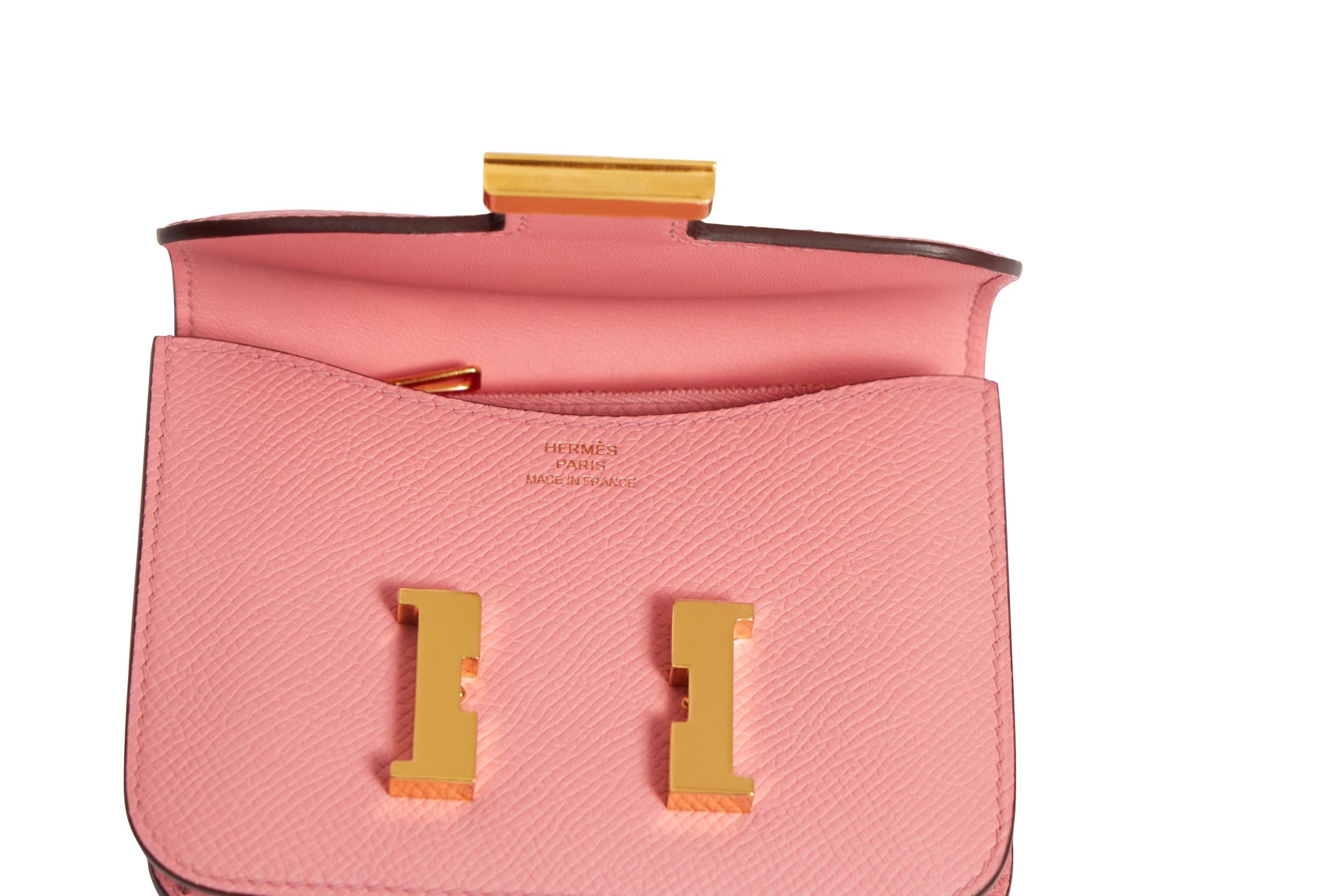 Hermes Epsom Constance mini pink leather pochette with a detachable card case inside. Gold metale hardware and H logo Removable and adjustable pink azalee leather belt with gold metal H logo buckle. Comes with original box and dust cover and ribbon Belt comes with original dust cover Dimensions belt: L 37" x H 0.50"