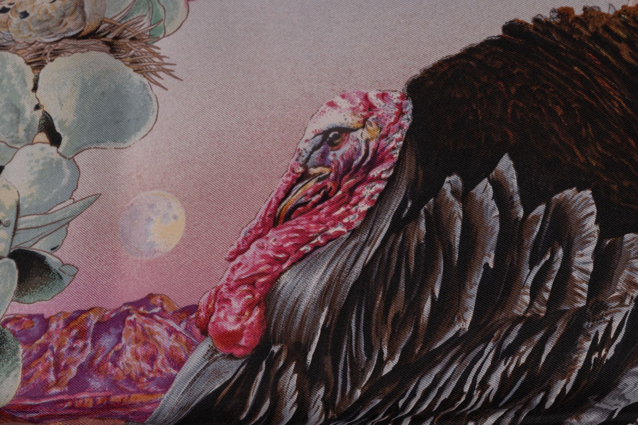 This Hermès "Faune et Flore du Texas" Scarf, designed by Kermit Oliver,1992. Depicting the local flora and fauna of Texas, which surrounds a large central turkey. Hand-rolled edges.
