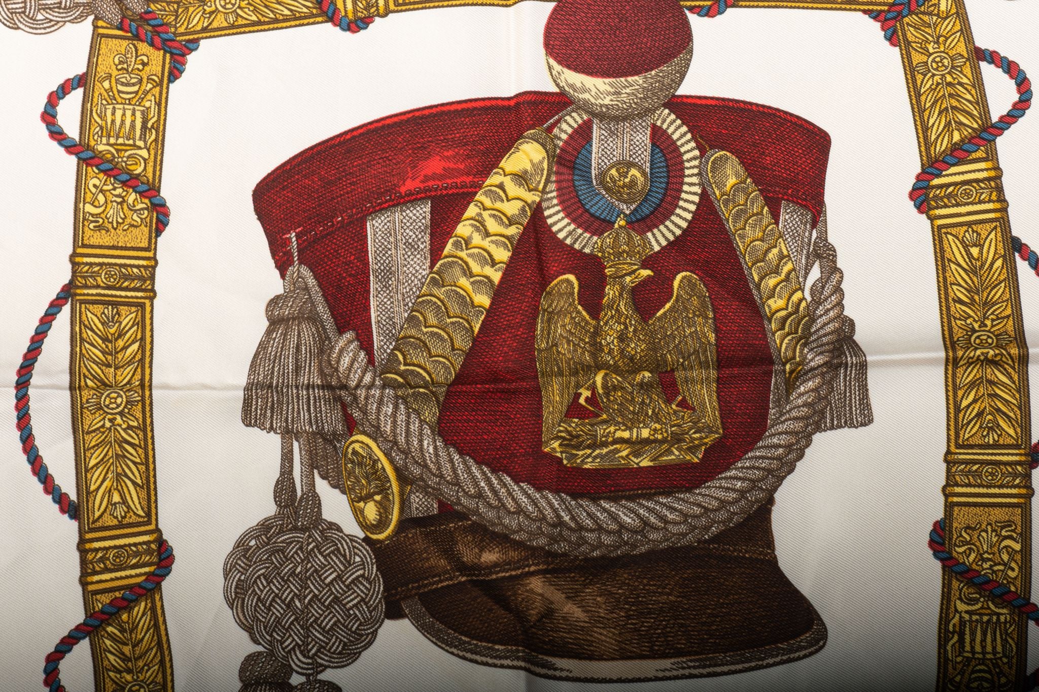 Hermès vibrant red Grand Uniforme silk twill scarf designed by coveted designer Metz. Depicts military head wear and swords. Hand-rolled edges. Does not include box. Minor wear. No care tag.