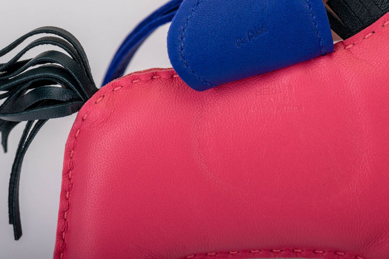 Hermès rare grigri rodeo collection charm in GM size. Rose azalee, vert vertigo, electric blue leather. Comes with original box and ribbon.