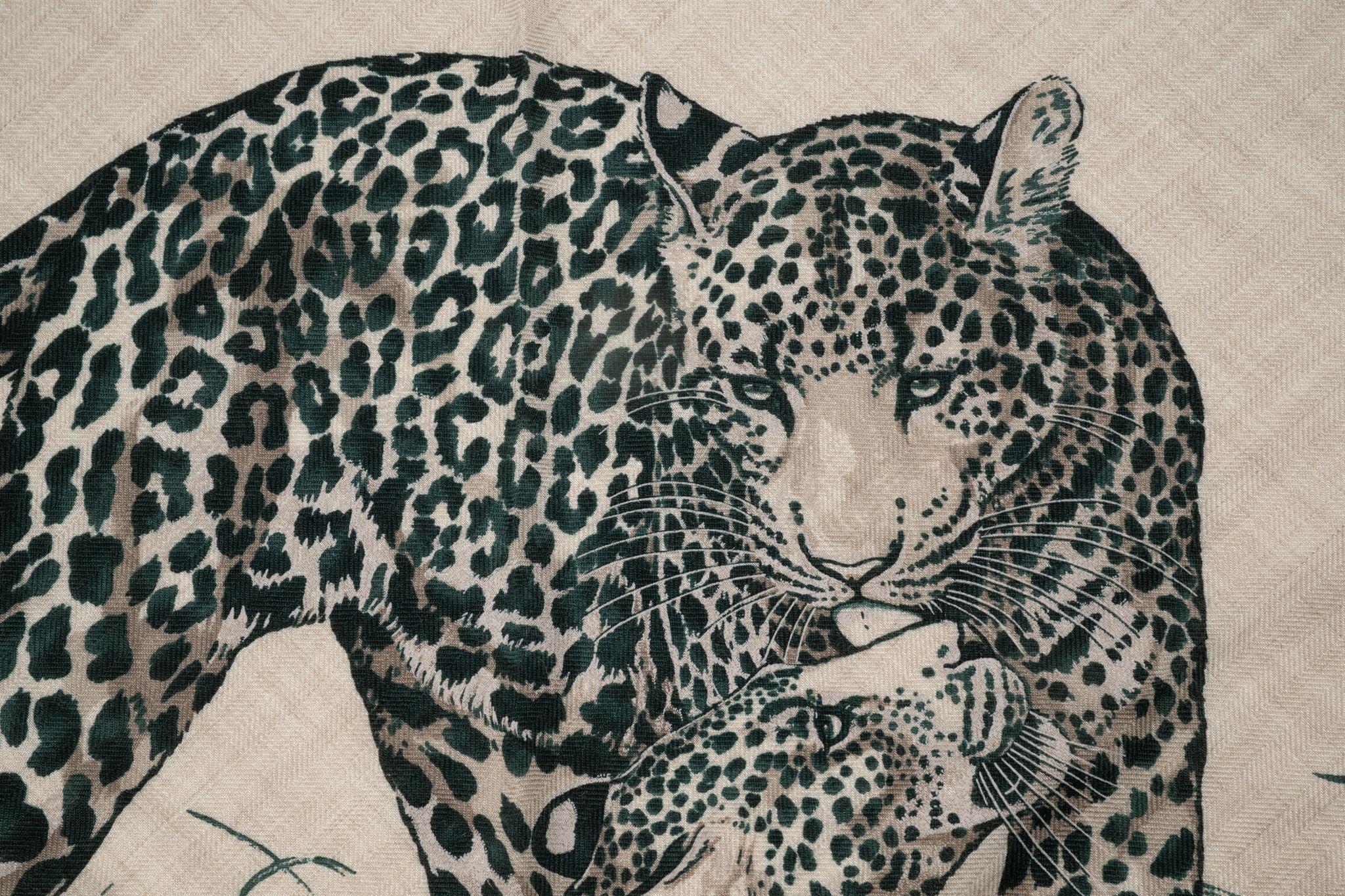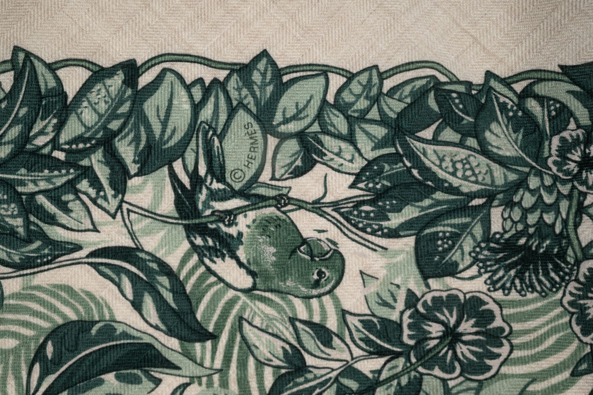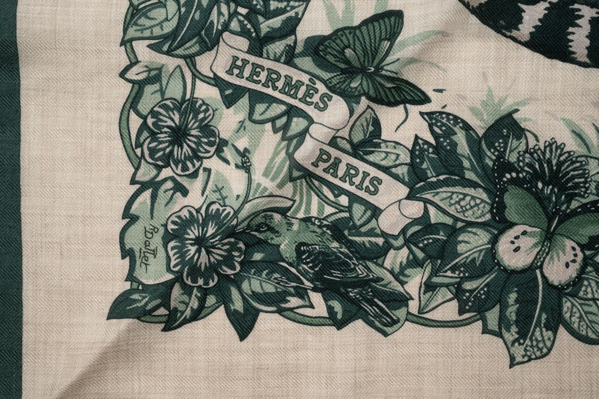 Hermès "Jungle Love" giant triangle in cashmere and silk with hand-rolled edges (70% cashmere, 30% silk). Designed by Robert Dallet Comes with ribbon and original box.