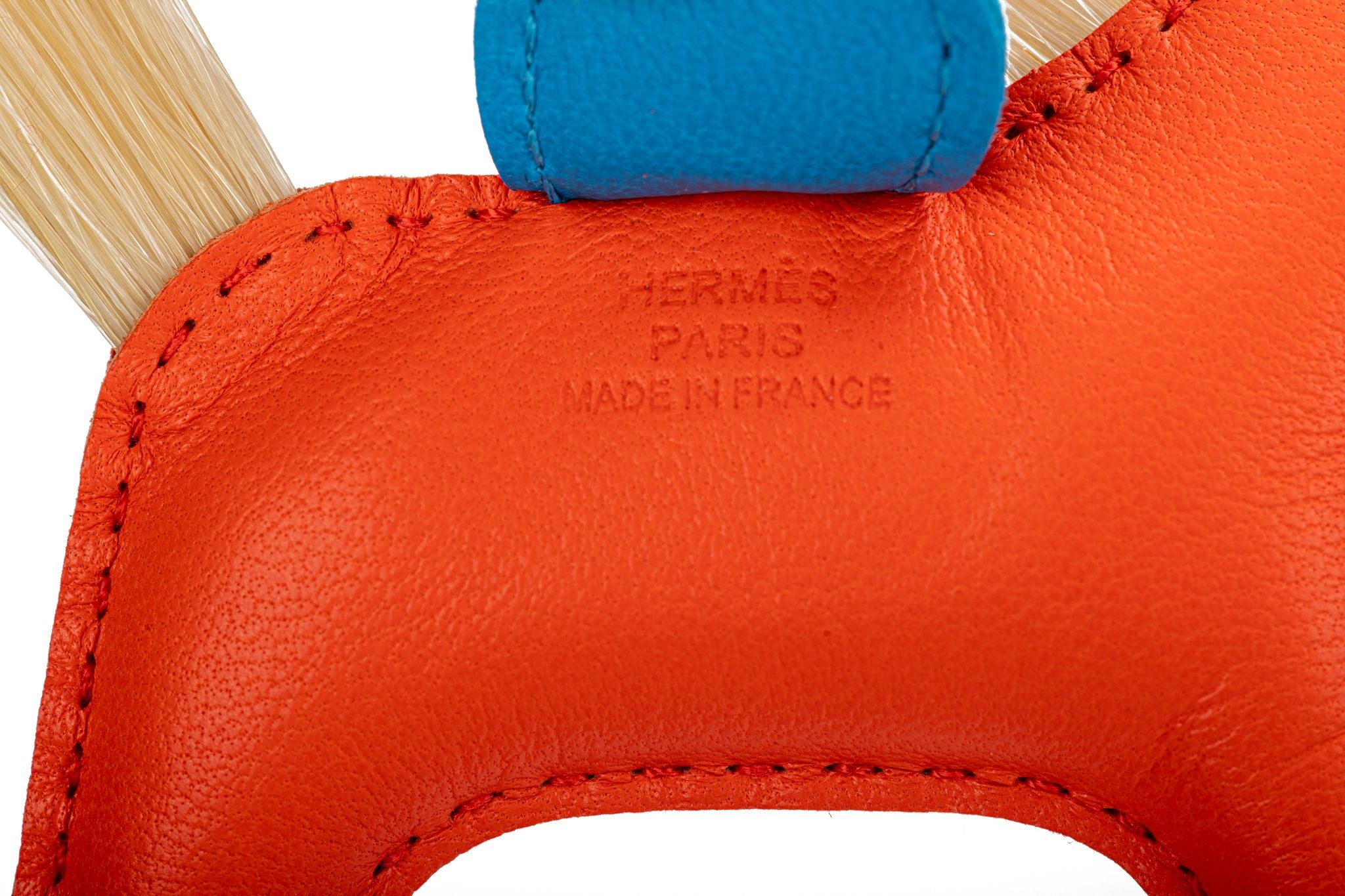 Hermès very rare and sold out grigri rodeo charm small. Combination of orange poppy, blue zanzibar, rose azalee. Real horsehair Drop 7". Comes with original box and ribbon.