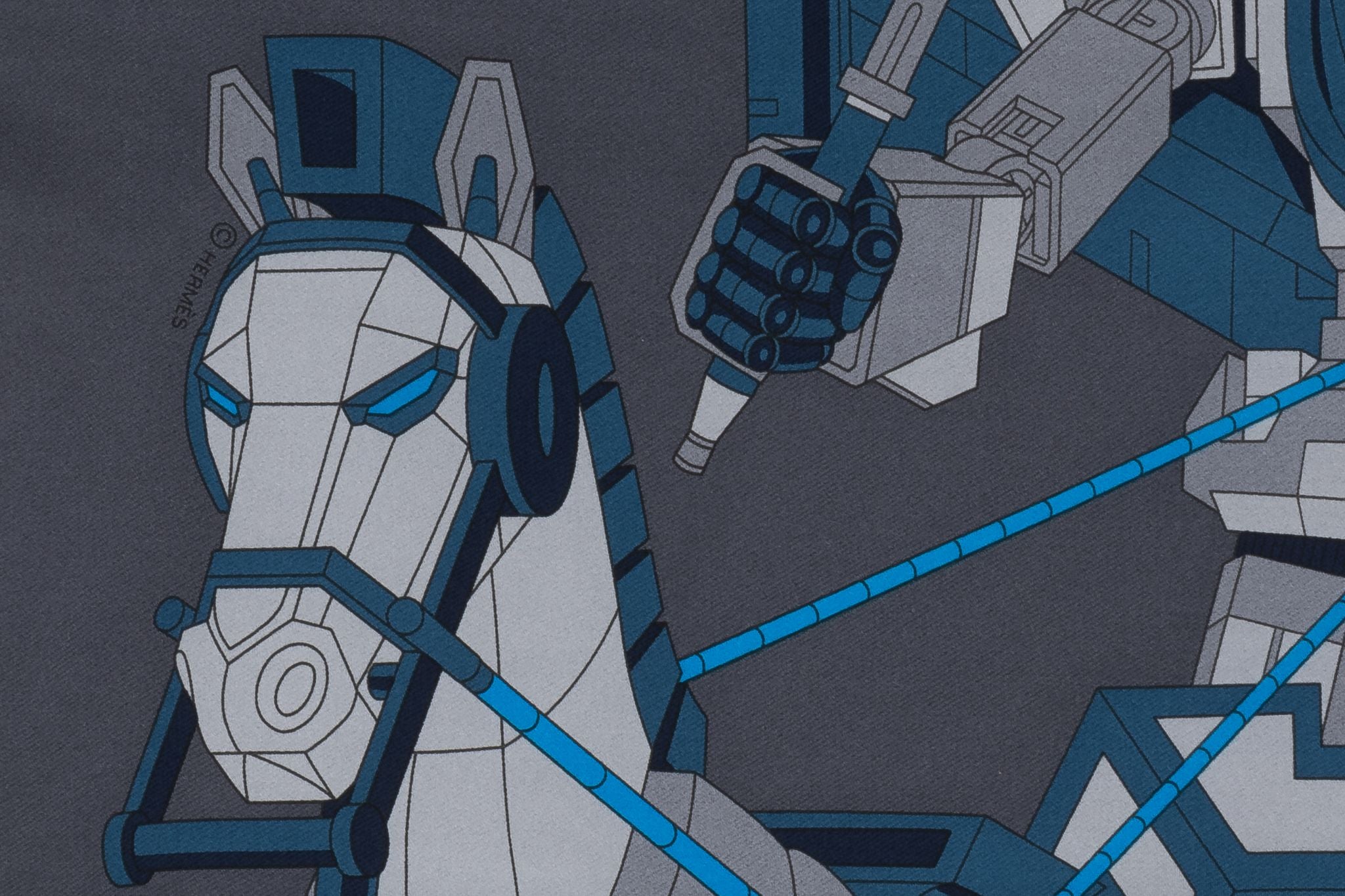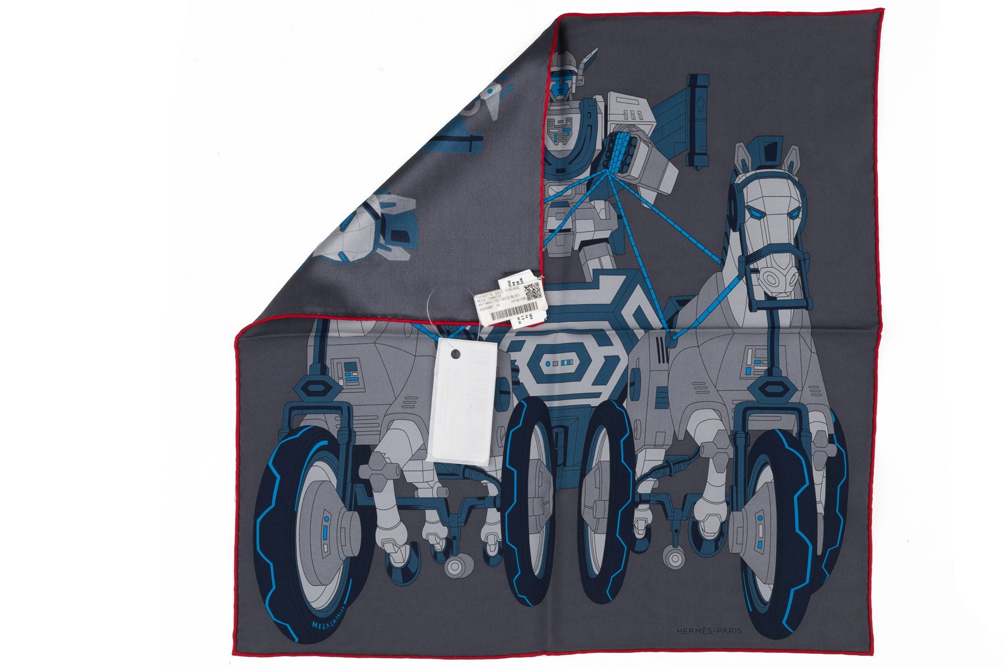 Hermès Mega Chariot by Daisuke Nomura Scarf. Nomura was inspired by a children's horse tricycle from the Emile Hermes collection. He shows the god Hermes who is said to have taken Apollo's chariot without permission. Transformed into a robot, the tricycle hurtles towards Mount Olympus, home of the Greek gods. The piece comes with the original box.