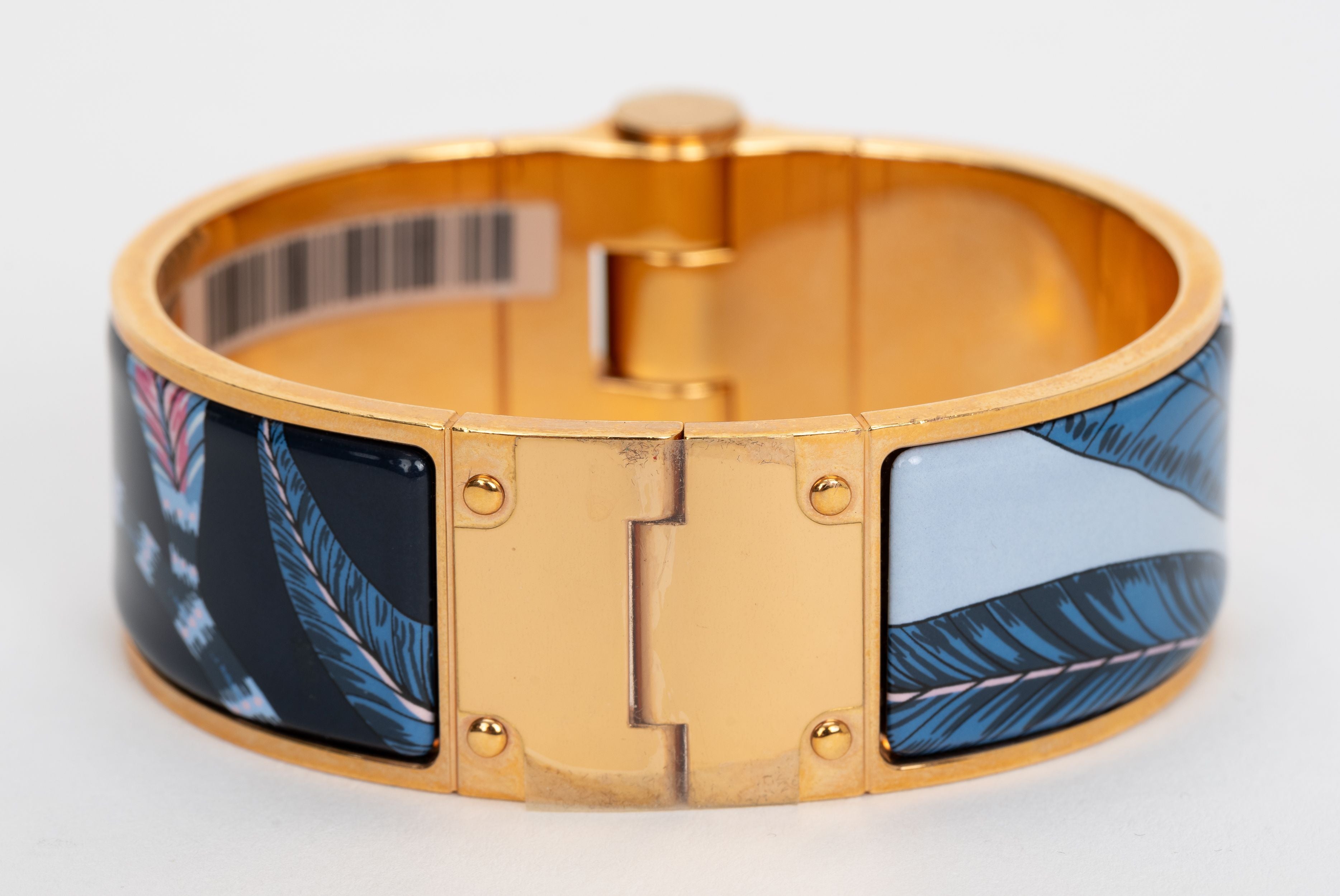 The Hermes Rose Gold Plated Savana Dance Enamel Hinged Bangle Bracelet features a floral and leaf motif of pastel colors. Size PM. Interior circumference 7.5". Brand new with sticker and velvet pouch .