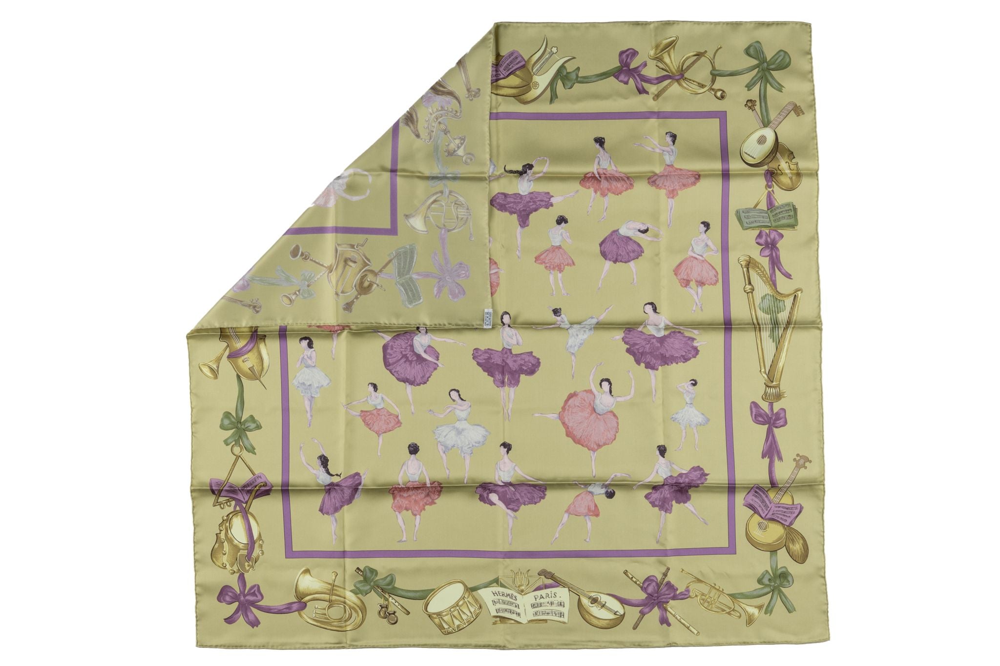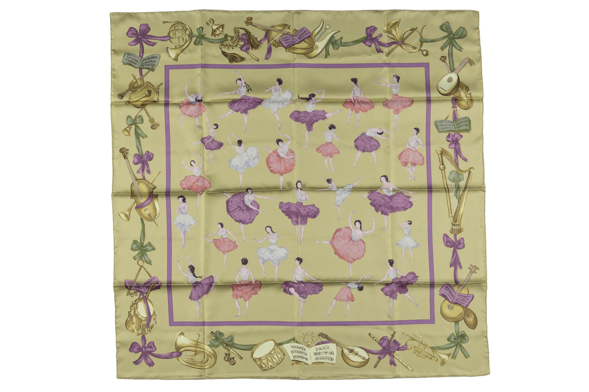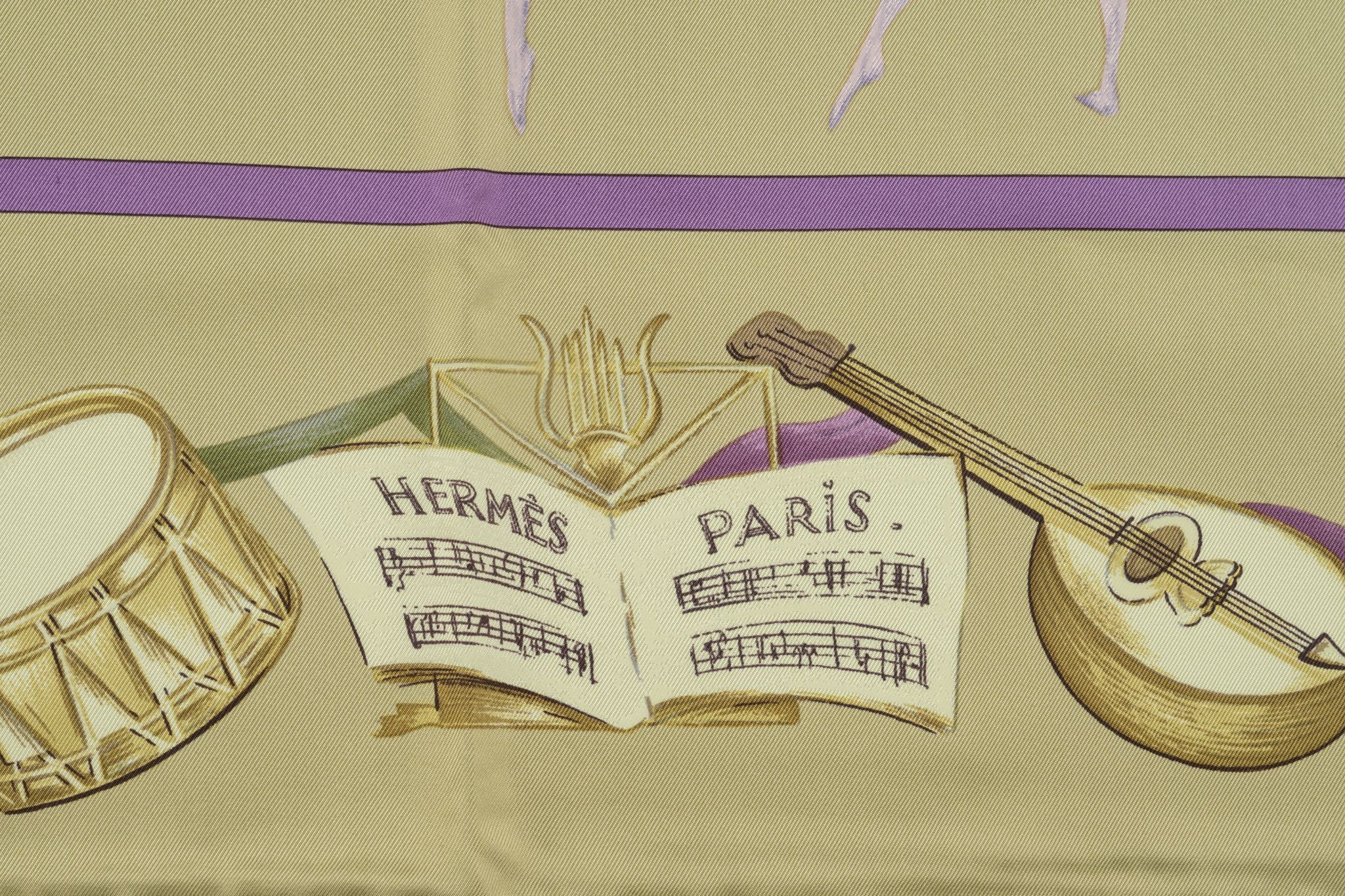 This Hermés "La Danse” in yellow by Jean-Louis Clerc is 100% silk and features hand-rolled edges. New collection, collectible subject.
