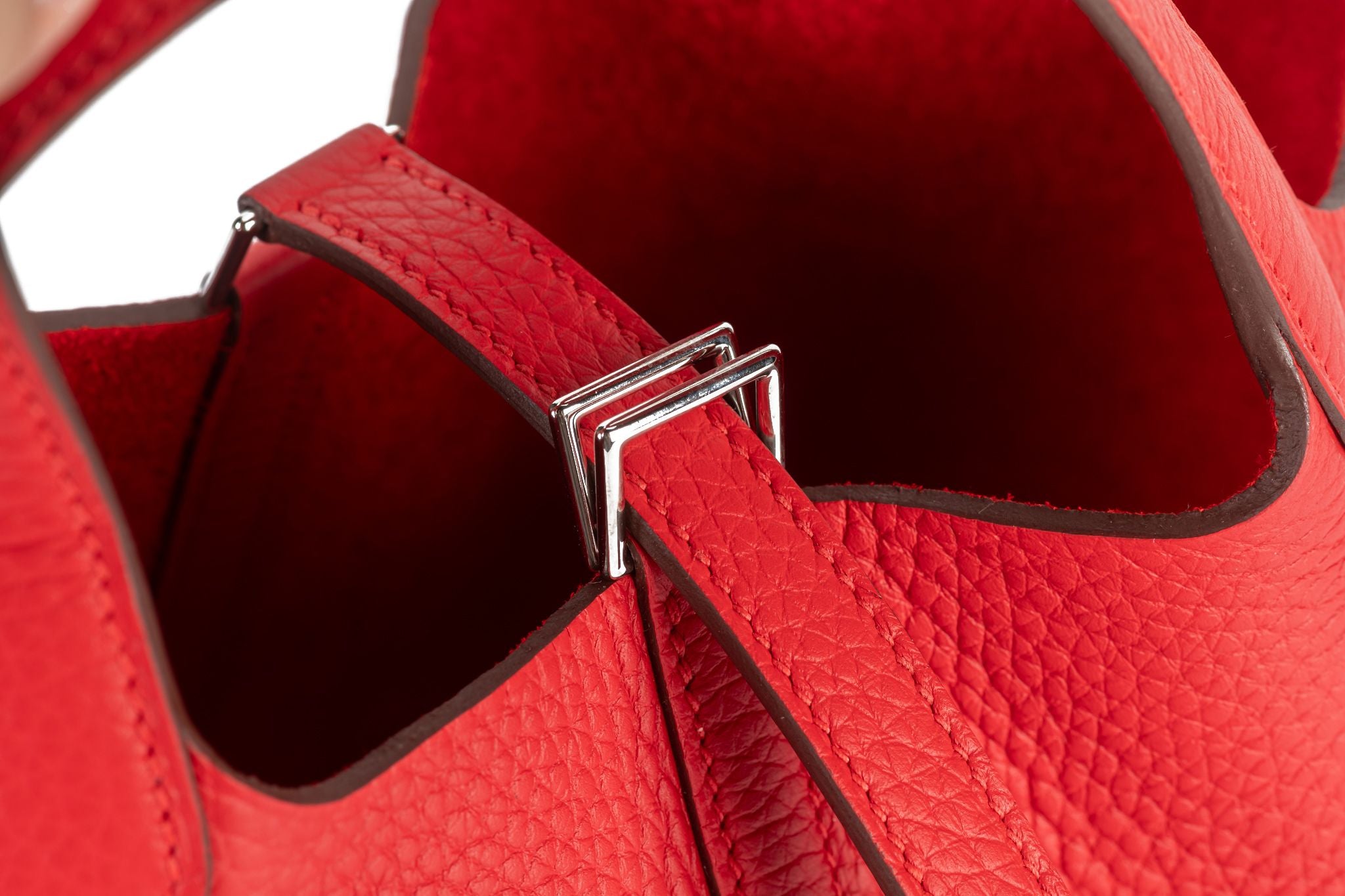 This Hermès Picotin Lock tote features Clemence calfskin leather in red. This handbag features a leather top handles and a closure strap that can be secured by a gold padlock. This opens to a spacious red suede interior. First letter W for 2025. Comes with booklet, original dust bag and box. Brand new in unused condition.