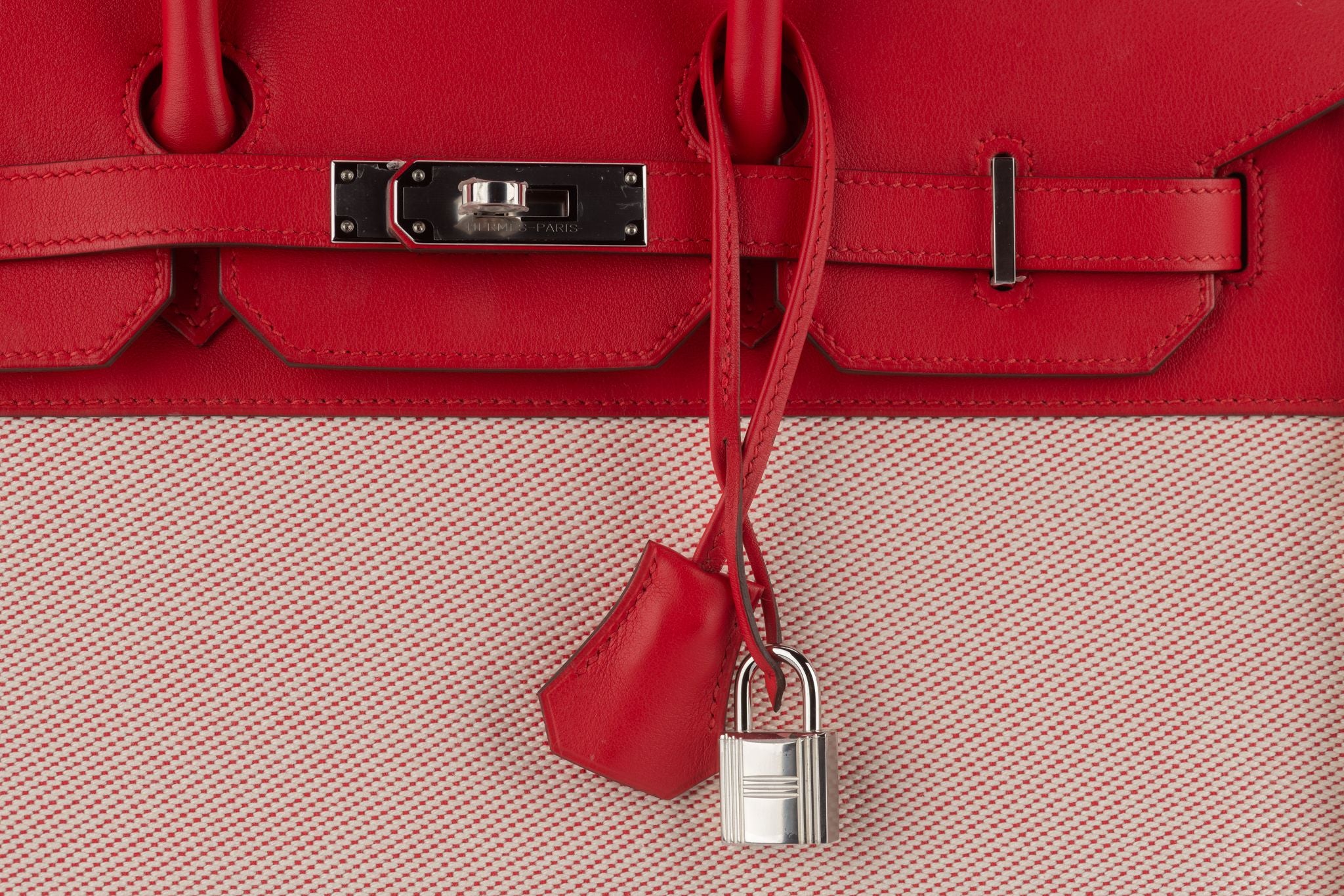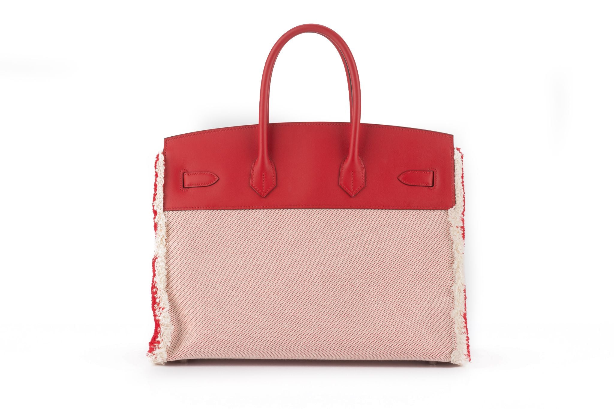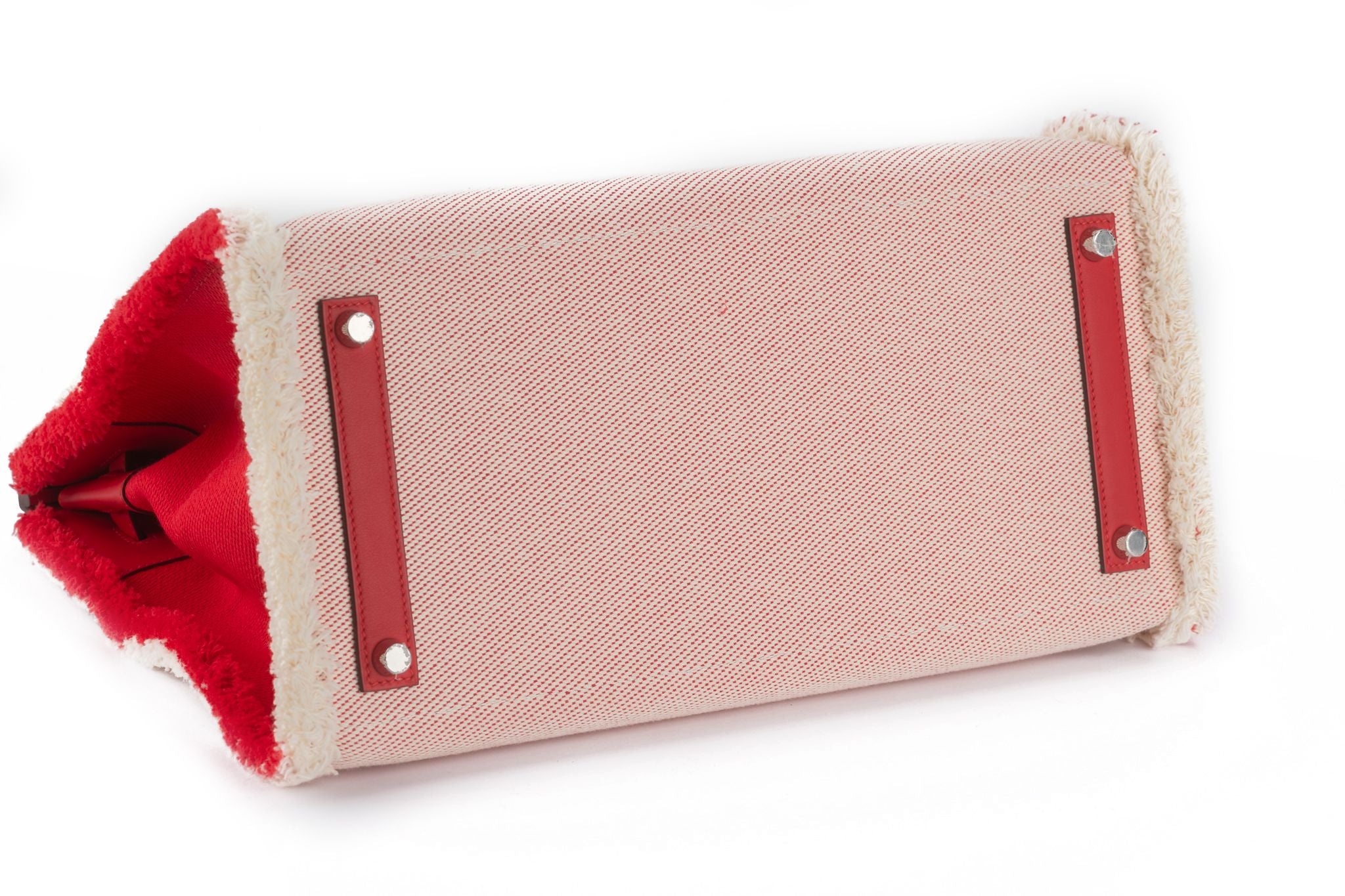 This Hermès Swift Twill H Fray Fray Birkin 35 is crafted of white and dark pink canvas, with matching fringe and dark pink leather trim. The handbag features signature closure straps and turn lock palladium silver hardware and rolled top handles. The spacious interior has zipper and patch pockets. Comes with certificate of authenticity, booklet, felt, original dustcover and box. First letter Z for 2021.