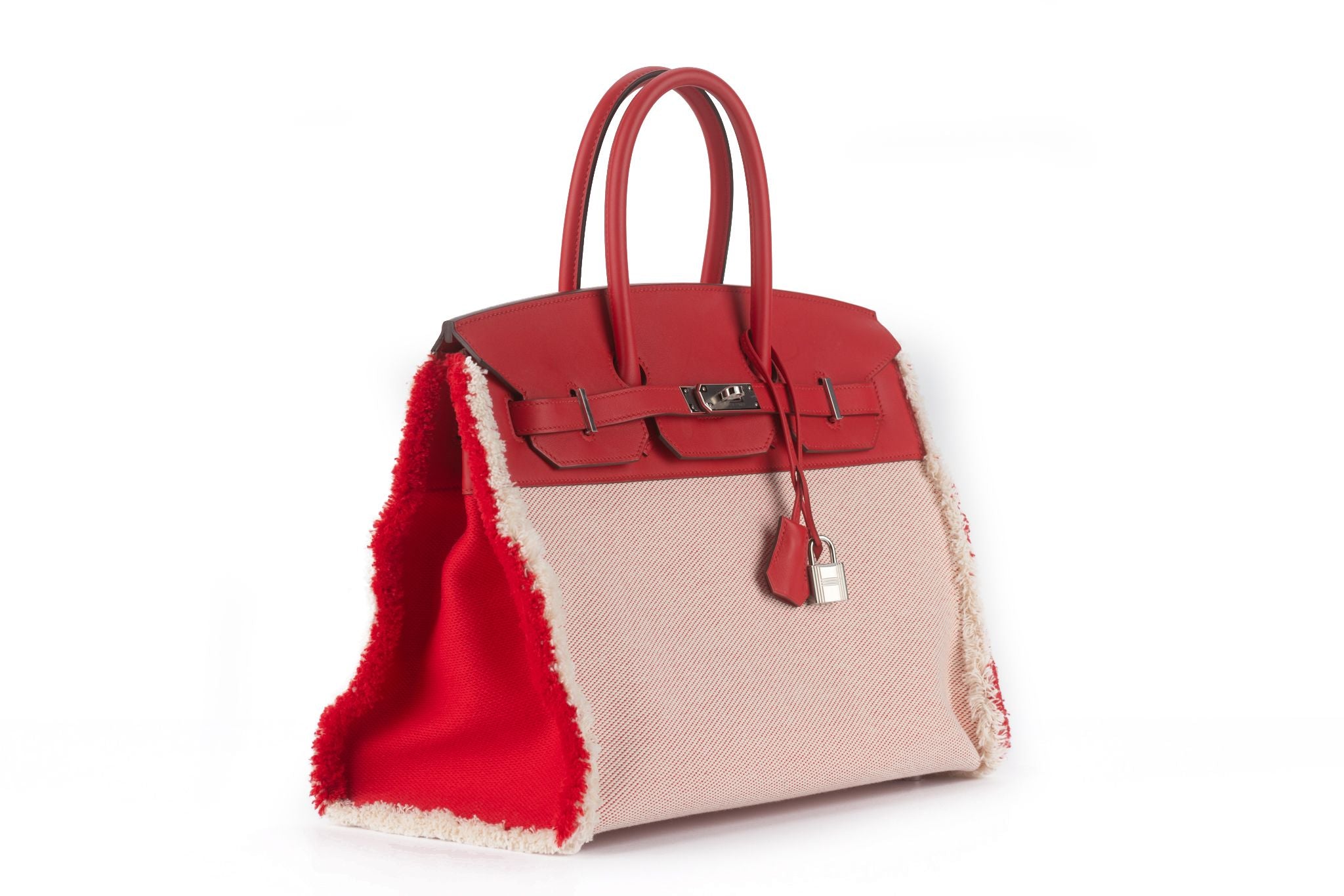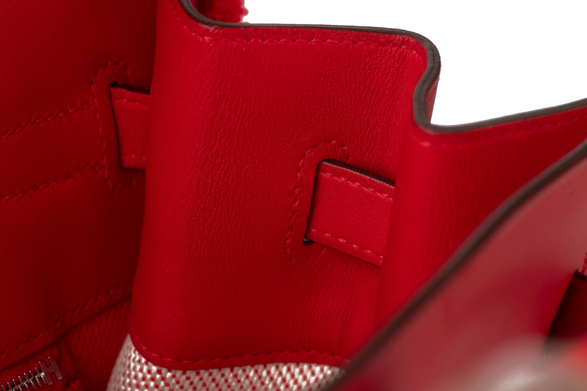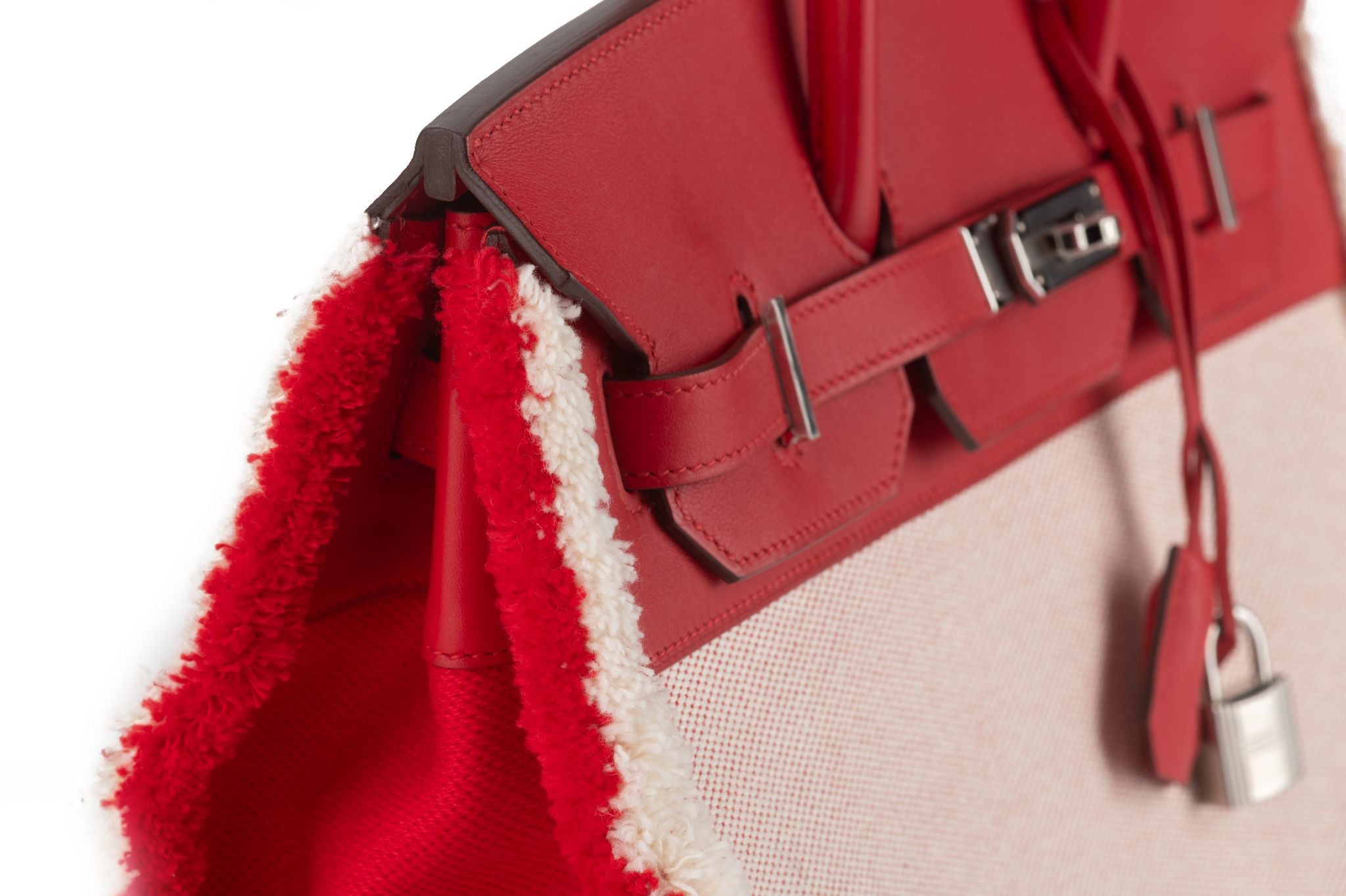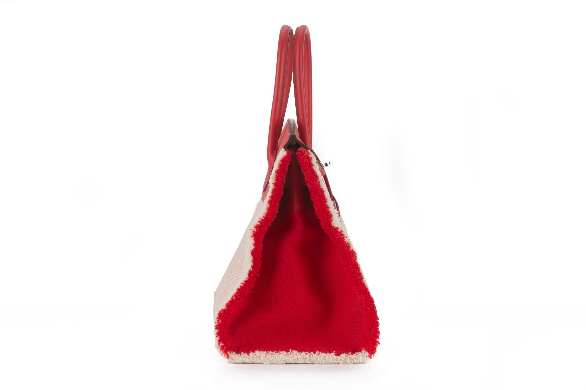 This Hermès Swift Twill H Fray Fray Birkin 35 is crafted of white and dark pink canvas, with matching fringe and dark pink leather trim. The handbag features signature closure straps and turn lock palladium silver hardware and rolled top handles. The spacious interior has zipper and patch pockets. Comes with certificate of authenticity, booklet, felt, original dustcover and box. First letter Z for 2021.