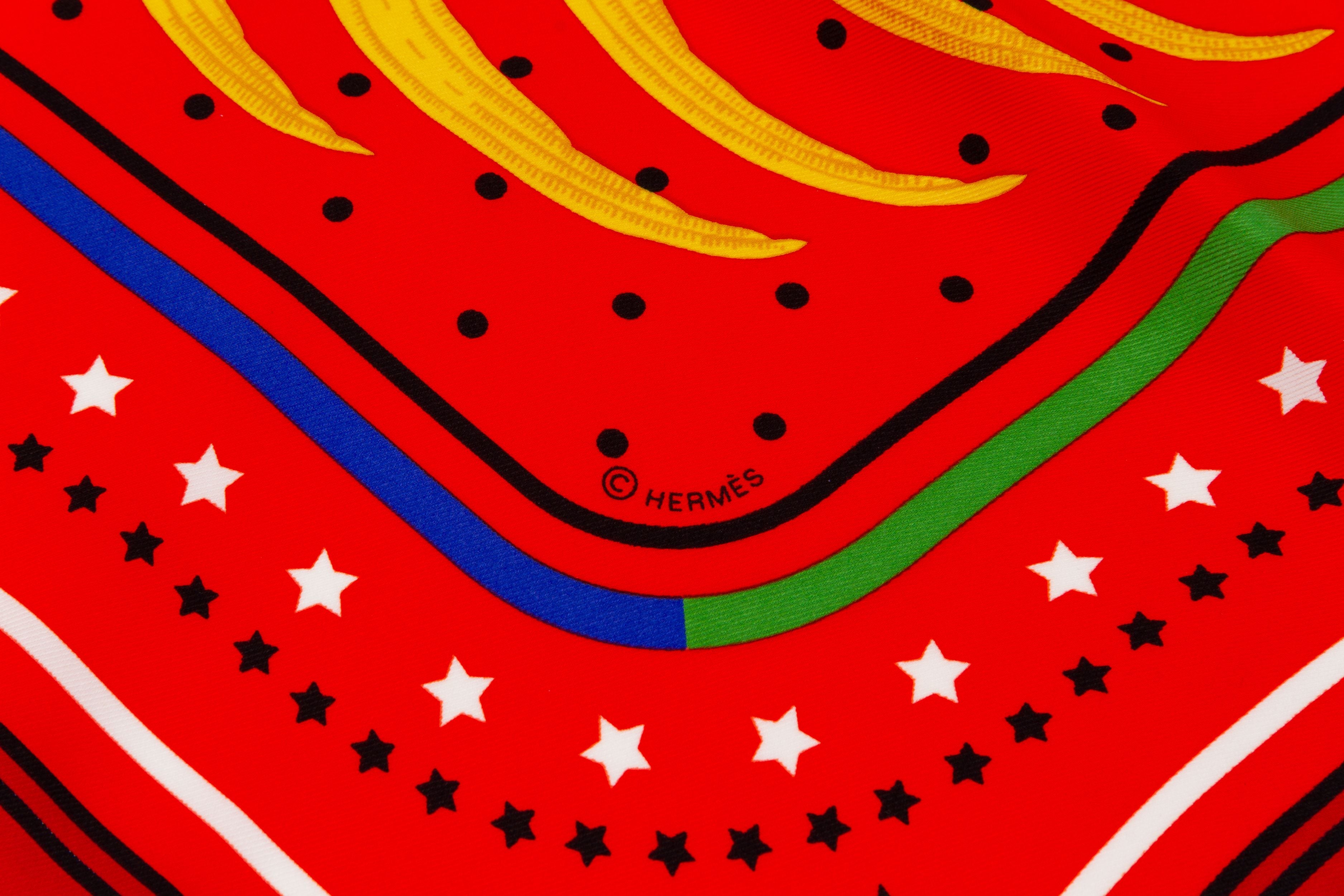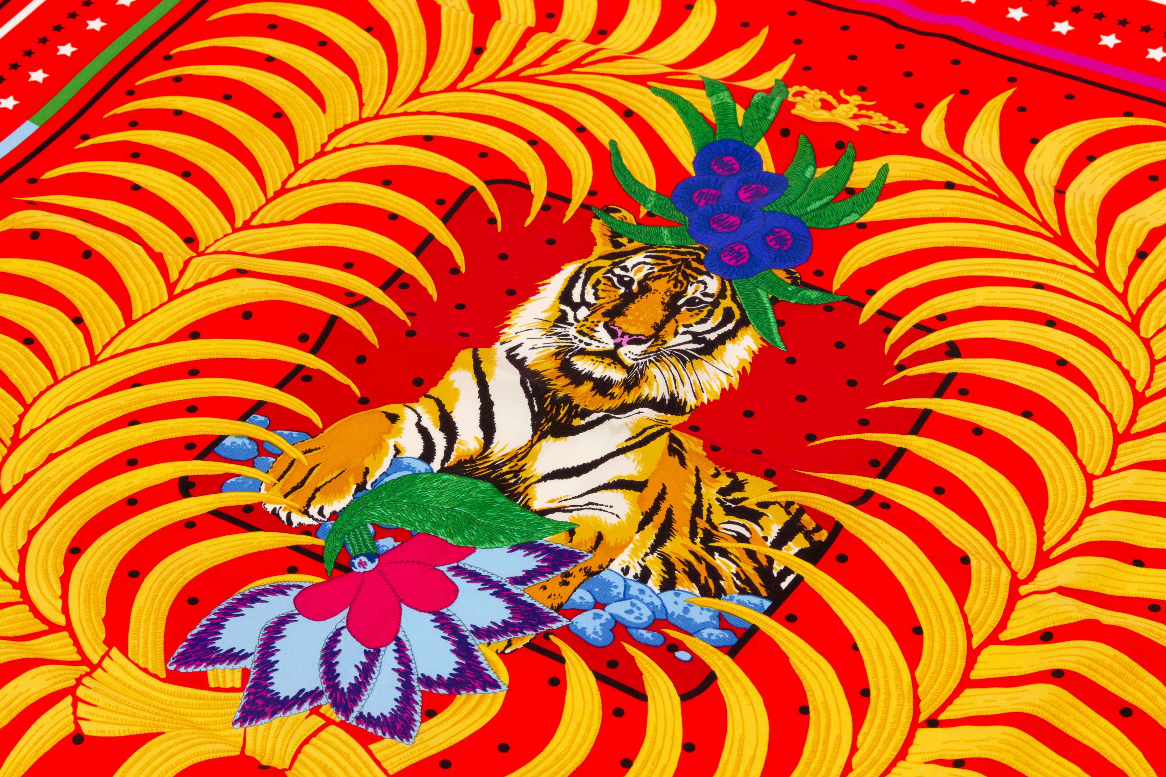New Hermès Tigre Royal Fleuri Scarf. The piece is made out of 100 percent silk and comes with the original box. The print shows a royal tiger who is crowned by some flowers over his head.