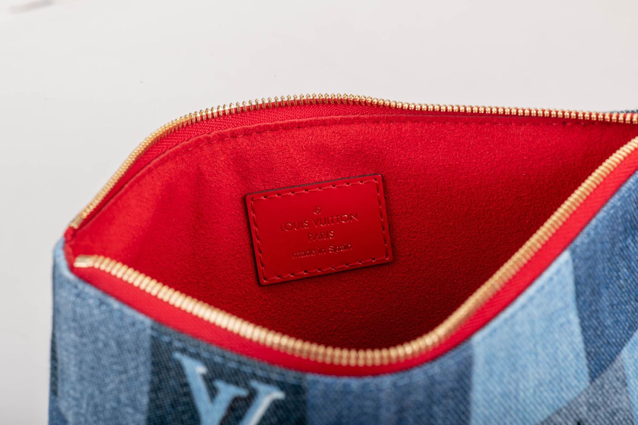 Rare Louis Vuitton limited edition denim pouchette with red leather details. Detachable handle. Comes with booklet, dust cover, original box and ribbon.