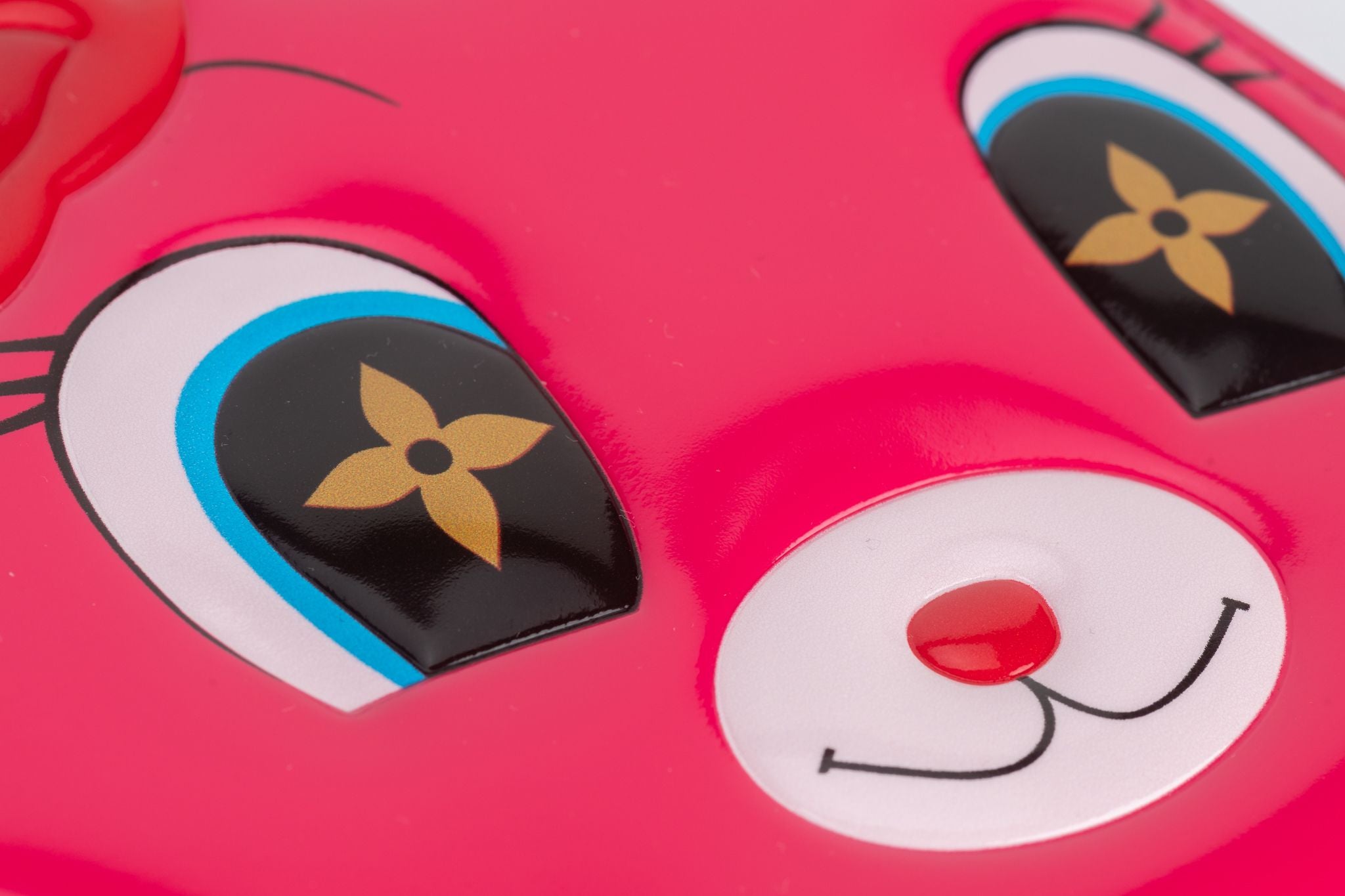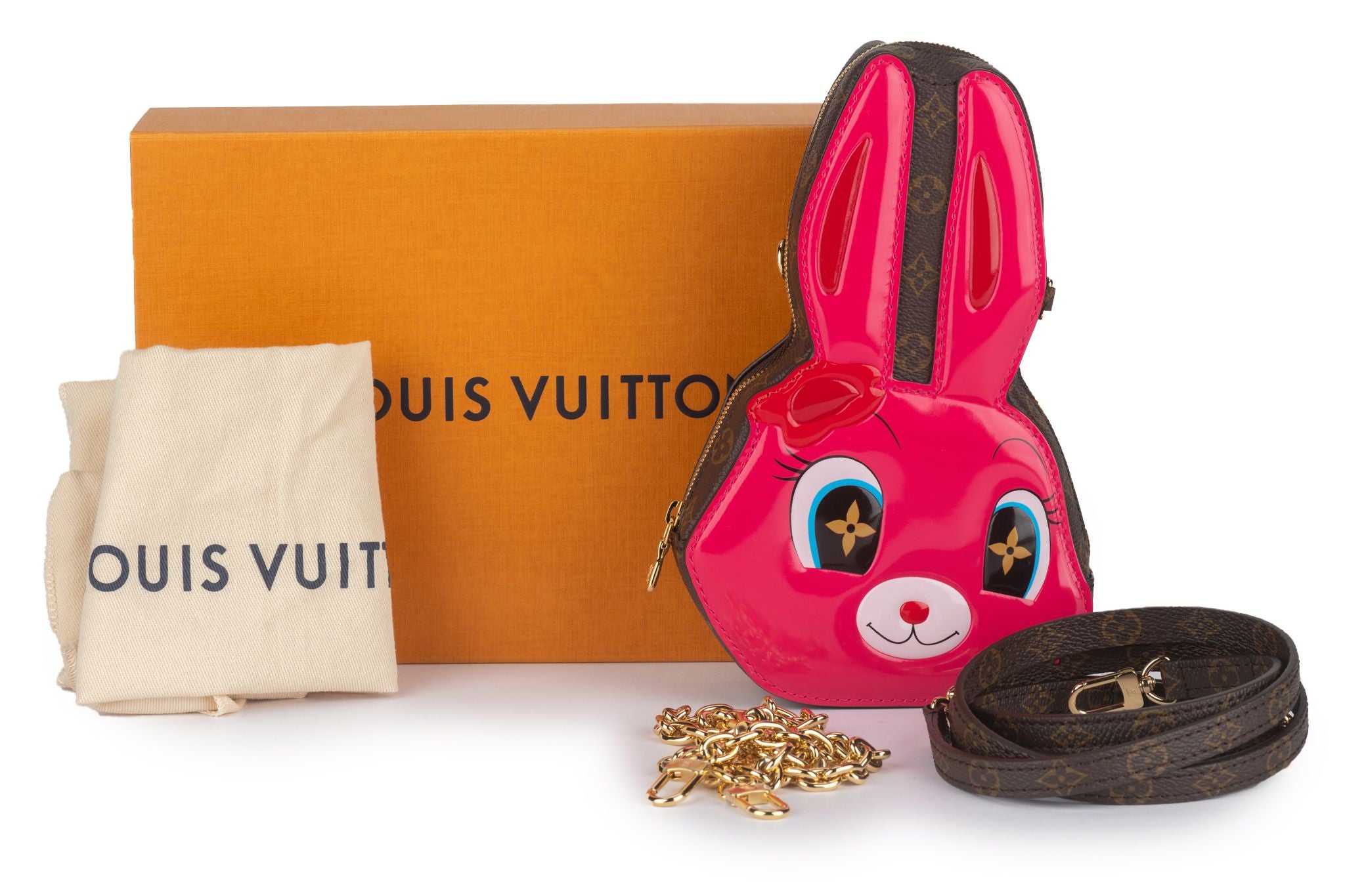 This Louis Vuitton Rabbit wallet on chain features a shiny calf leather with Monogram canvas. The piece is part of a collaboration between the artist Sun Yitian, known for her colorful paintings of mass-produced objects, and Nicolas Ghesquière, Artistic Director of Louis Vuitton. This zipper wallet comes with a removable chain and strap. Brand new limited edition with original dust cover and box .
