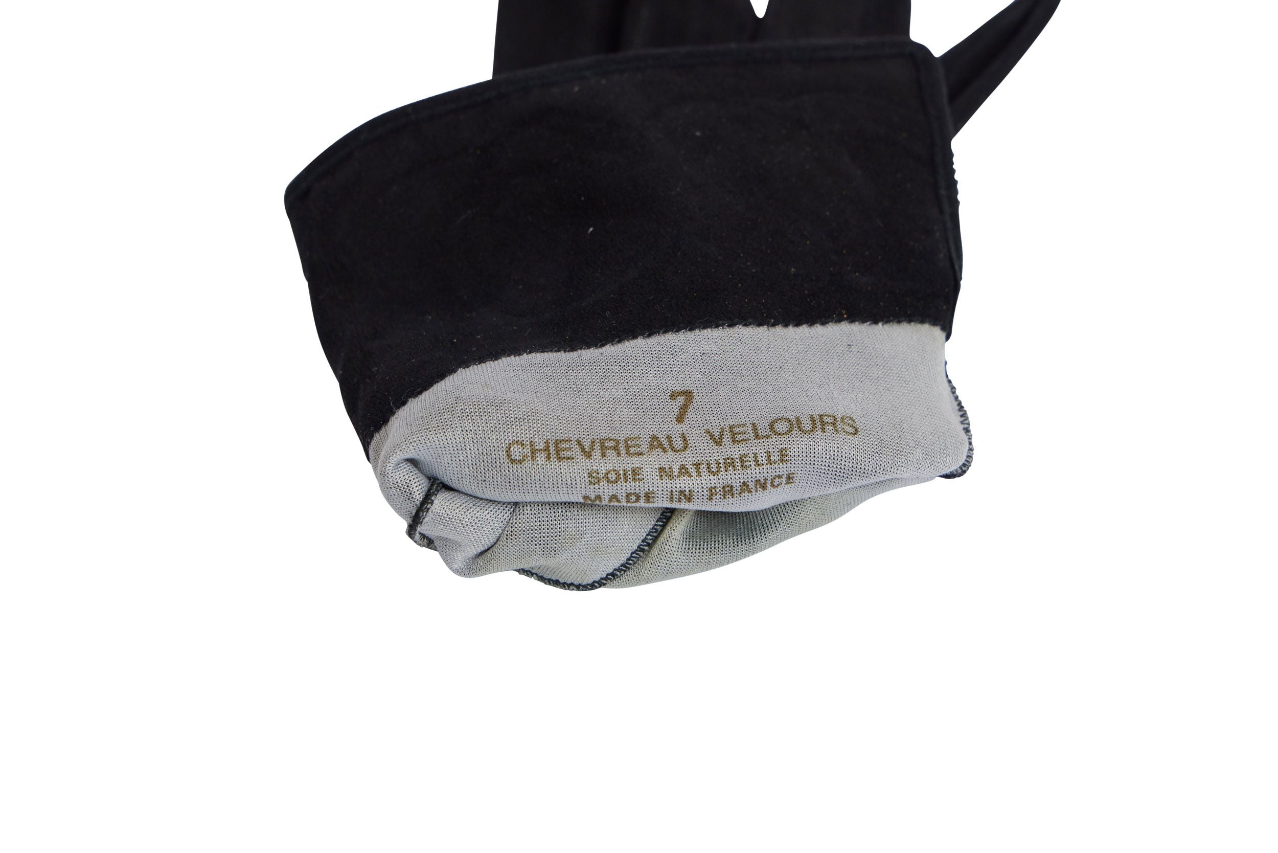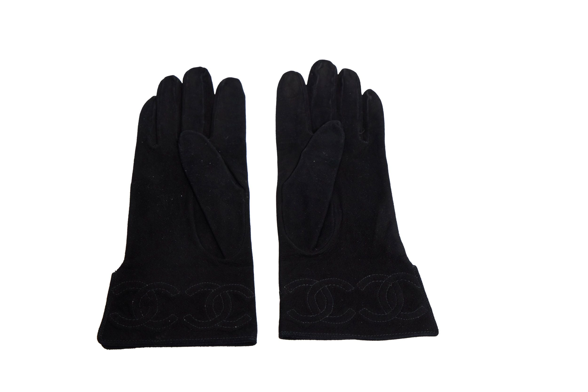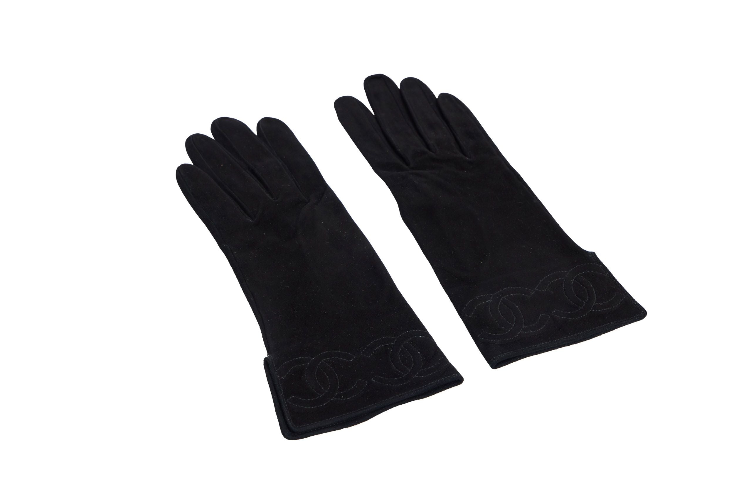 Super elegant Chanel black suede gloves with a CC logo embroidered on the edge. They come in size 7 and are brand new. The lining is made out of silk and white.