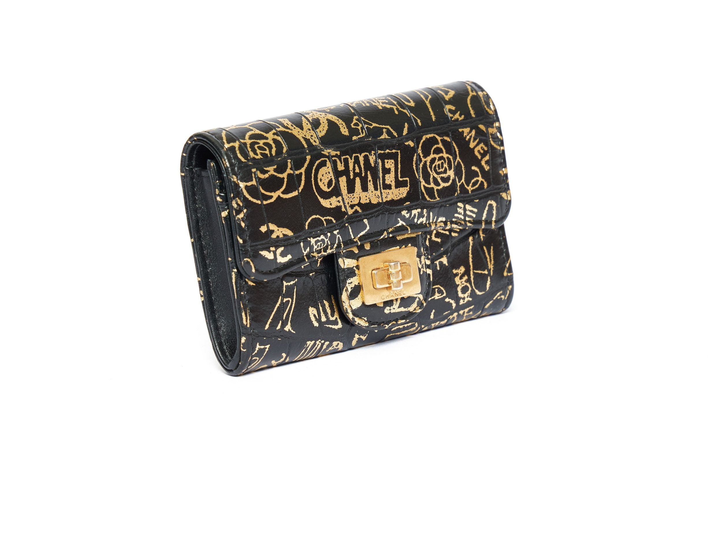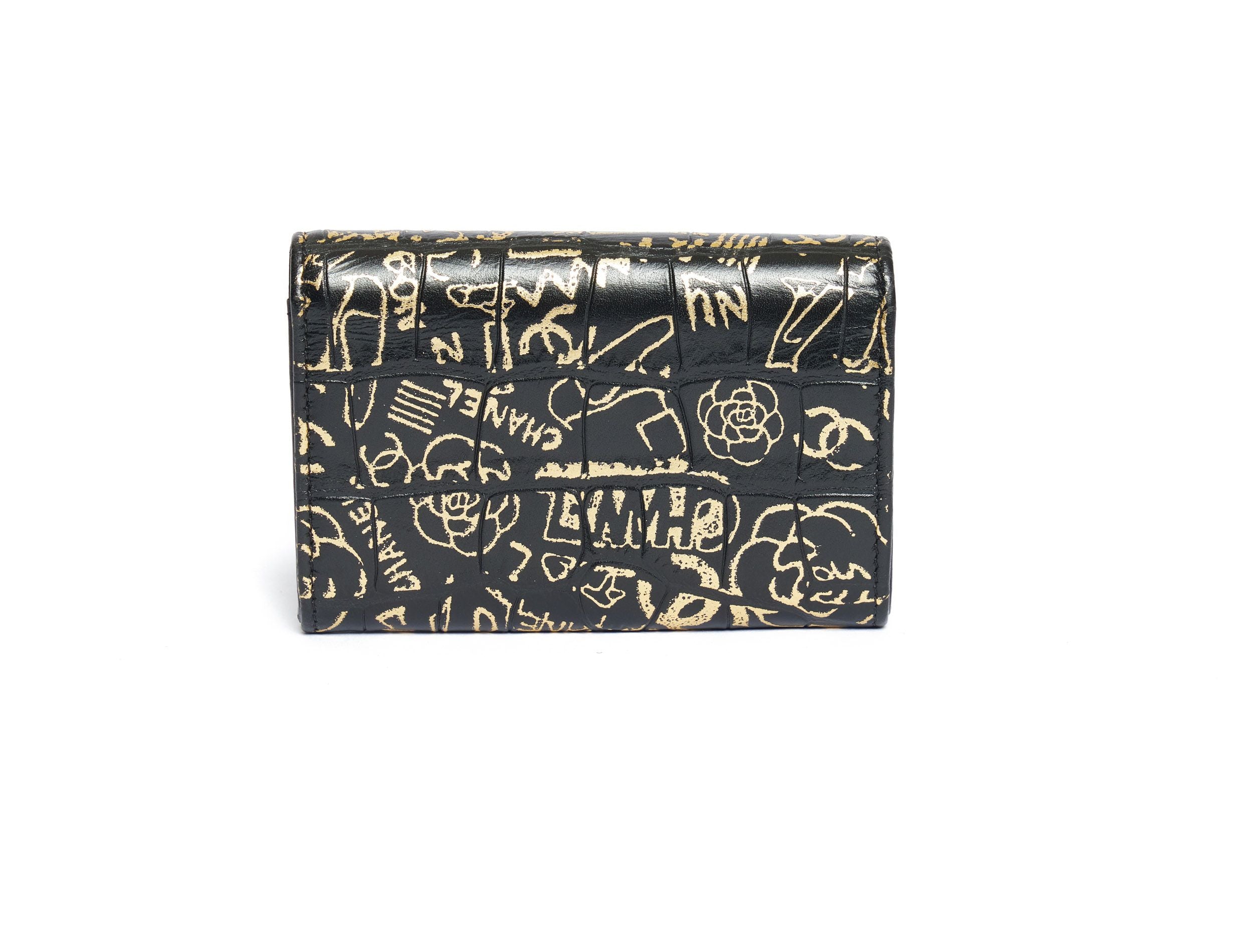 Chanel Limited Edition credit card case in black lambskin leather which looks like crocodile. The case is painted with a graffiti which shows flowers and Chanel written on it in different ways. The snap looks like a small turn lock with Chanel written on it. The interior is made with fabric and has two compartments. This limited Edition was called Graffiti and is from the year 2019. The bag comes with the original dust bag.