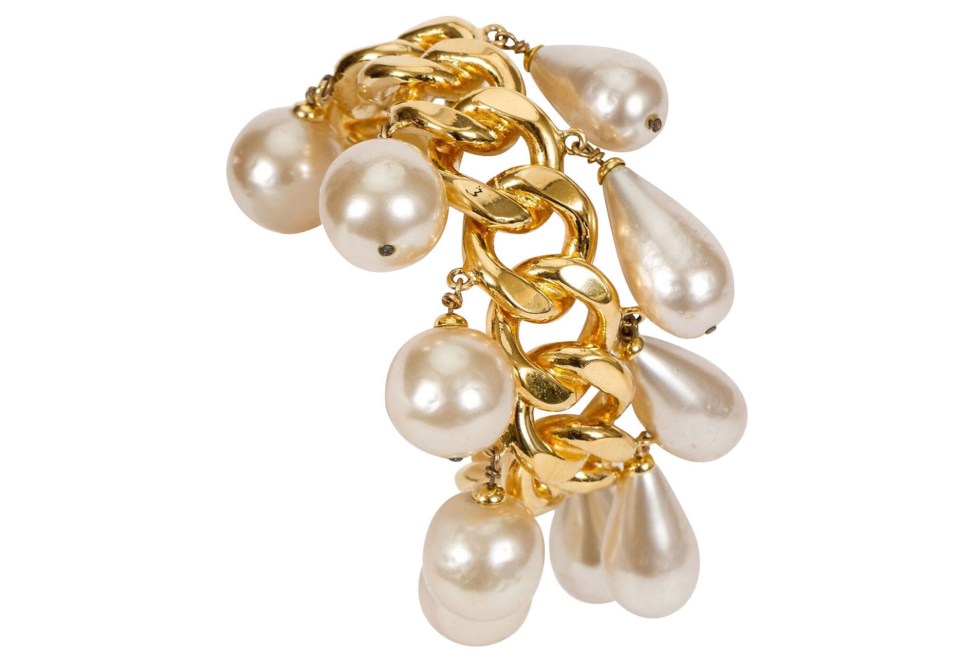 Chanel runway chain cuff accented with faux-pearls. Collection 23 by Victoire de Castellane. Opening, 1.5"L x 2.25"Dia. Comes with original box.