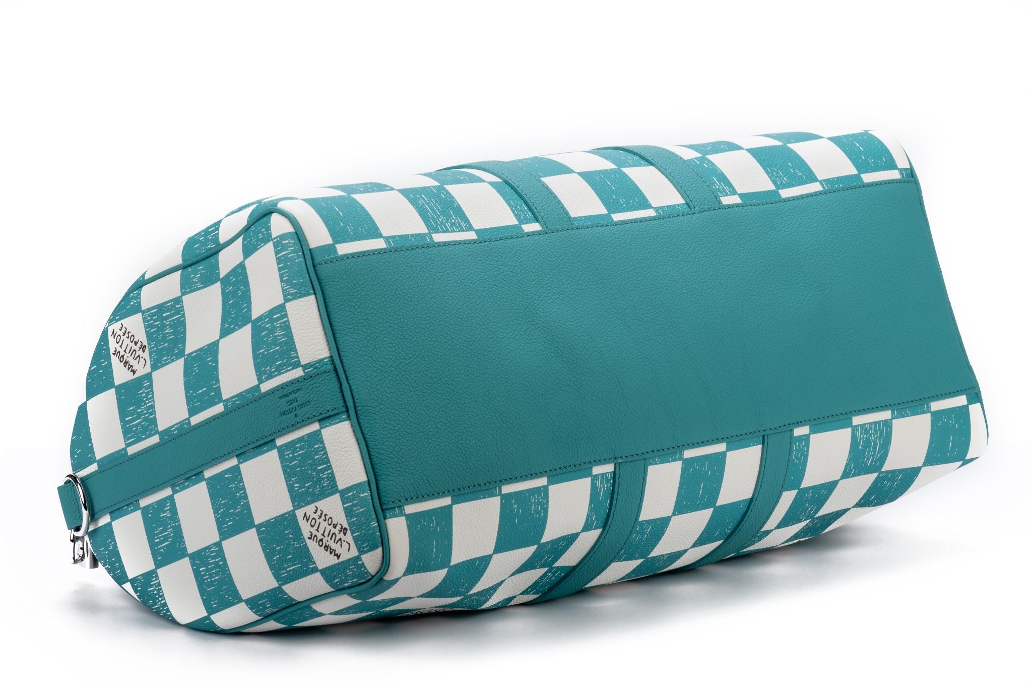 This Keepall Bandoulière 45 bag is fashioned from leather with a Damier checkerboard pattern in teal and white. The leather top handles, side bands, and nametag are also in teal. The squares look as if they were drawn and filled in with a colored pencil. The Vuitton signature in certain squares also has a hand-drawn aspect. The bag comes with a shoulder strap which has a maximum length of 19.6'. It includes original dust cover and box.