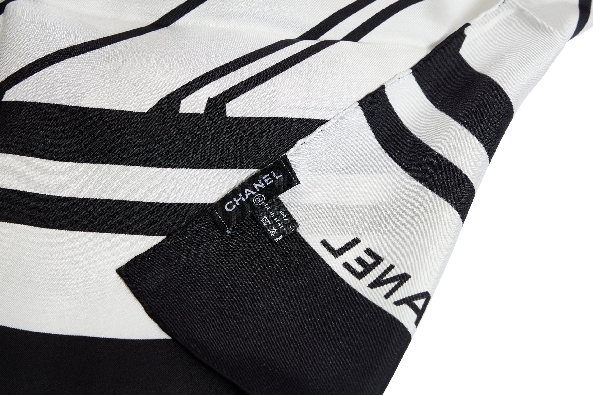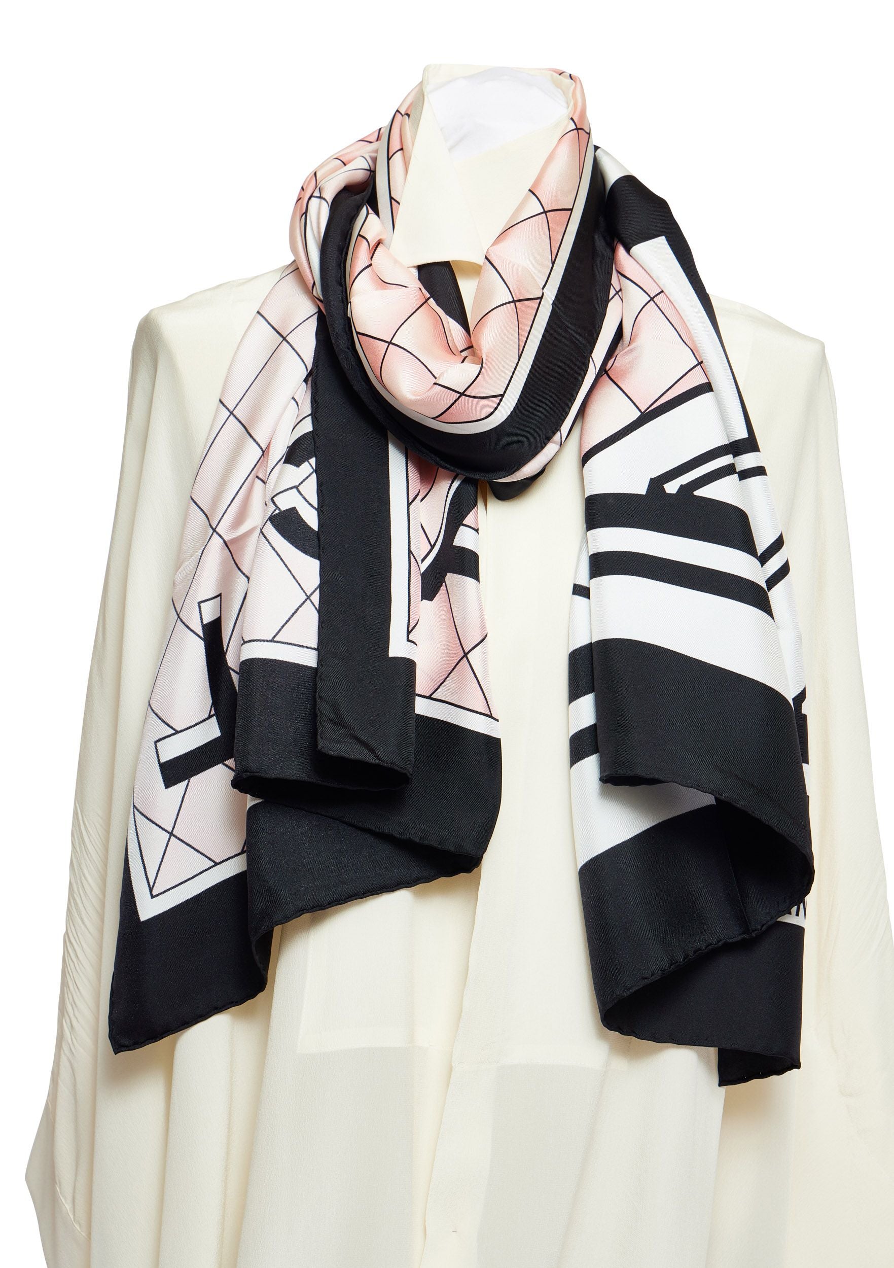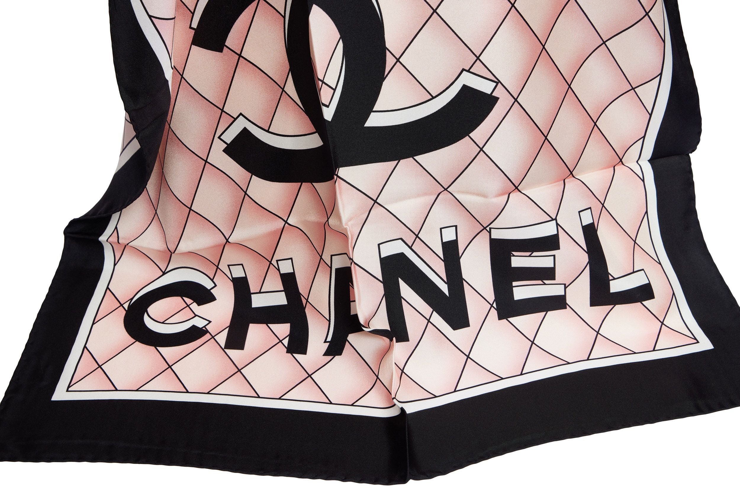 Chanel black and pink silk shawl with three-dimensional black and white letters. The item is made of 100 percent silk and has hand rolled edges in black. The shawl is brand new.