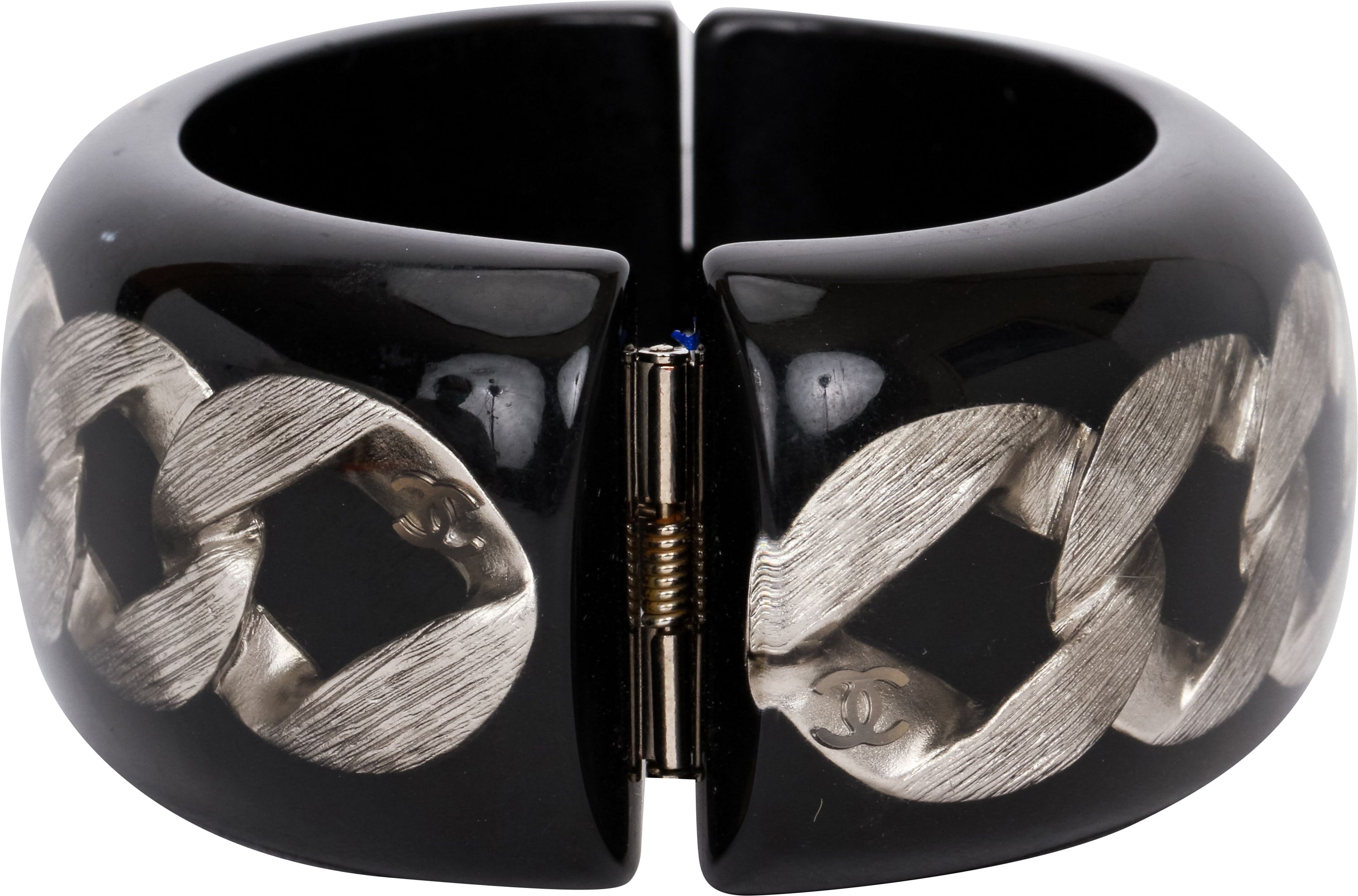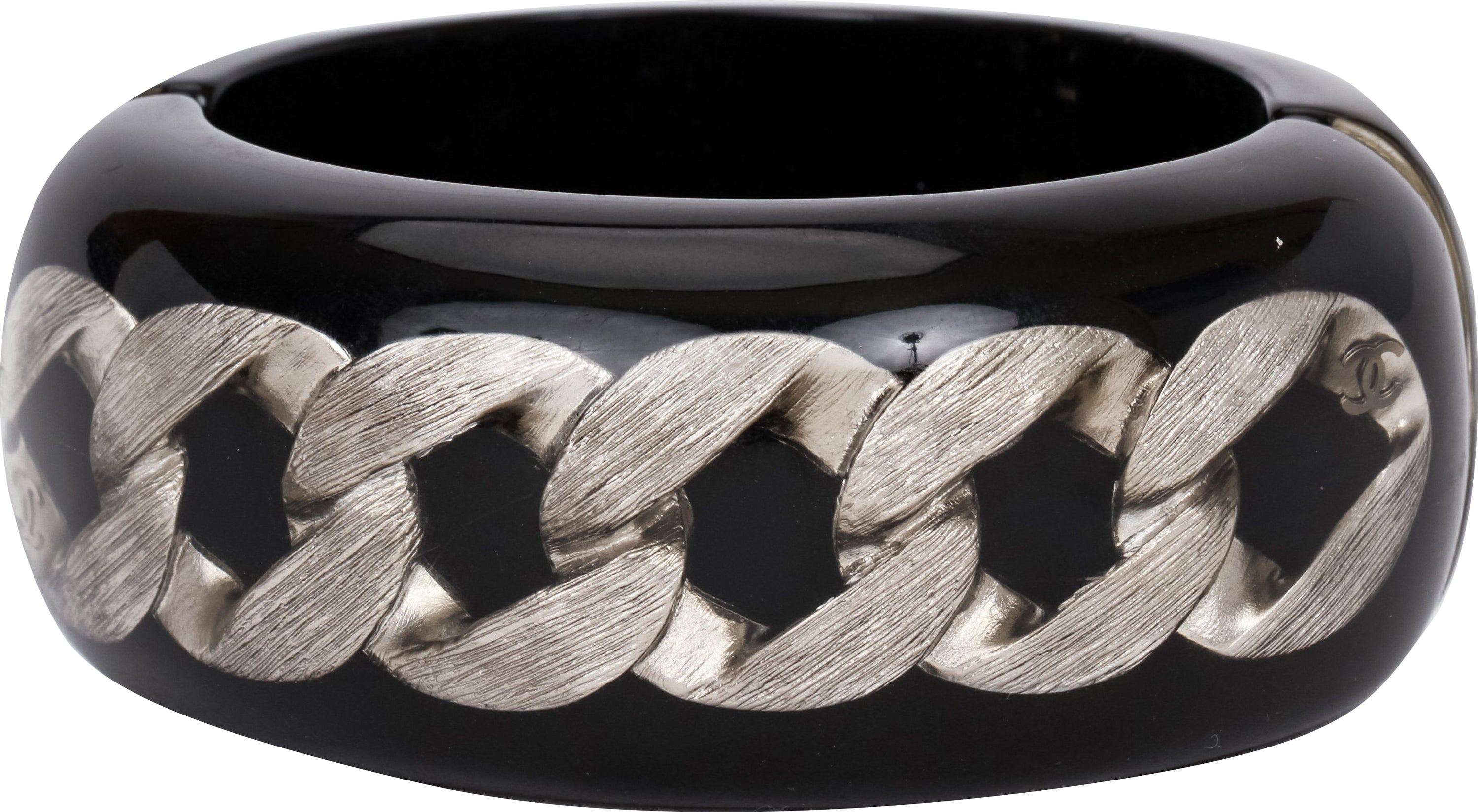 Chanel black lucite hinged oval cuff with ruthenium chain inlay, circumference 9.5”, original pouch