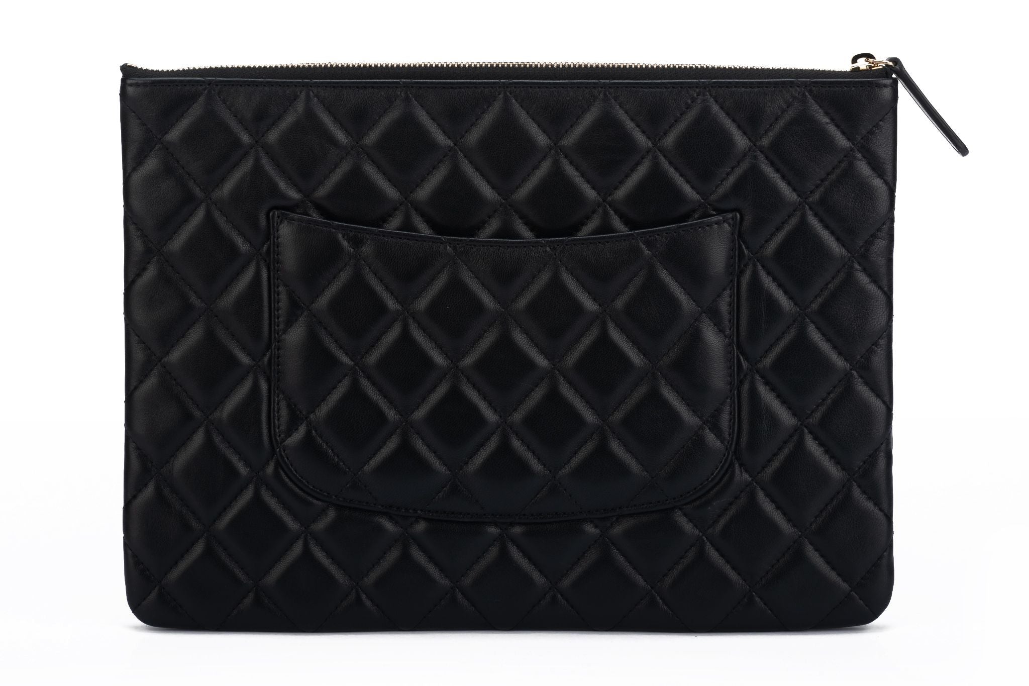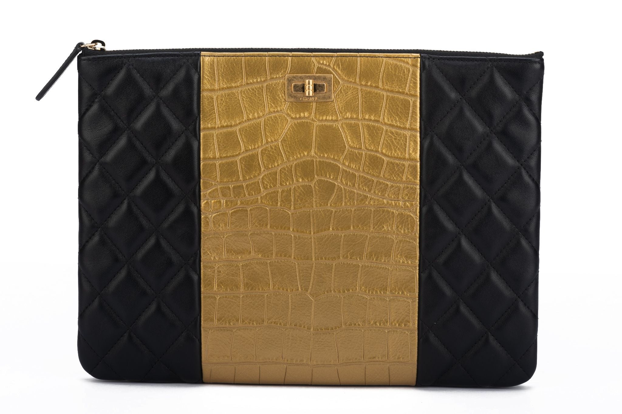 Chanel new black quilted and gold croc embossed leather clutch. Collection 28. Comes with hologram, di card, dust cover and box.