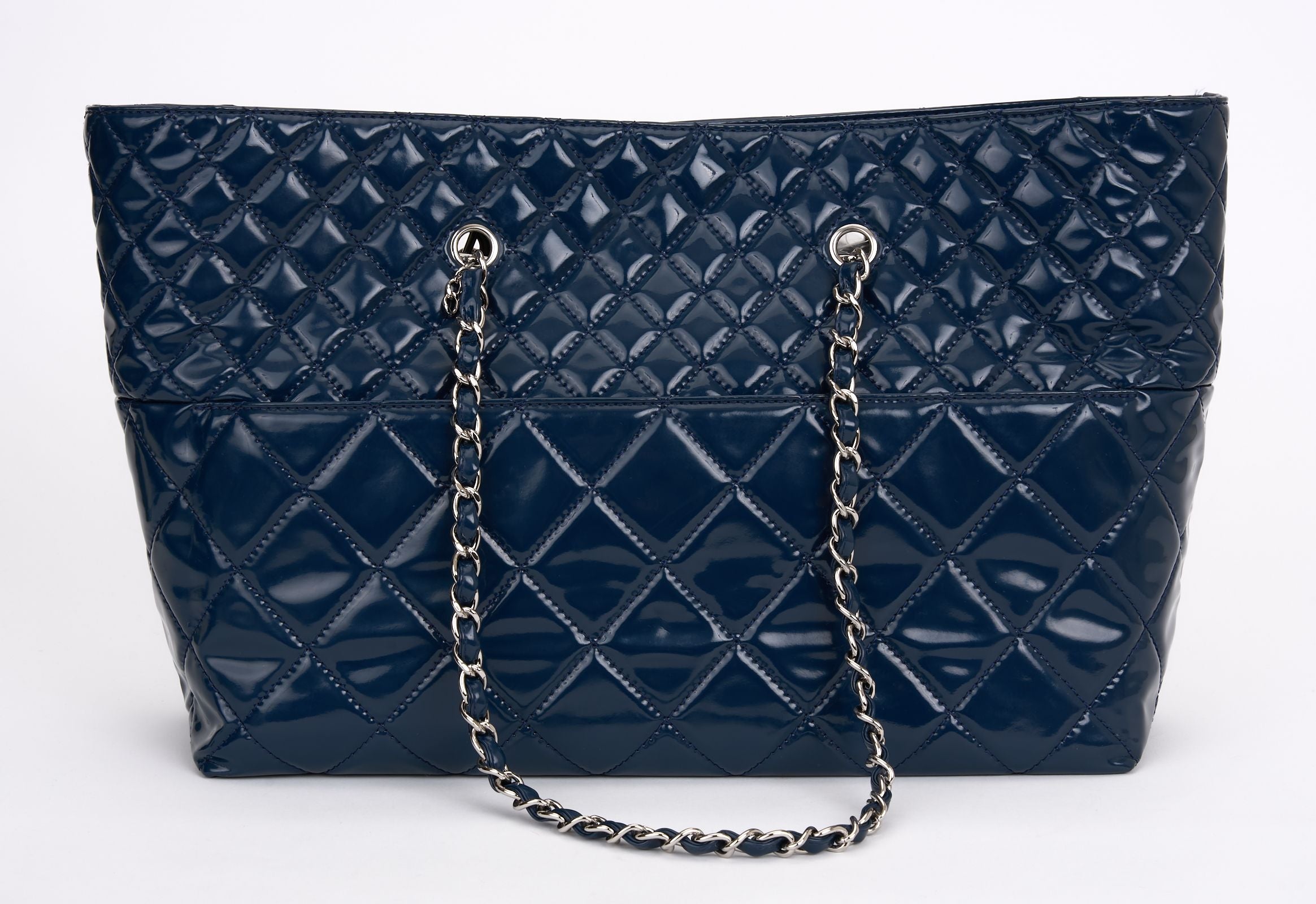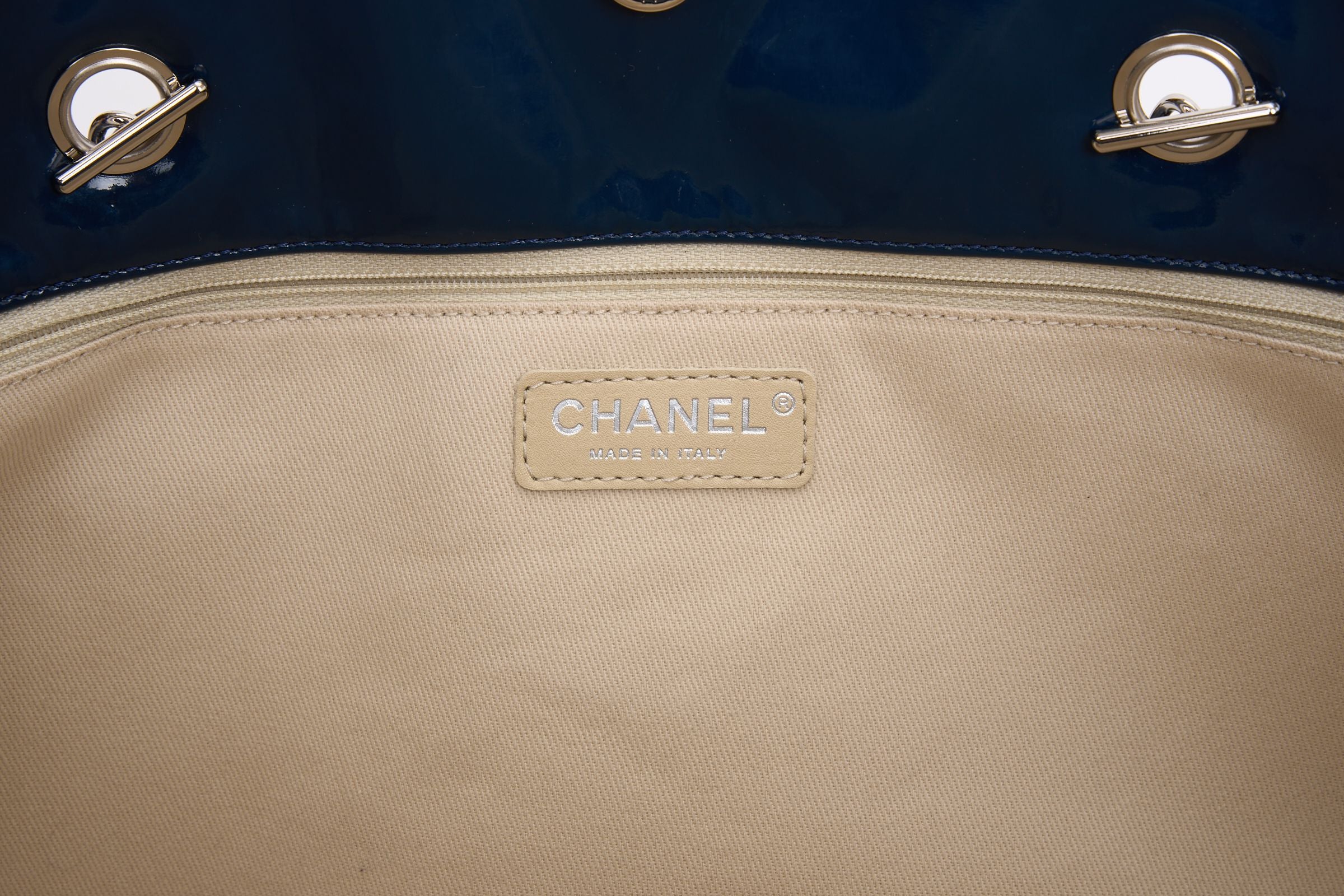 This Chanel "In the Business" large shopper bag in navy patent leather with silver-tone hardware, dual chain-link and leather shoulder straps, CC charm embellishment at the front left handle, single exterior pocket, beige woven lining, three interior pockets; one with zip closure and two patch pockets, and magnetic snap closure at top. ID card included. Hologram first two numbers are 14. Strap Drop - 10.5".