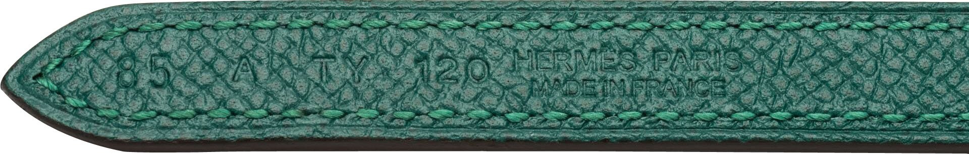 Hermès thin reversible belt in green Epsom leather and blue atoll Swift leather. Rose goldtone buckle belt. Size 85 cm, date stamp A for 2017. Comes with original box, dust cover, ribbon, and shopping bag.