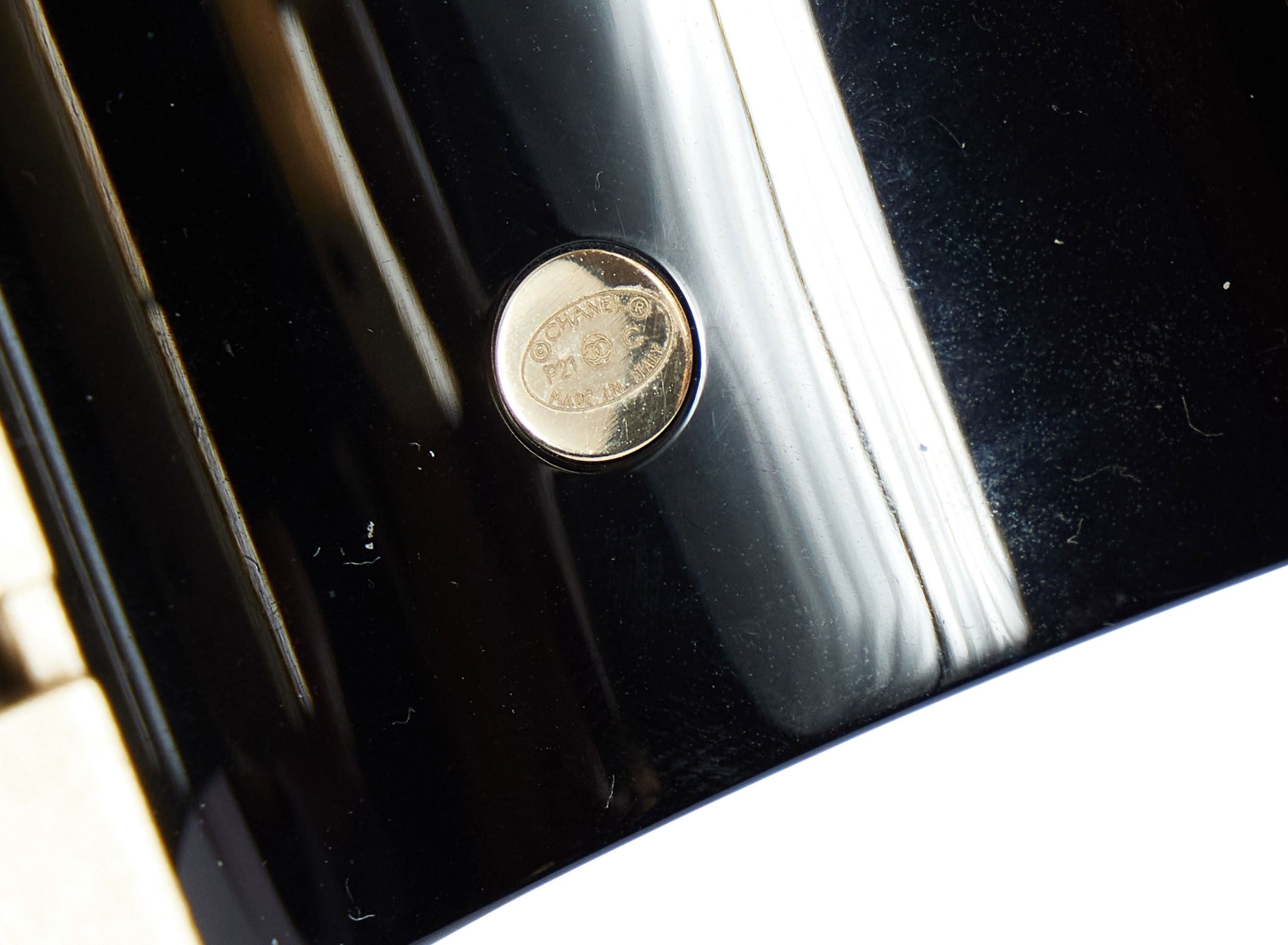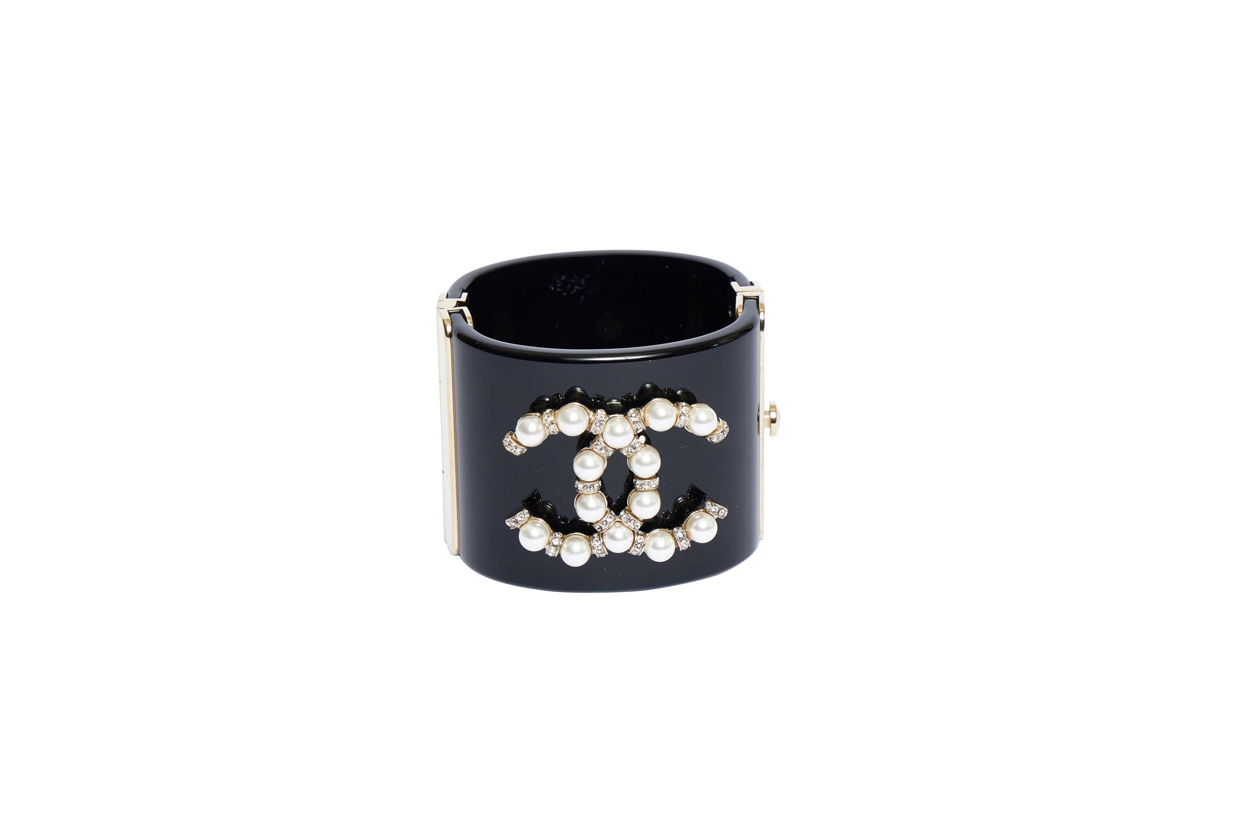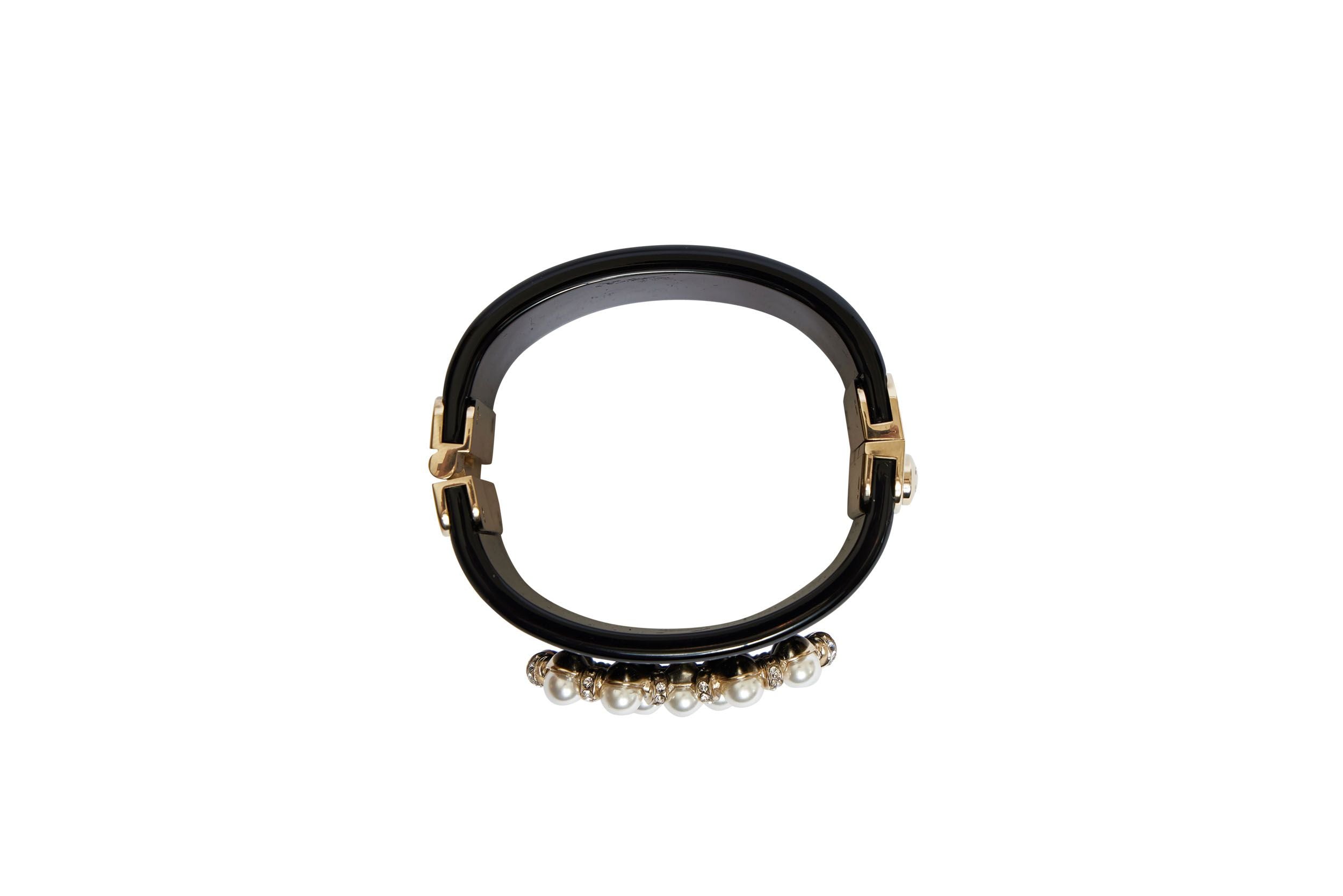 Chanel vintage black lucite cuff bracelet withPearl and clear rhinestones CC logo. Gold plated metal hardware. Mint condition. Original box included.