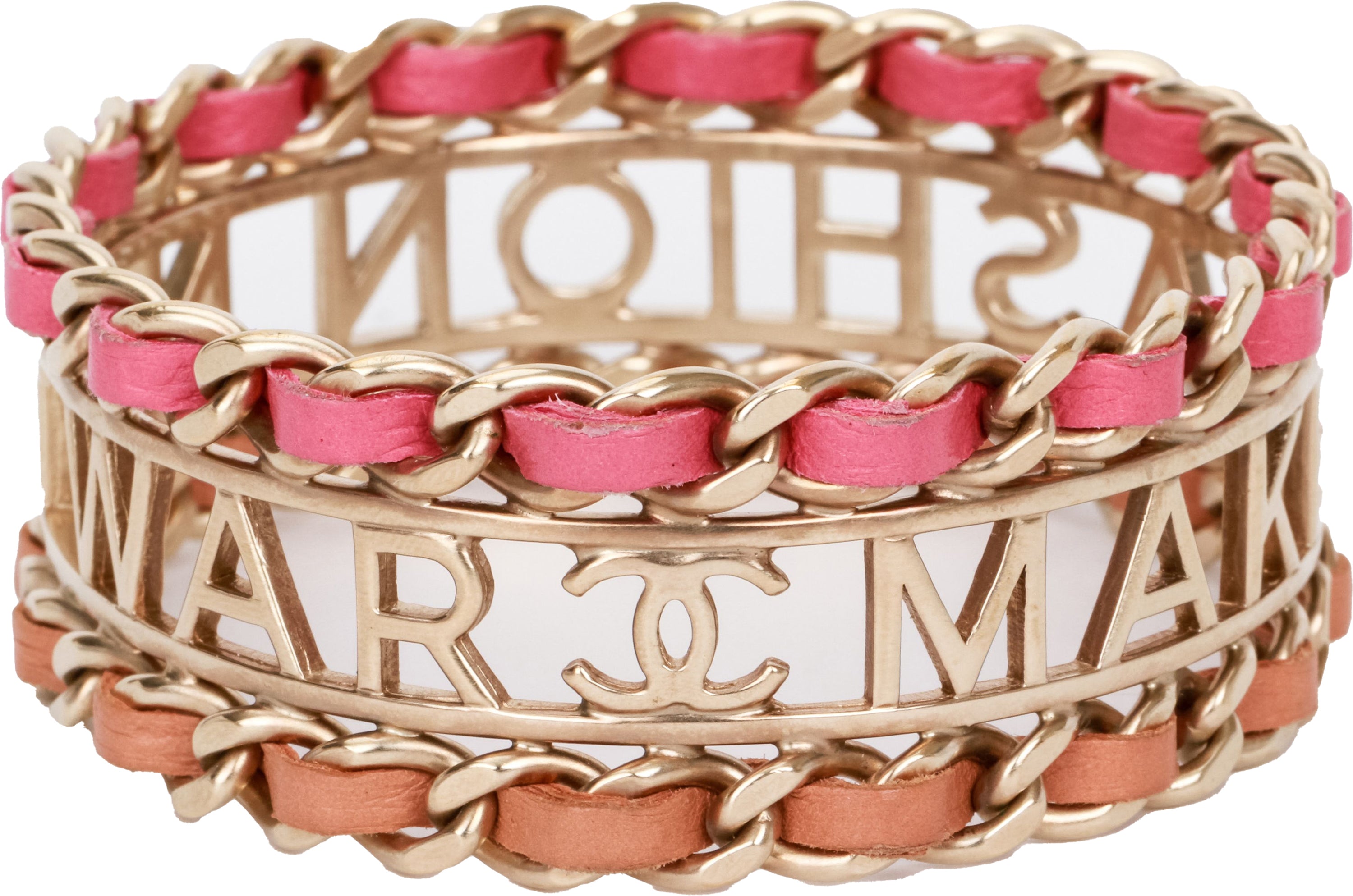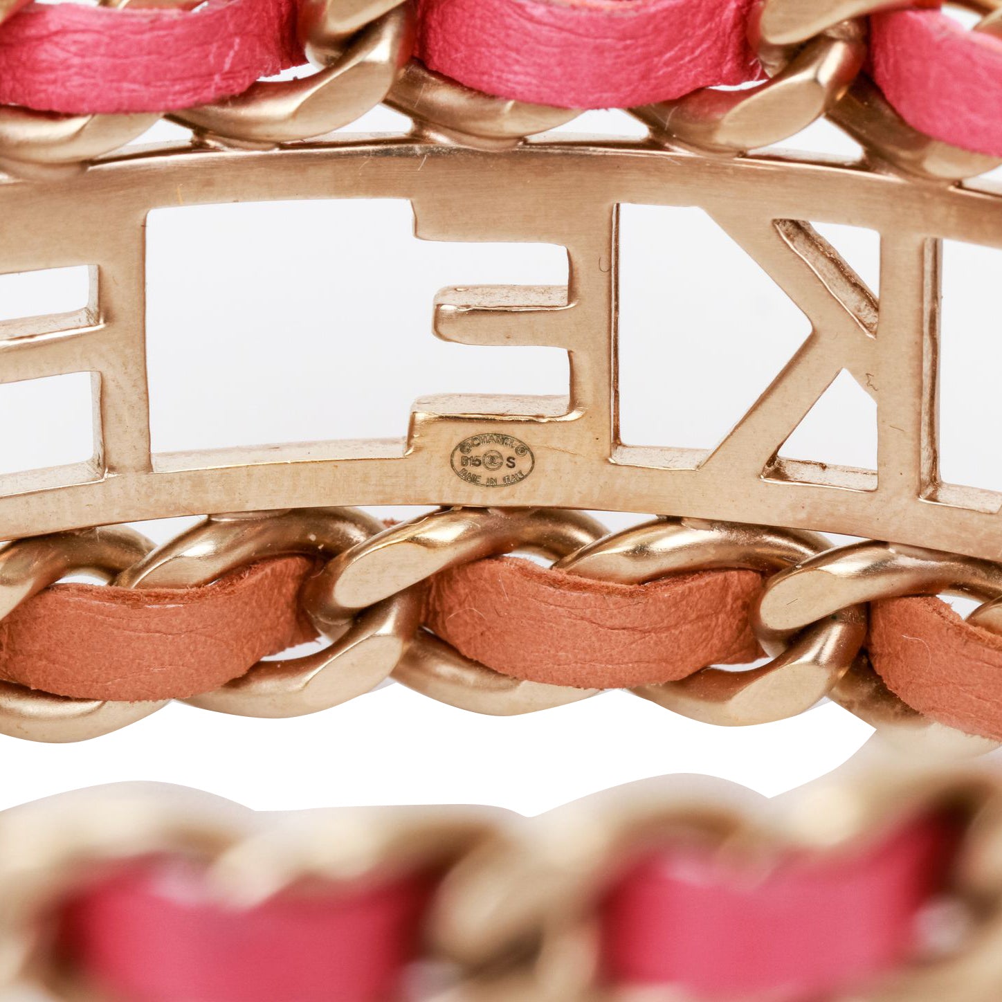 Chanel statement light gold bangle with pink and fuchsia leather, medium size, D 2.5", H 1", spring 2012. Comes with original pouch.