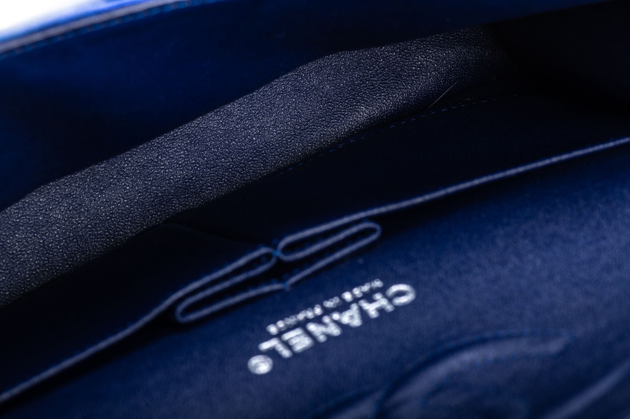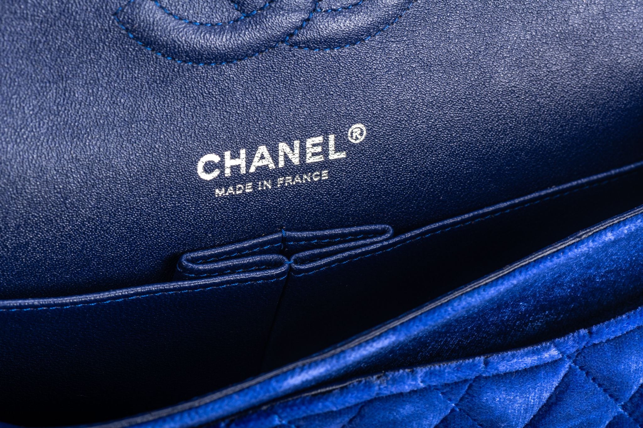 Chanel excellent condition blue velvet double flap, blue leather lining and black hardware. Shoulder drop 9”/19”. Comes with hologram, ID card and original dust cover. Collection 20.