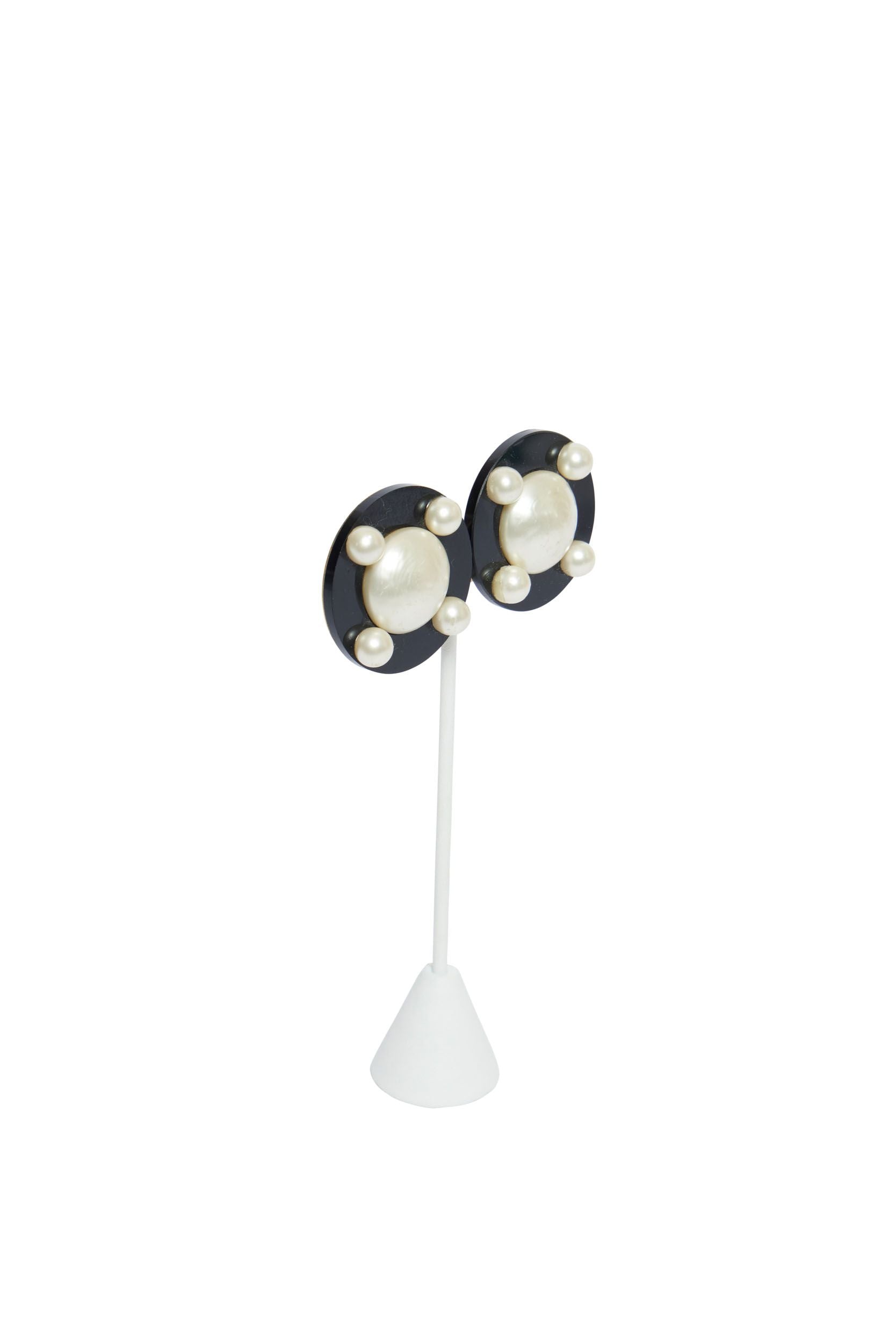 Black enamel Chanel clip on earrings with a large pearl in the center. On the trim you can see four pearls and the diameter is 1,6'. For authenticity you can find a gold plate on the back of the earrings.