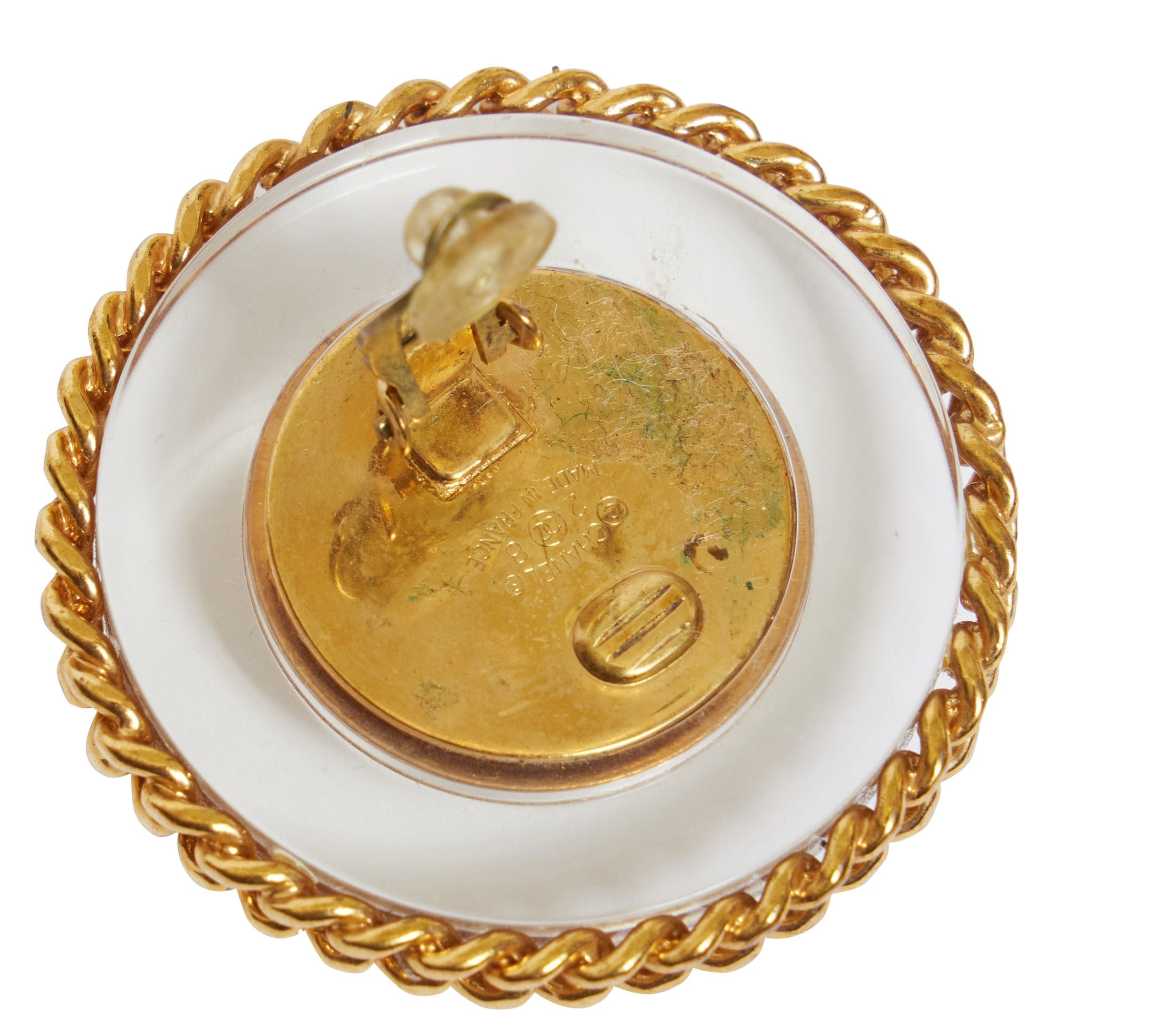 Vintage Chanel clear lucite and gold metal clip on earrings. Large central pearl. 24kt Gold metal chain around the earring. Collection 28, mid 80s, designed by Victoire de Castelline. Come with original box.