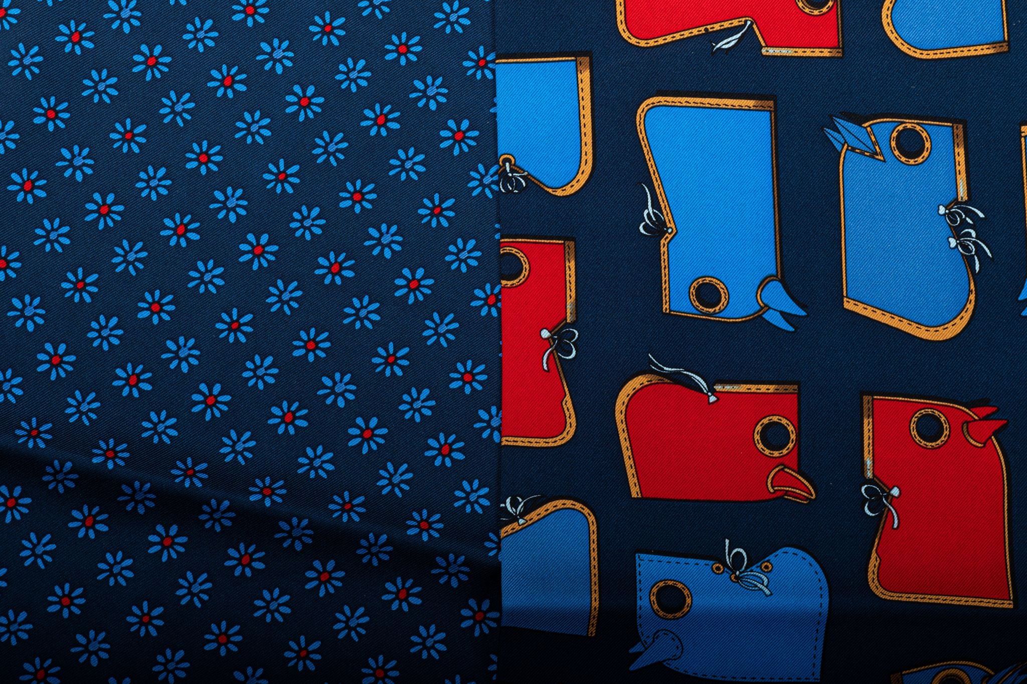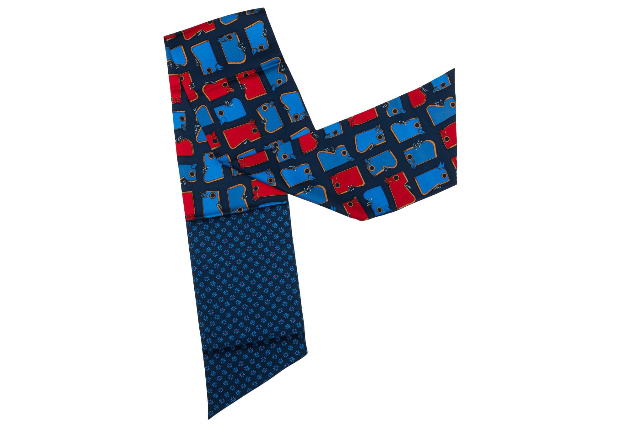 Hermes Camails Twilly made of silk in blue and red. This small, yet iconic silk accessory can be tied endless ways to bring a whimsical touch to your everyday looks.