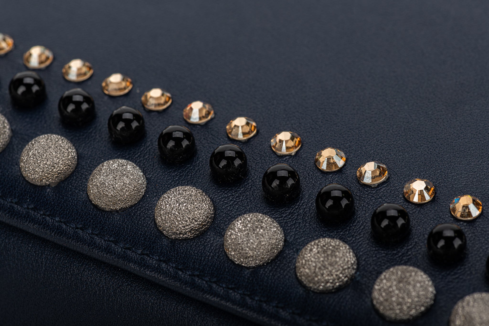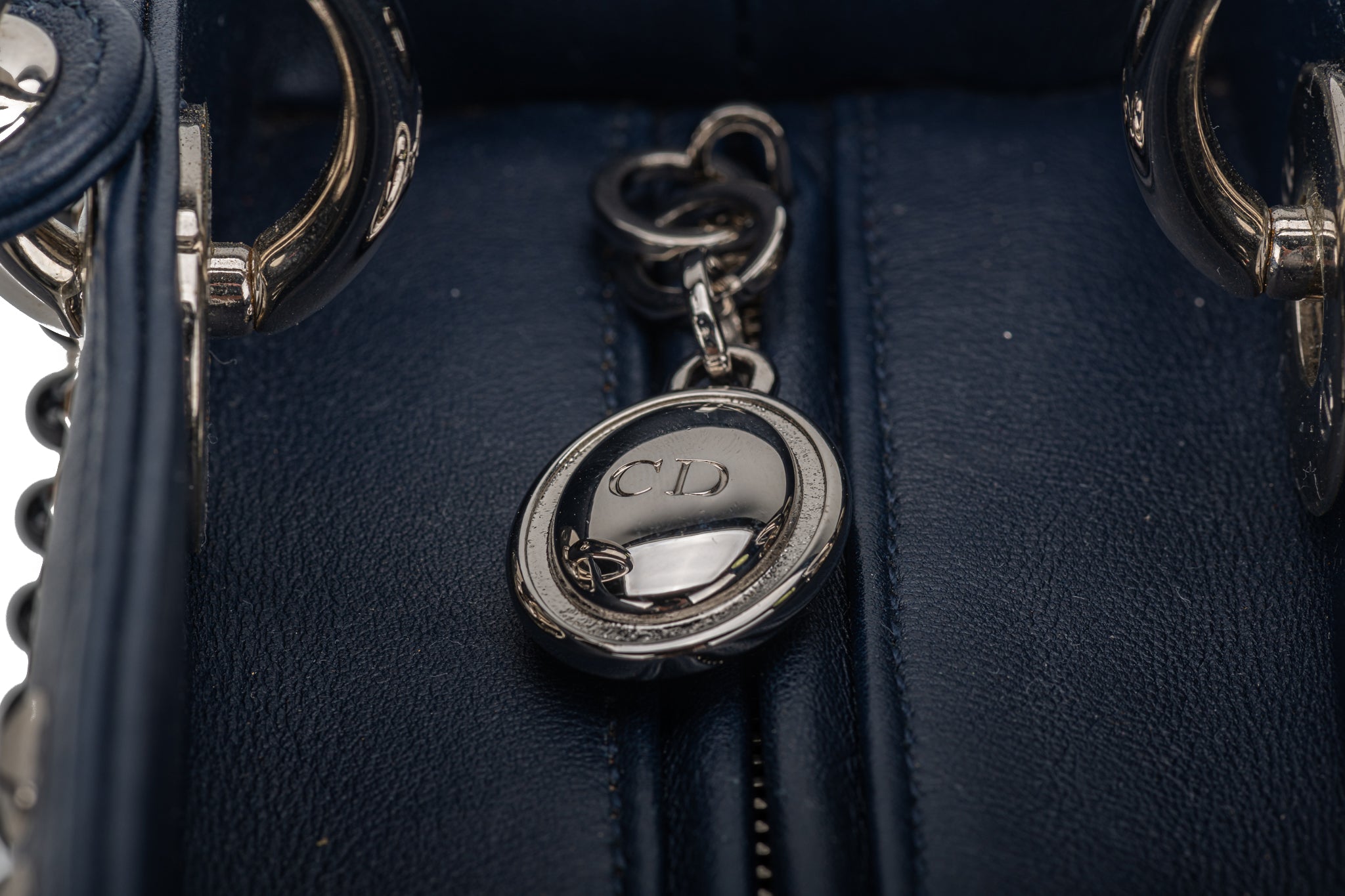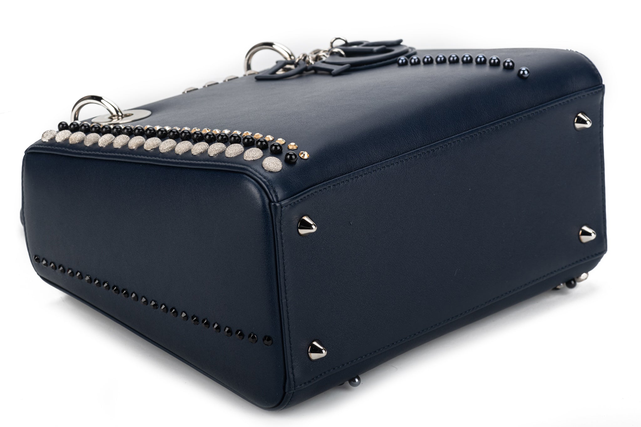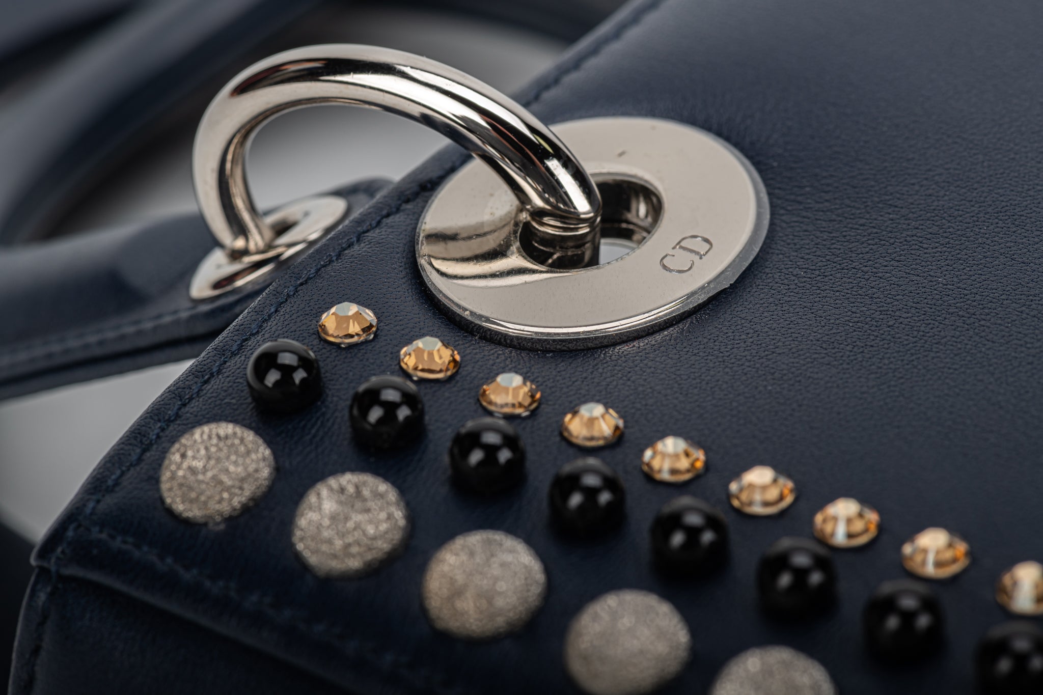 Embellished navy lady Dior with rhinestones decoration. The shoulder strap measures 16” and it is detachable . Comes with original dustcover.