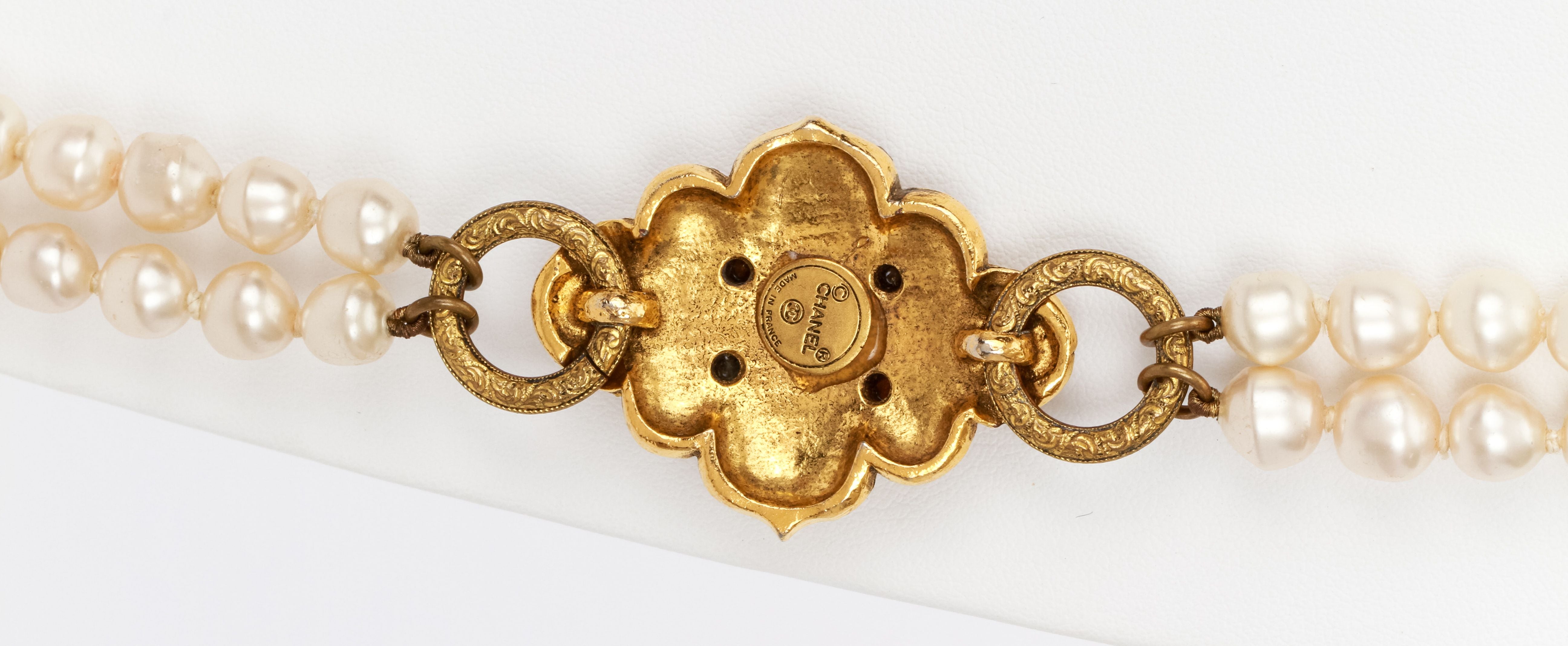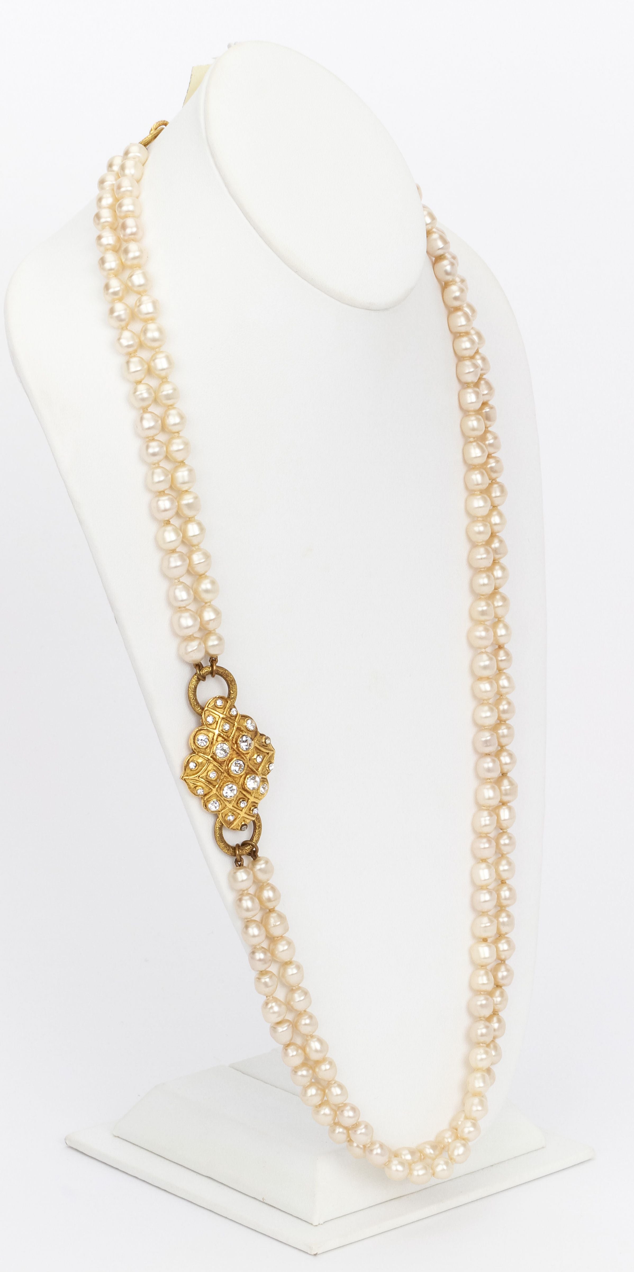 Chanel two strand pearl necklace with oblong decorative gold medallion featuring a quilted motif, each diamond shaped section decorated with a rhinestone in different sizes. Vintage 1970s in pristine conditions.