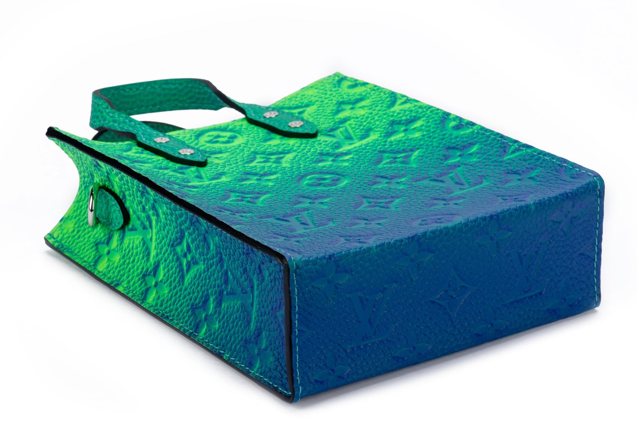 Louis Vuitton Virgil Abloh Green and Blue Monogram Illusion Leather Sac Plat XS with silver hardware from the year 2021.This bag is lined with blue microfiber and the piece was featured during the Spring 2022 men's runway show. It has a handle (2.5' drop) and a shoulder strap with a silver chain (23' drop). The bag comes with the dust cover and box.