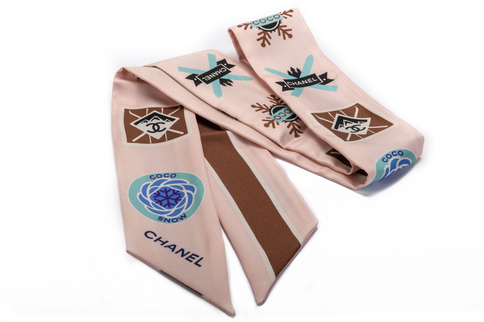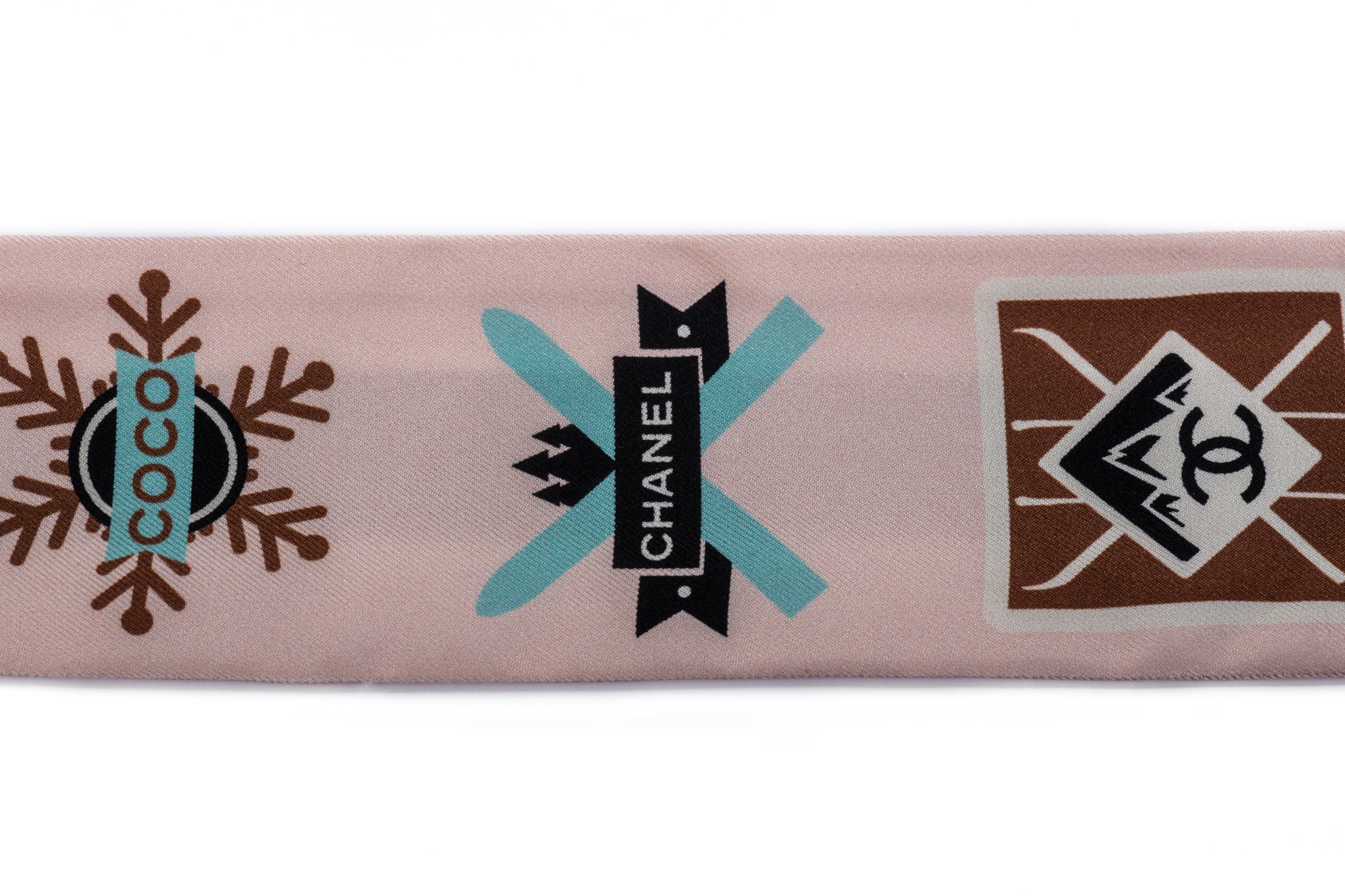 Chanel brand new 100% silk twilly scarf. Coco niege collection with snow flakes. Pink base color with blue and white detail. Chanel shopper not included.