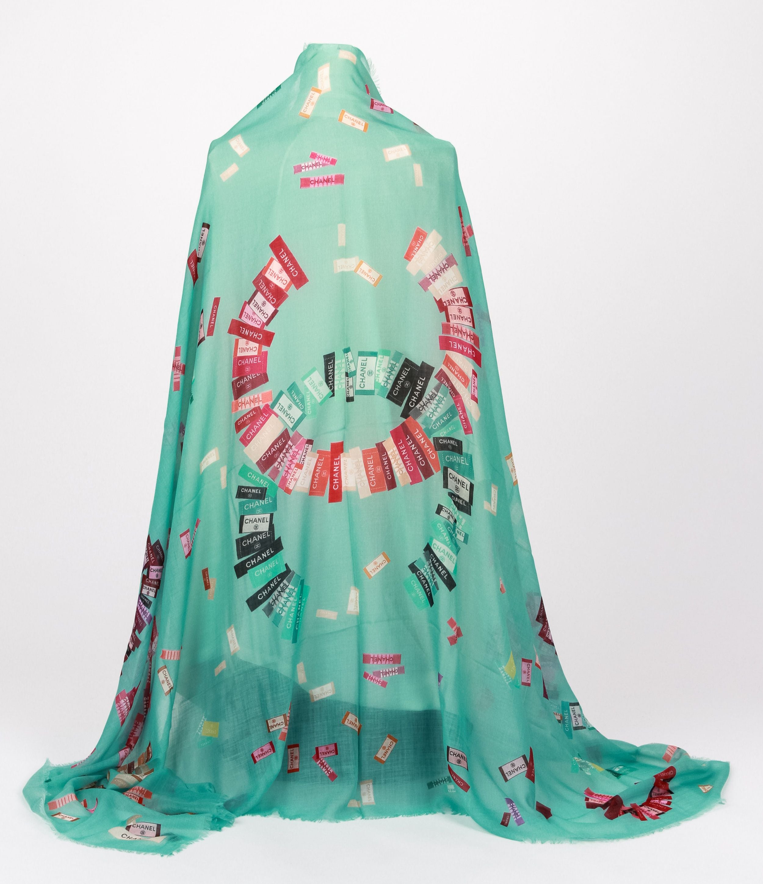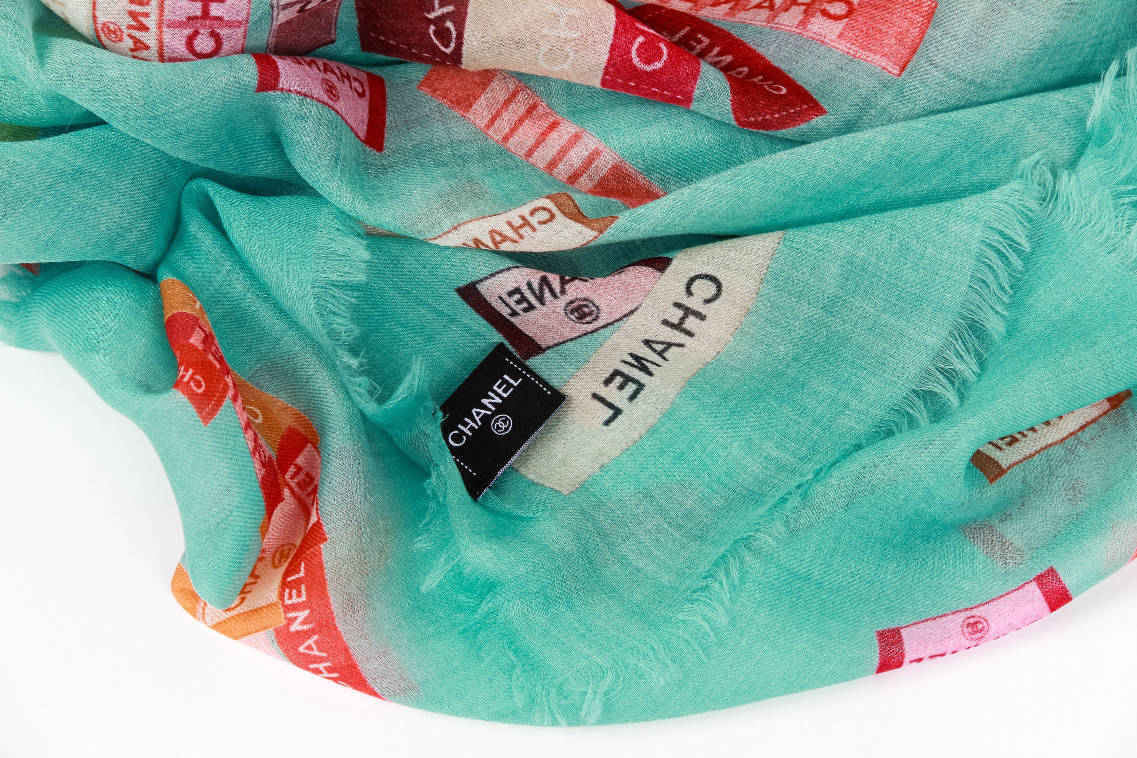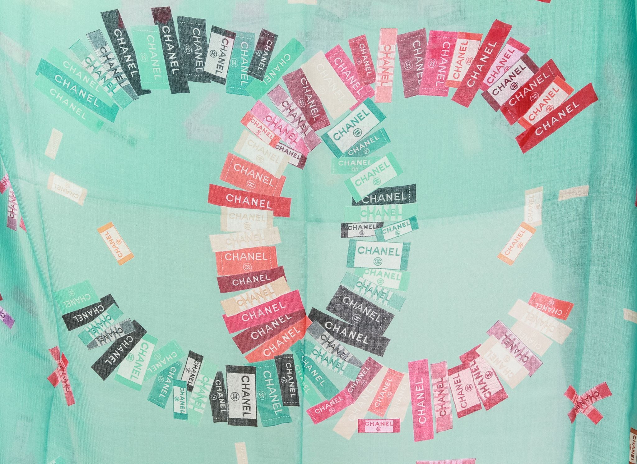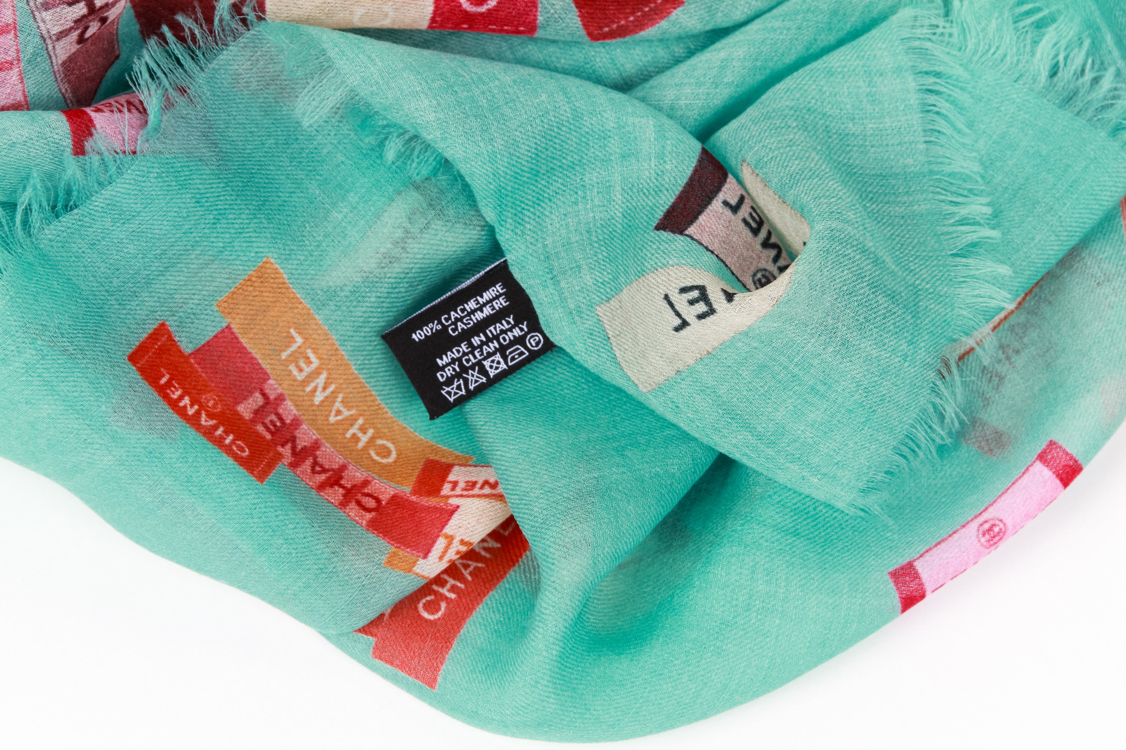 Chanel brand new cashmere and silk teal multicolor logo design shawl