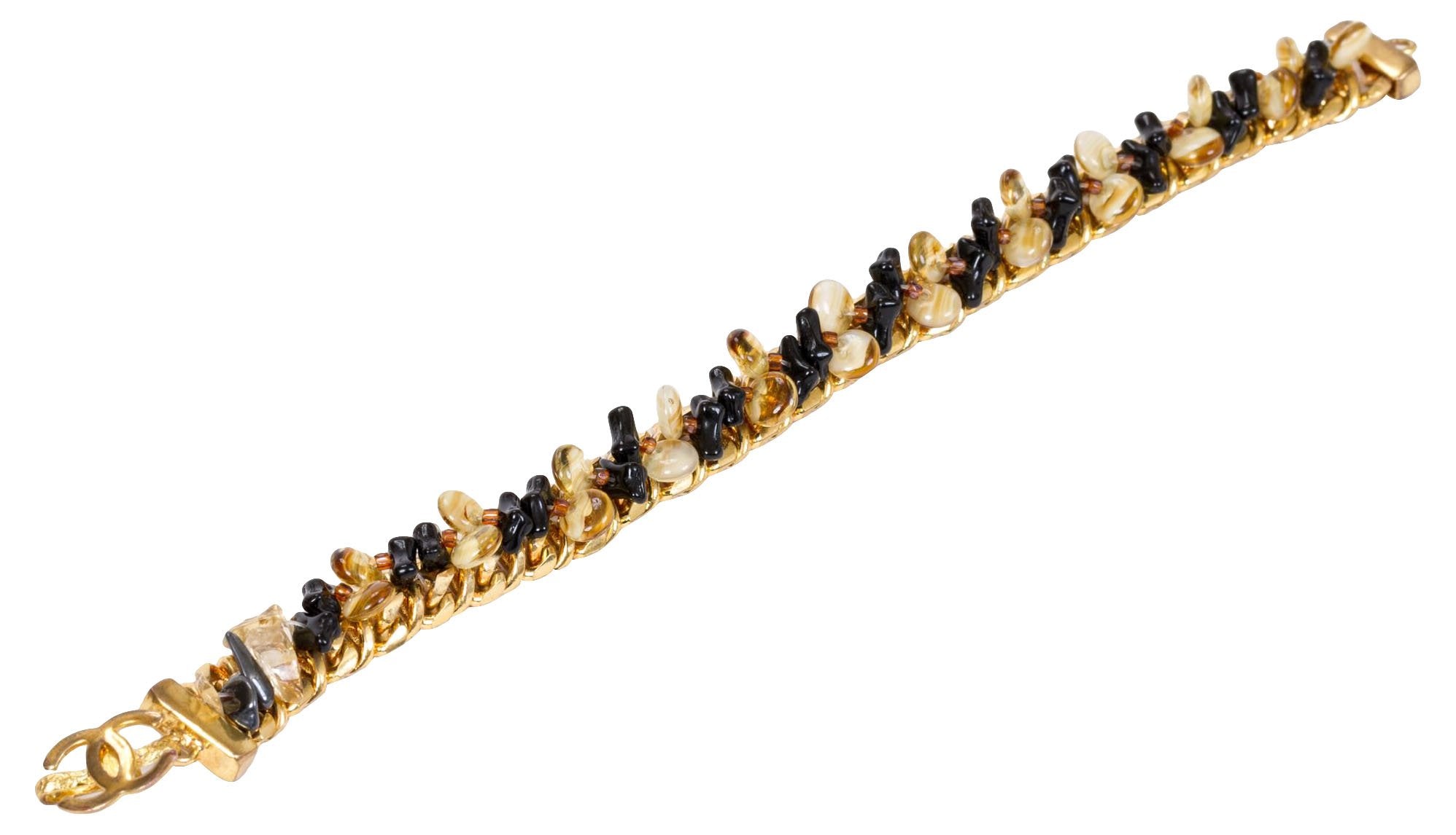 Chanel goldtone metal bracelet adorned with brown and black glass beads. Spring '99 collection. Comes with a original pouch. Minor wear.