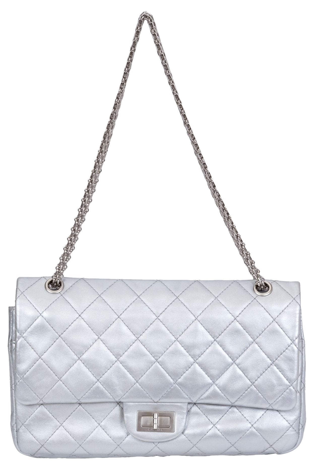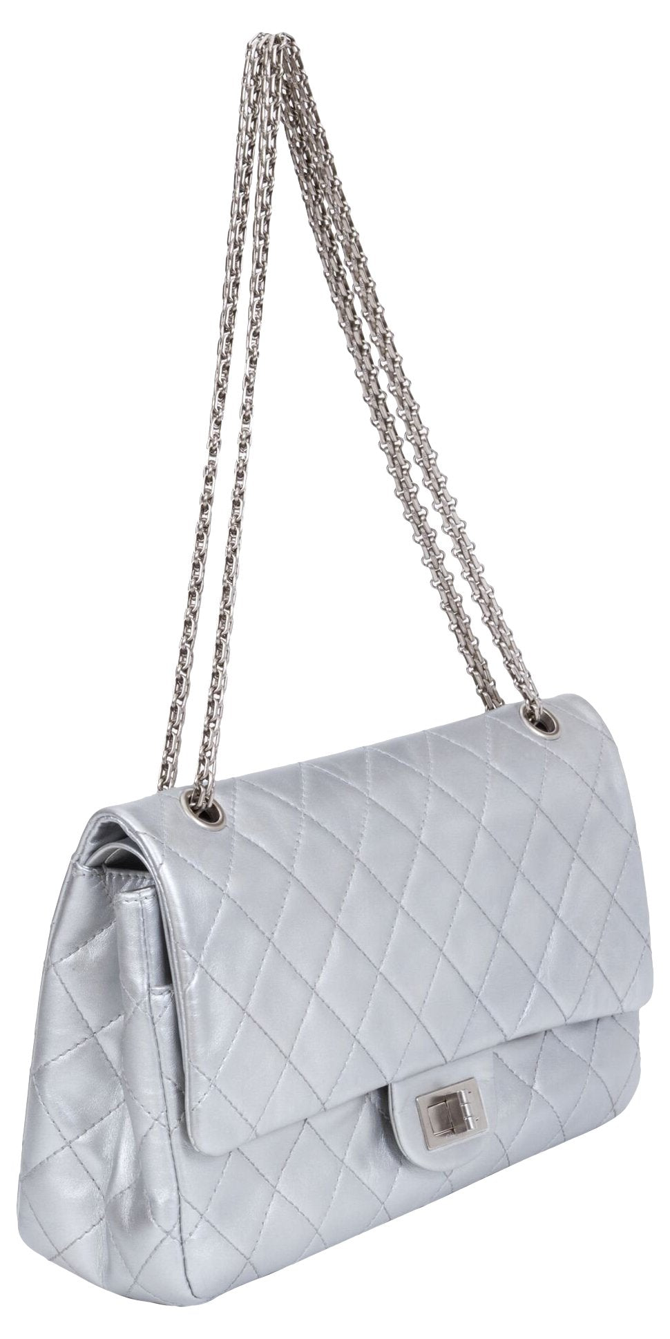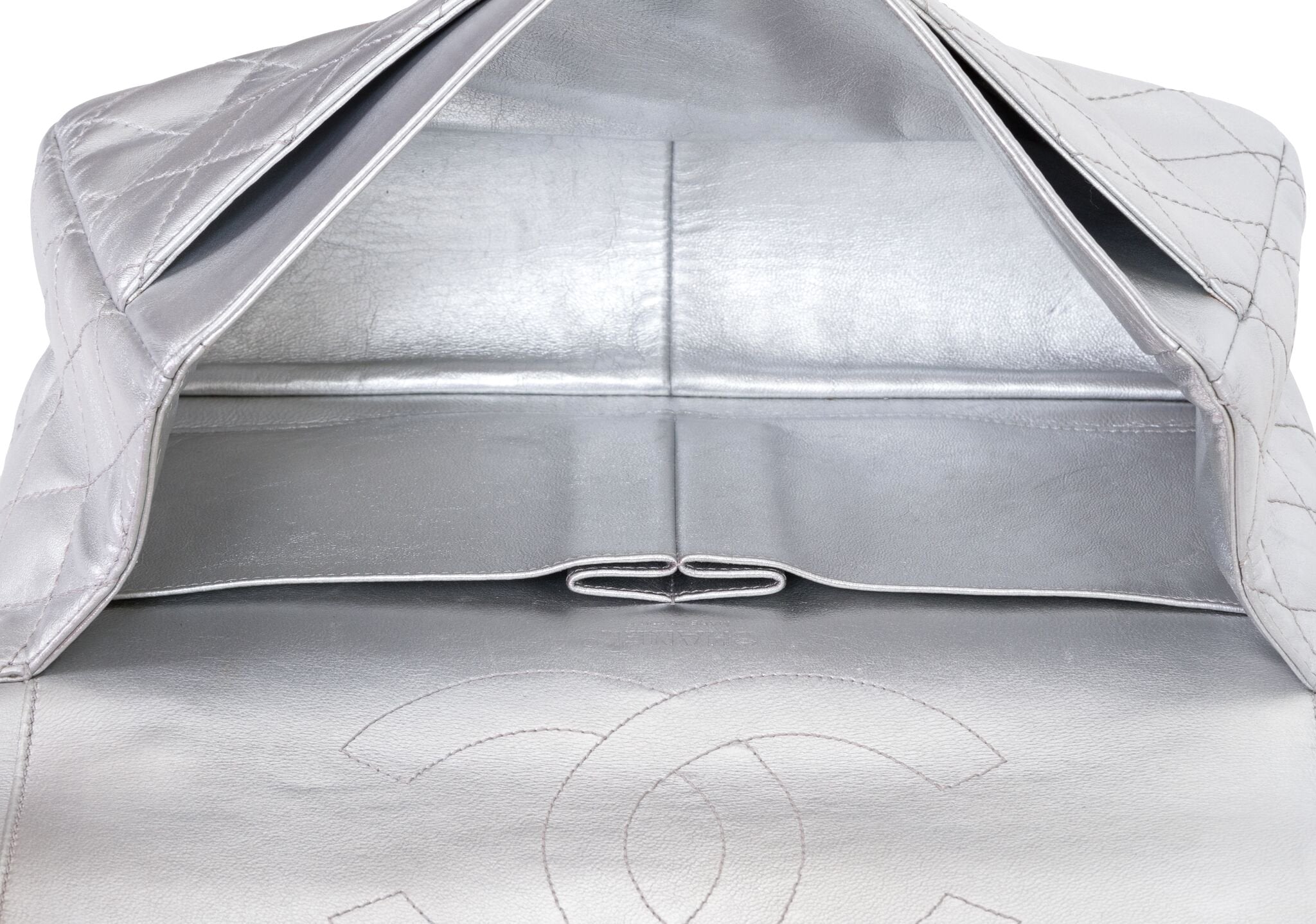Chanel jumbo reissue double-flap bag. Metallic silver leather and silver metal. Can be worn cross body. Shoulder drop: 11"/20"L. Comes with hologram and original dust cover.