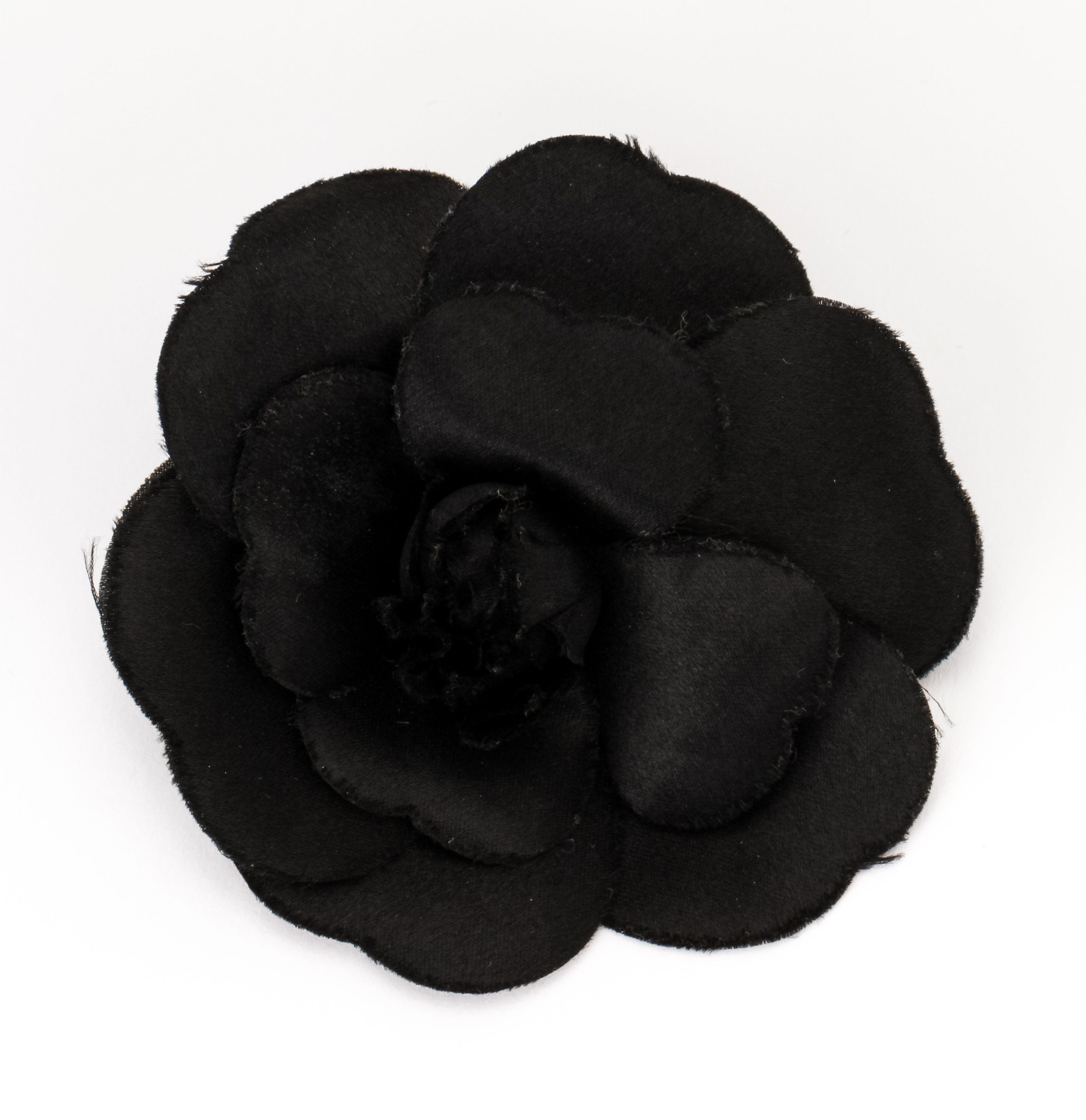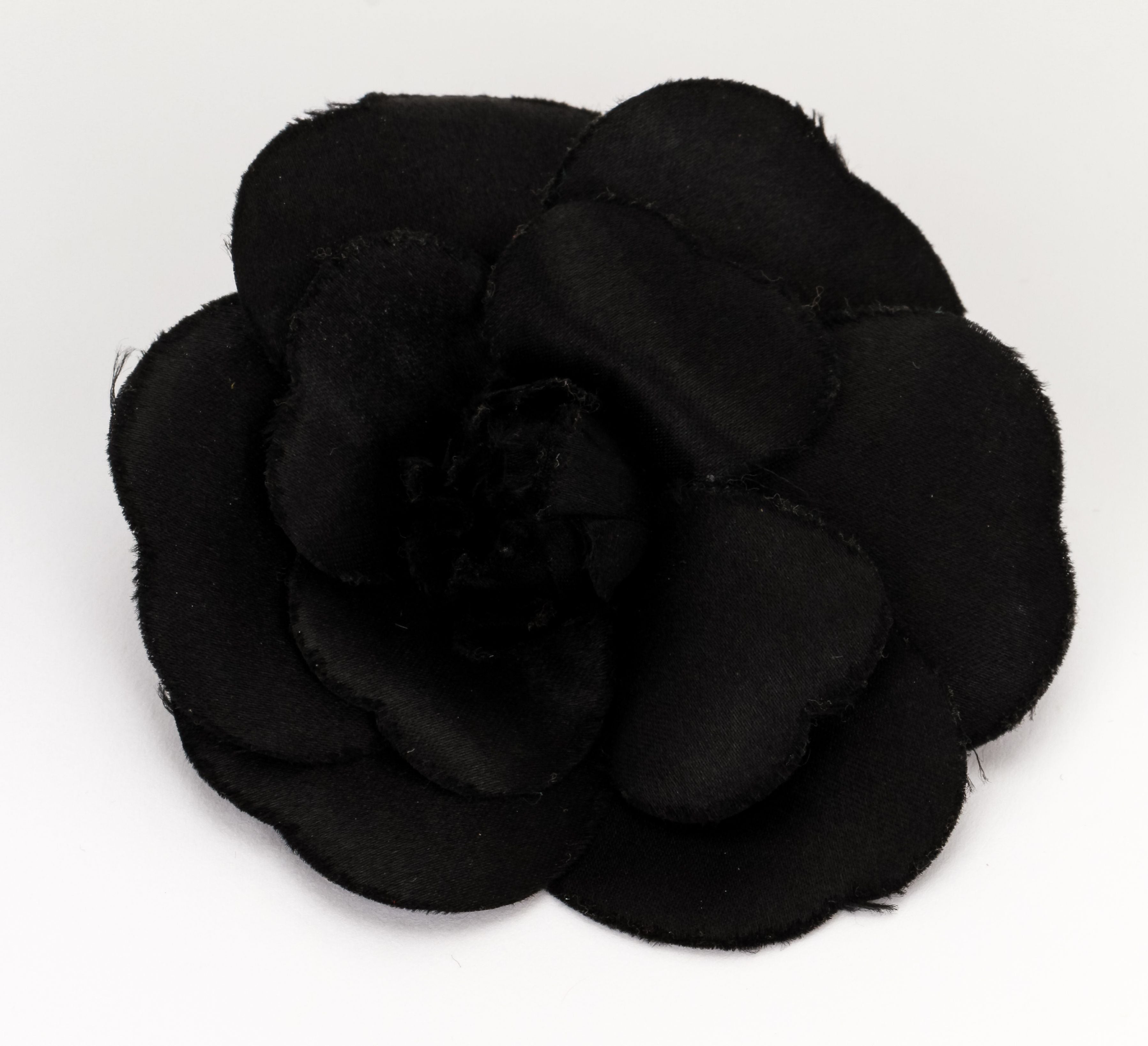 Chanel large black fabric camellia brooch, 3" diam. Comes with original pouch.