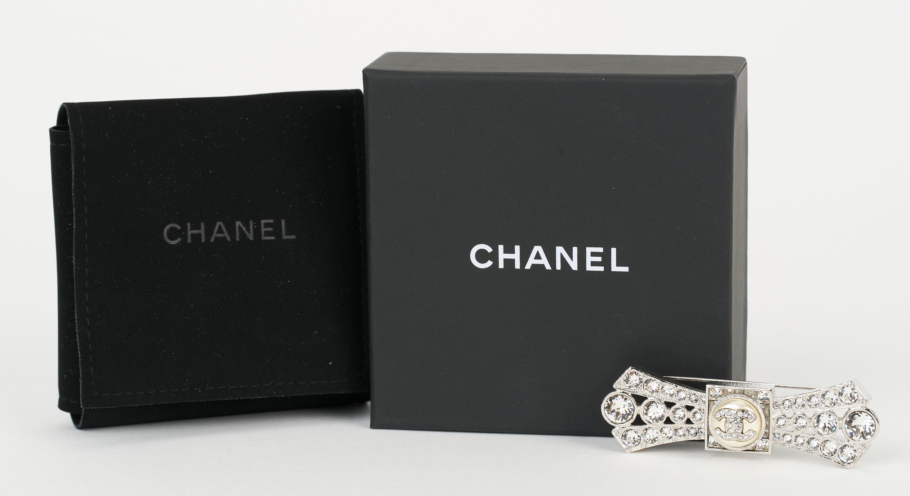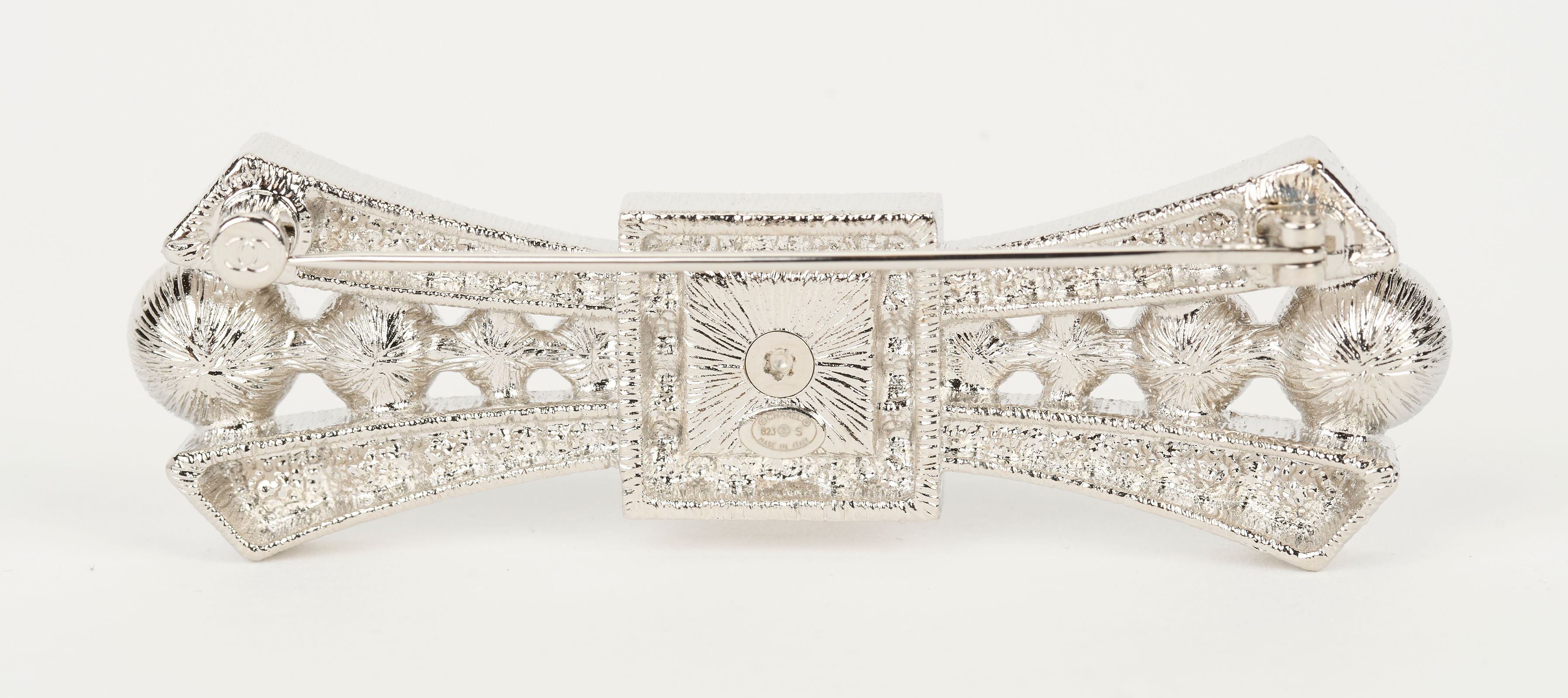 Chanel new in box silver bow pin with center gripoix pearl beads and rhinestones. Brand new unused condition. Spring summer 2023 collection.