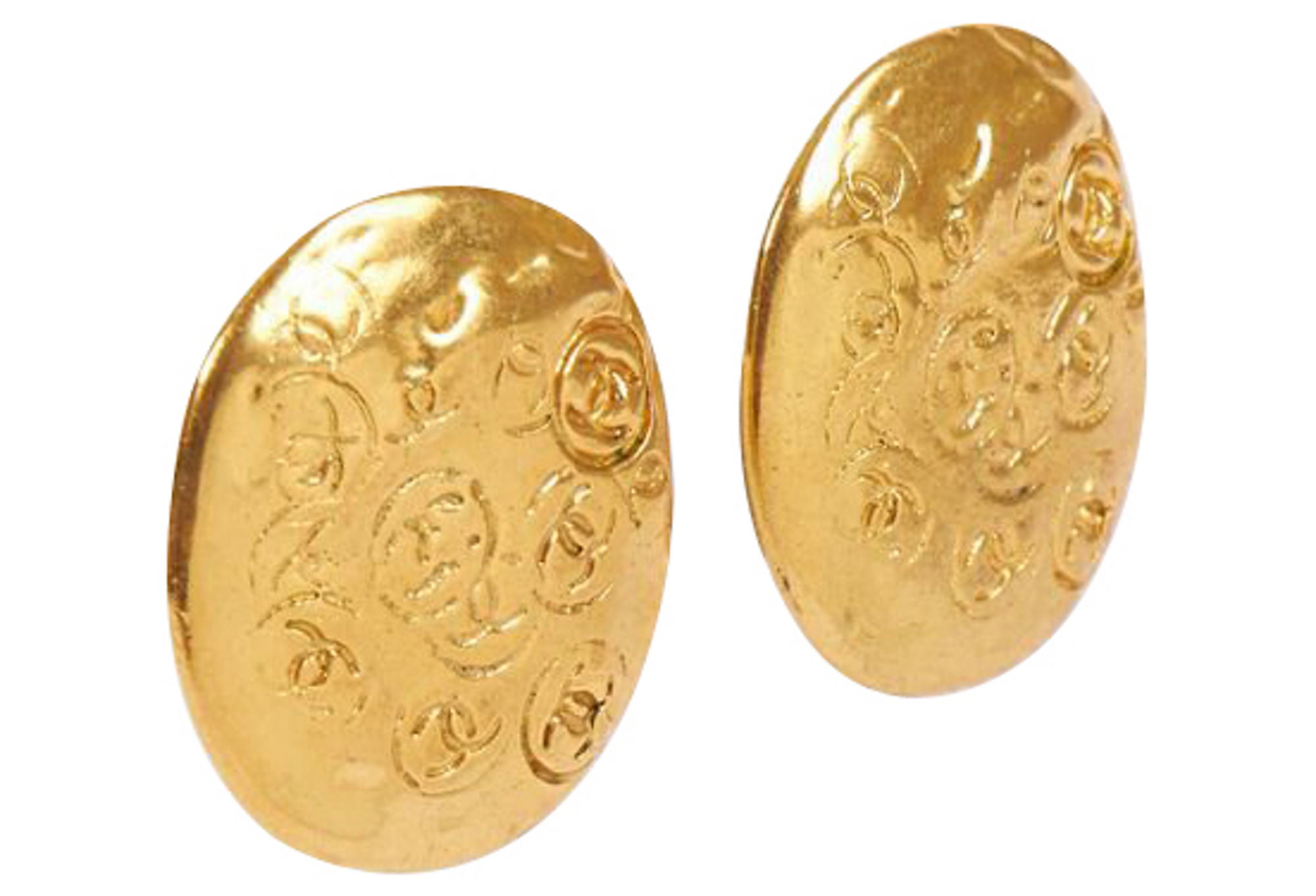 Chanel oval embossed goldtone metal clip-back earrings. Spring '93 collection. Original box or pouch included. Minor wear.