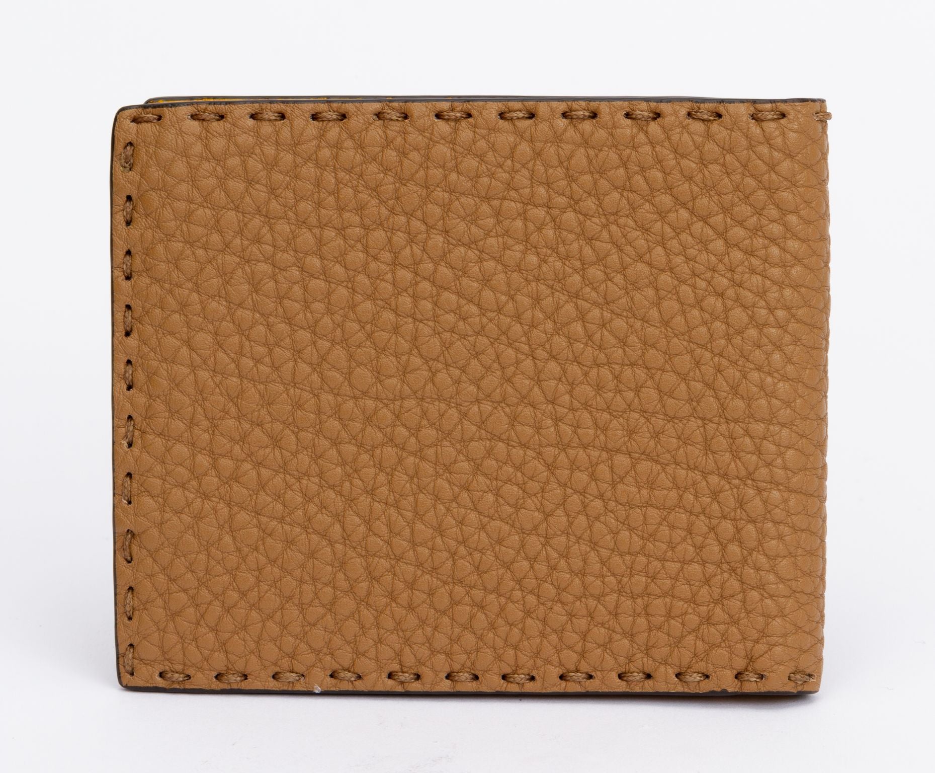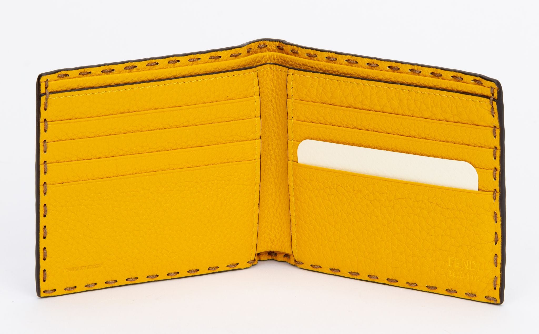 Fendi Selleria bifold wallet made of leather. The outside is brown and the edges of the wallet are stitched. The inside is yellow and comes with 6 card holders as well as a department for money. The piece is new and comes with a tag, original box and dust cover.