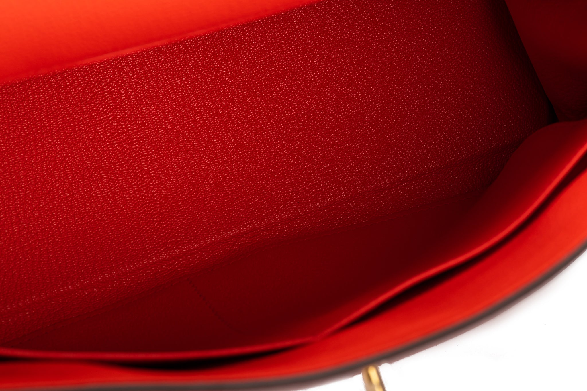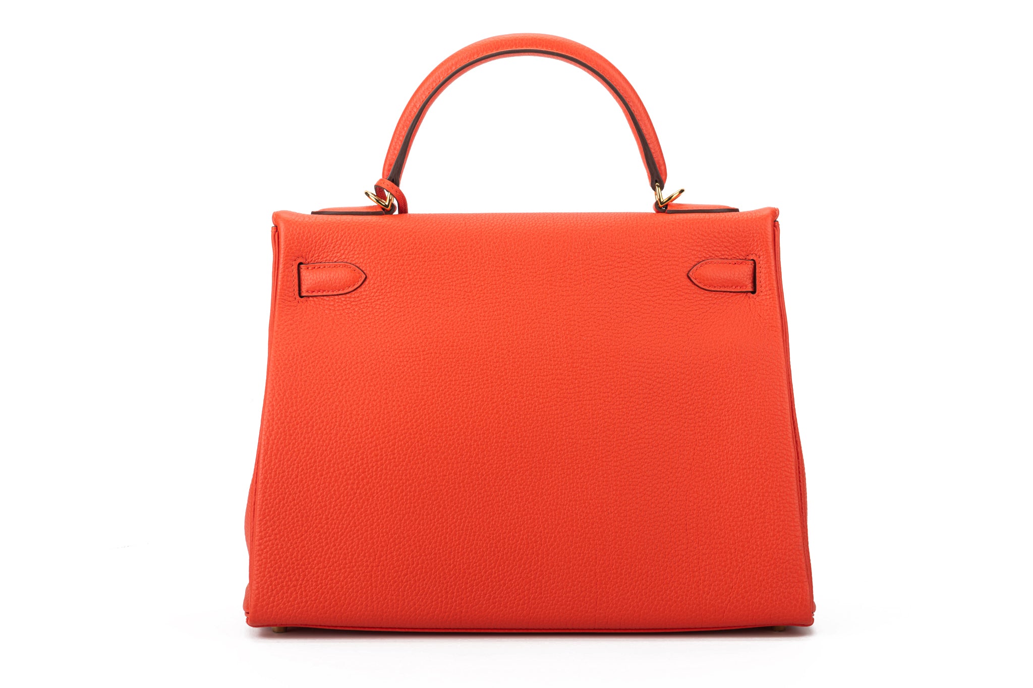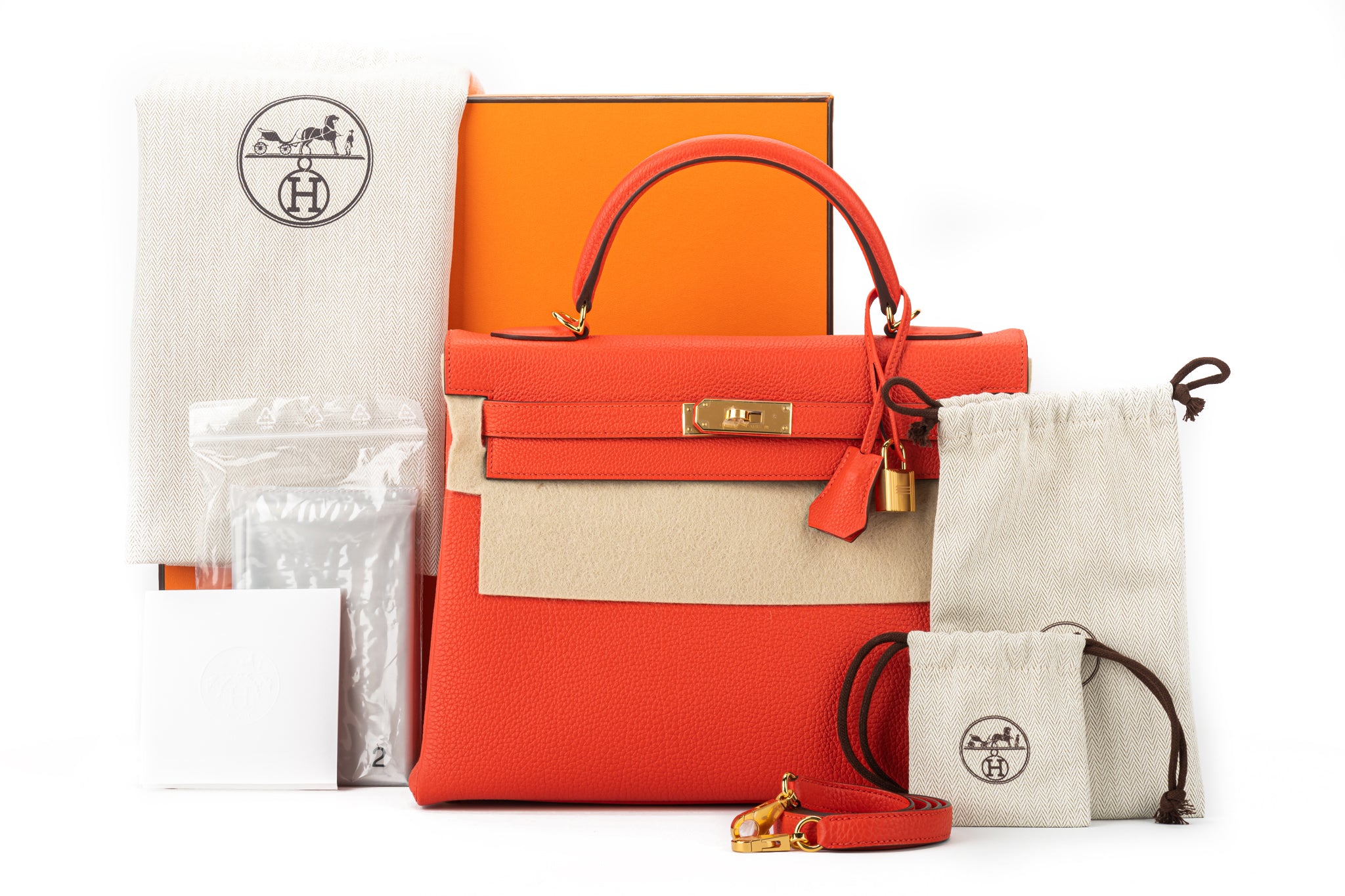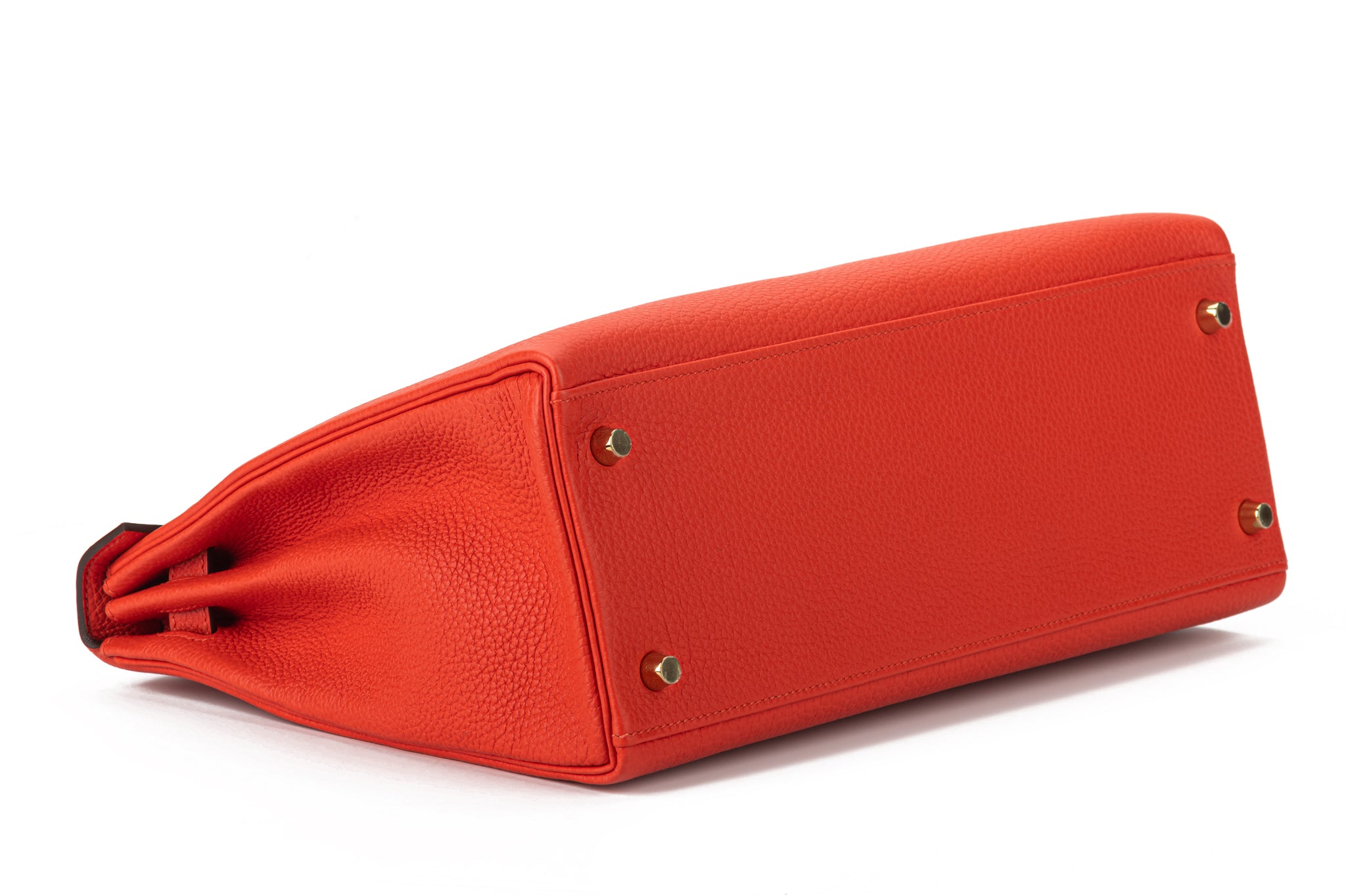 Hermès Kelly retourne 32cm in capucine togo leather and gold tone hardware. Handle drop, 3.5"L. Strap, 35"L. Letter Z for 2021. Brand new in box. Comes with strap, clochette, tirette, lock, keys, booklet, rain jacket, dust bag, original box.